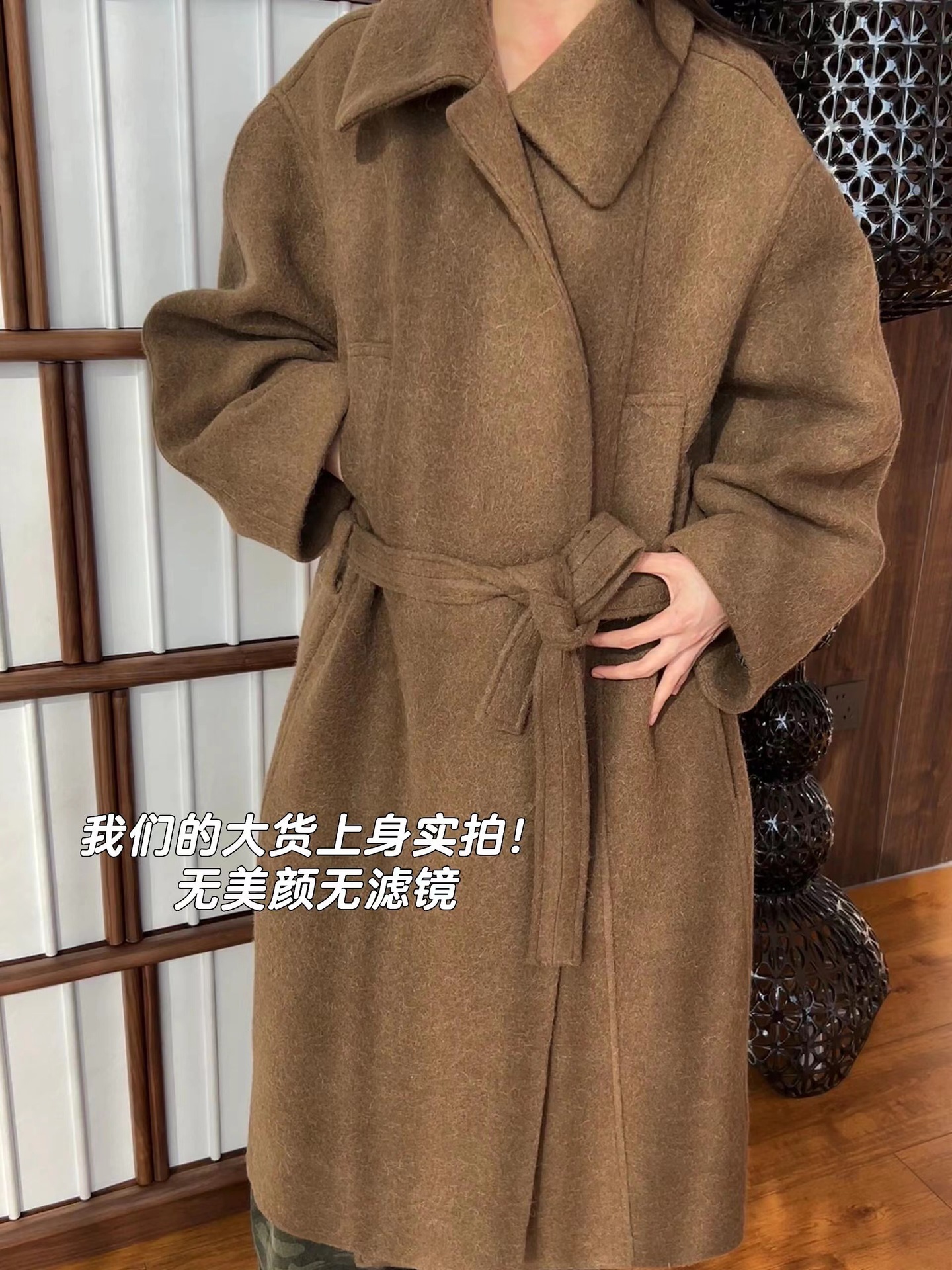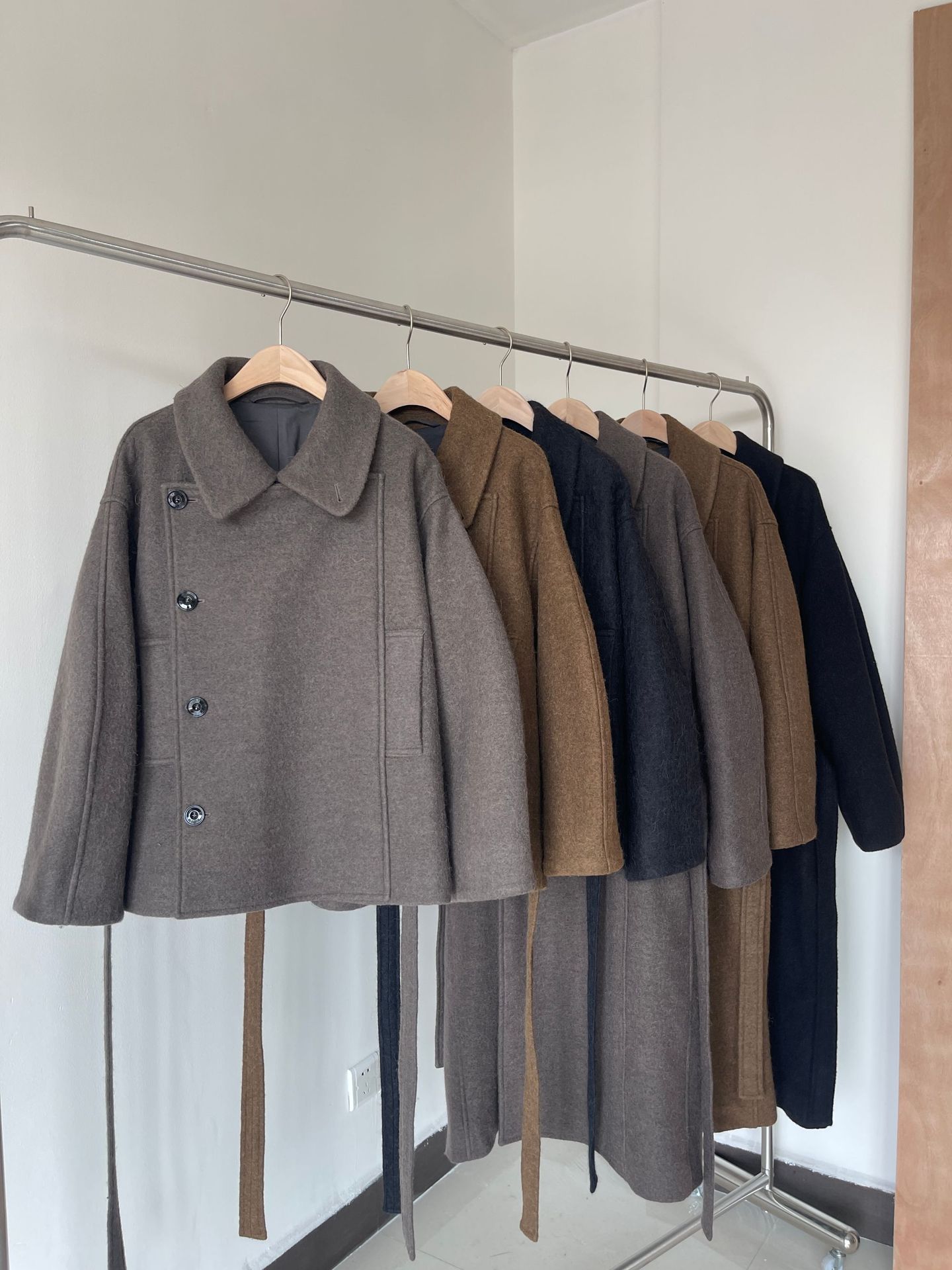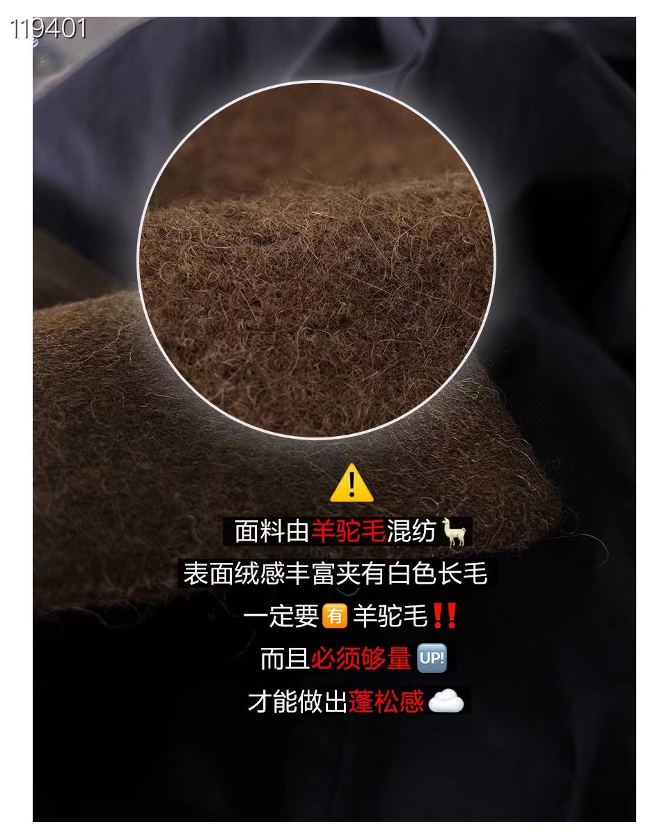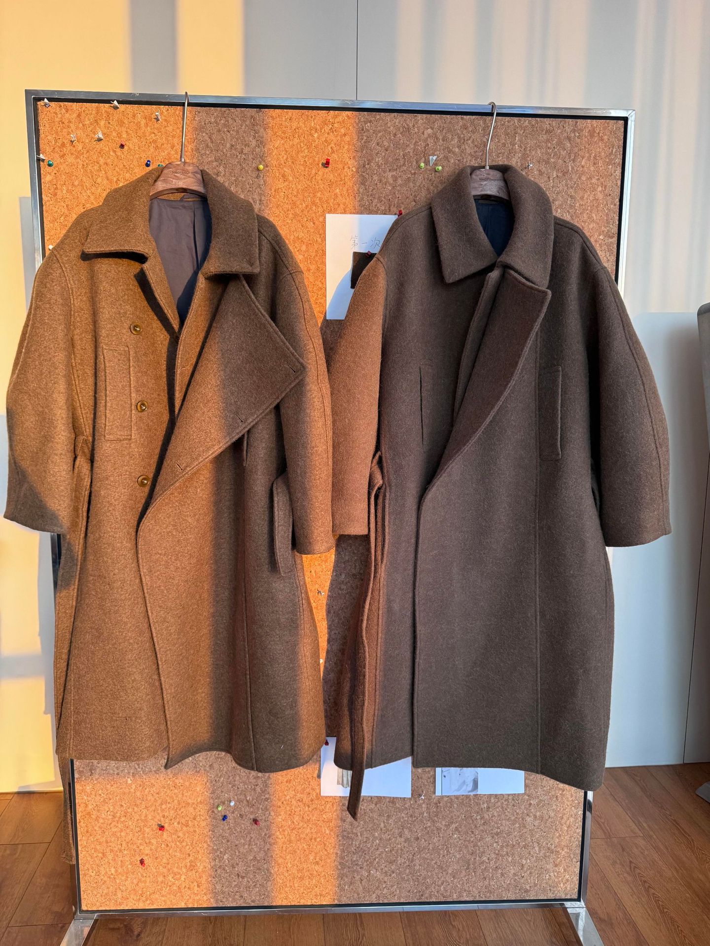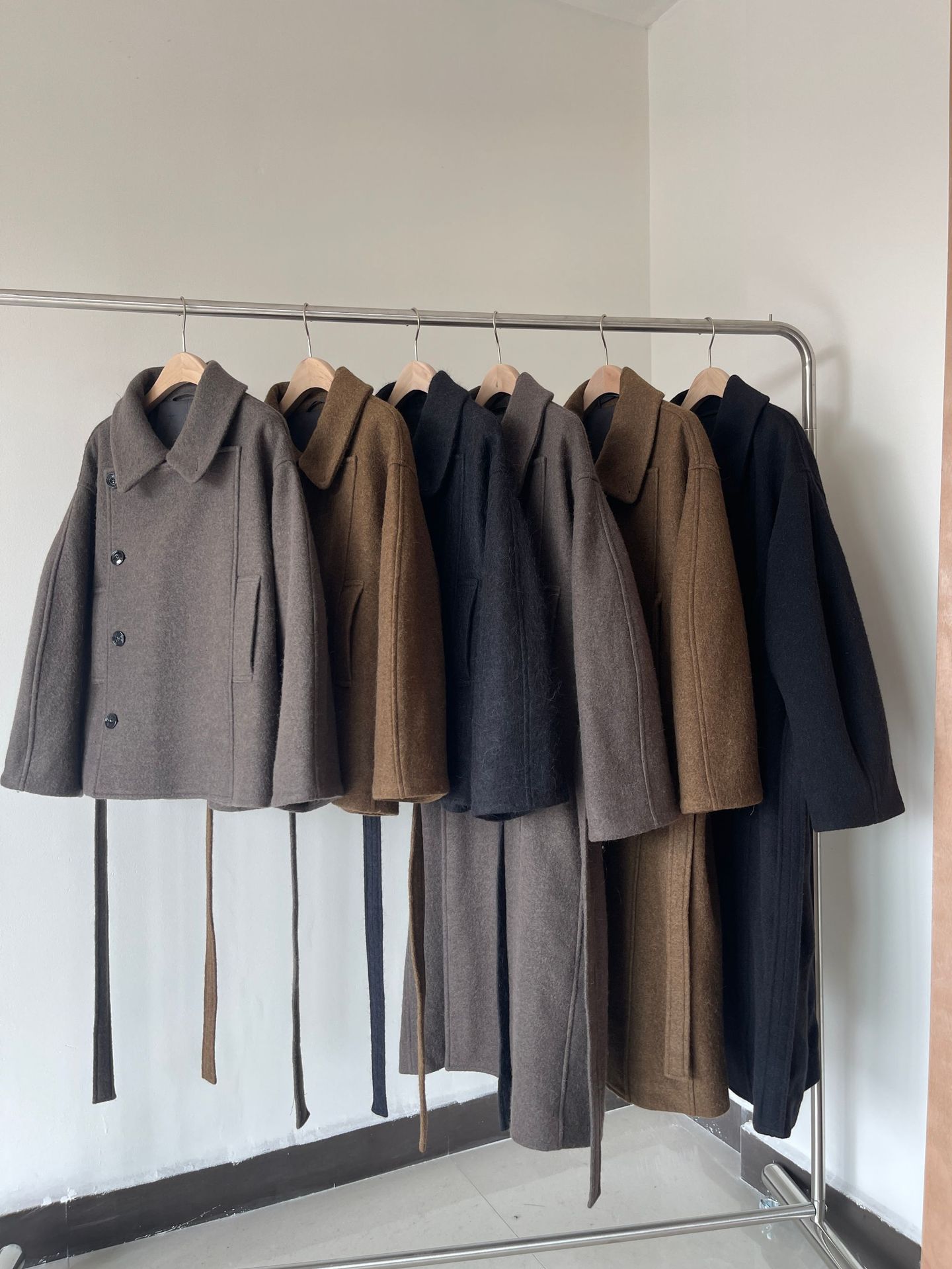 Коричневый длинный стиль (индивидуальный заказ тяжелого веса); Короткий стиль коричневого цвета (50% альпака + 50% шерсть); Черный короткий фасон (50% альпака + 50% австралийская шерсть); Новый цвет: хаки серо-зеленый (50% альпака + 50% шерсть); Новый цвет: хаки, серо-зеленый, удлиненный фасон (50% альпака + 50% шерсть); Черное длинное пальто (50% шерсть альпаки + 50% австралийская шерсть)