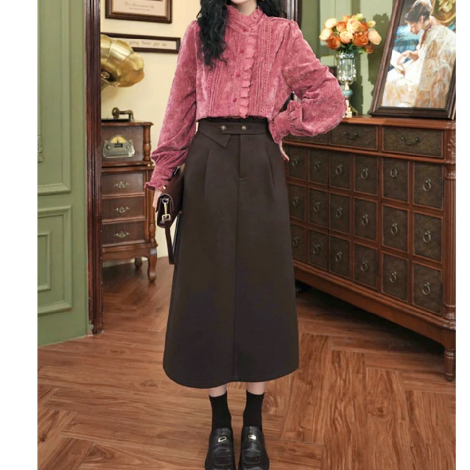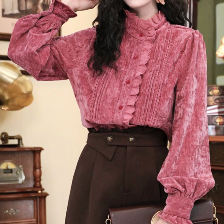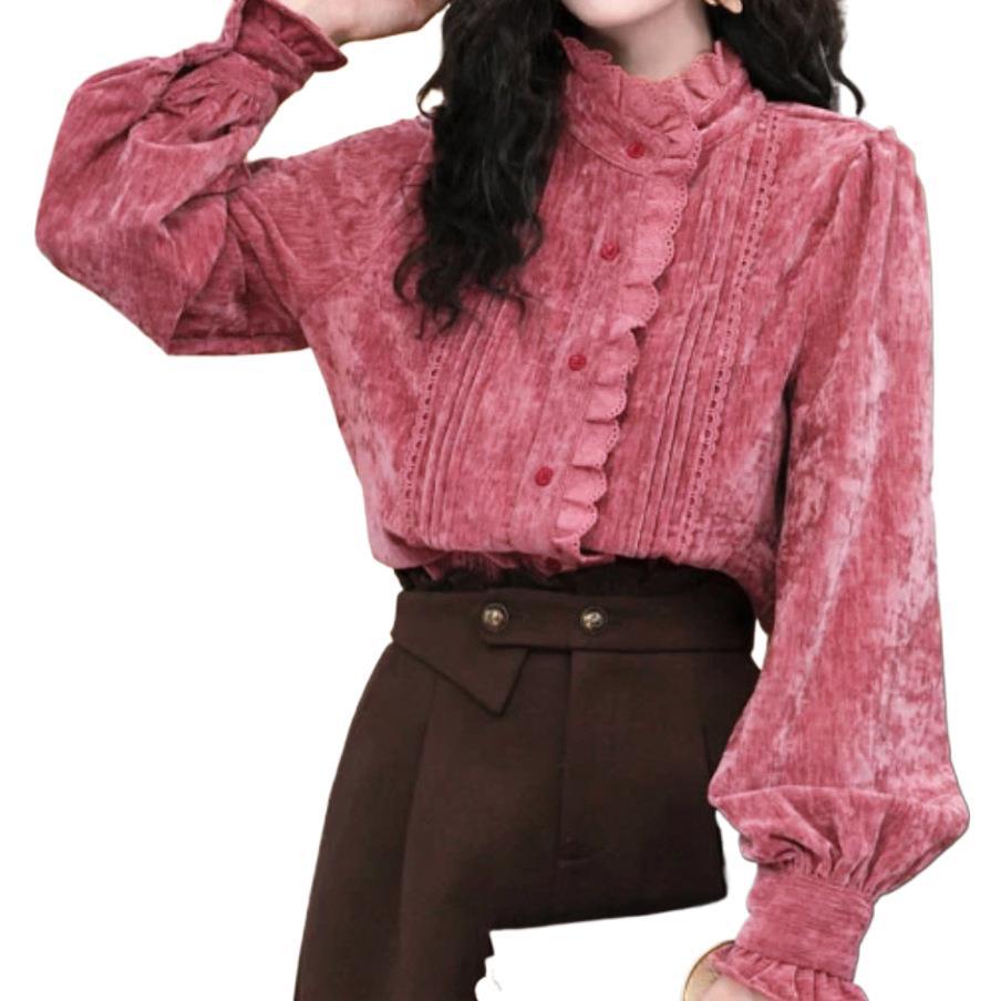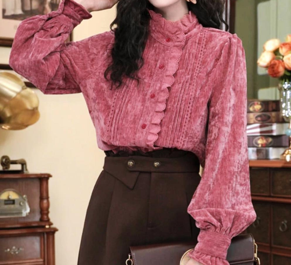 Тонкий темперамент с длинными рукавами моды ретро осенняя и зимняя рубашка румяна другие рукава принцессы