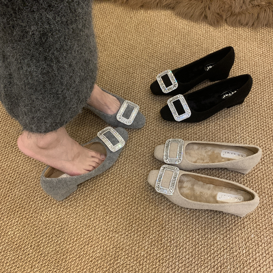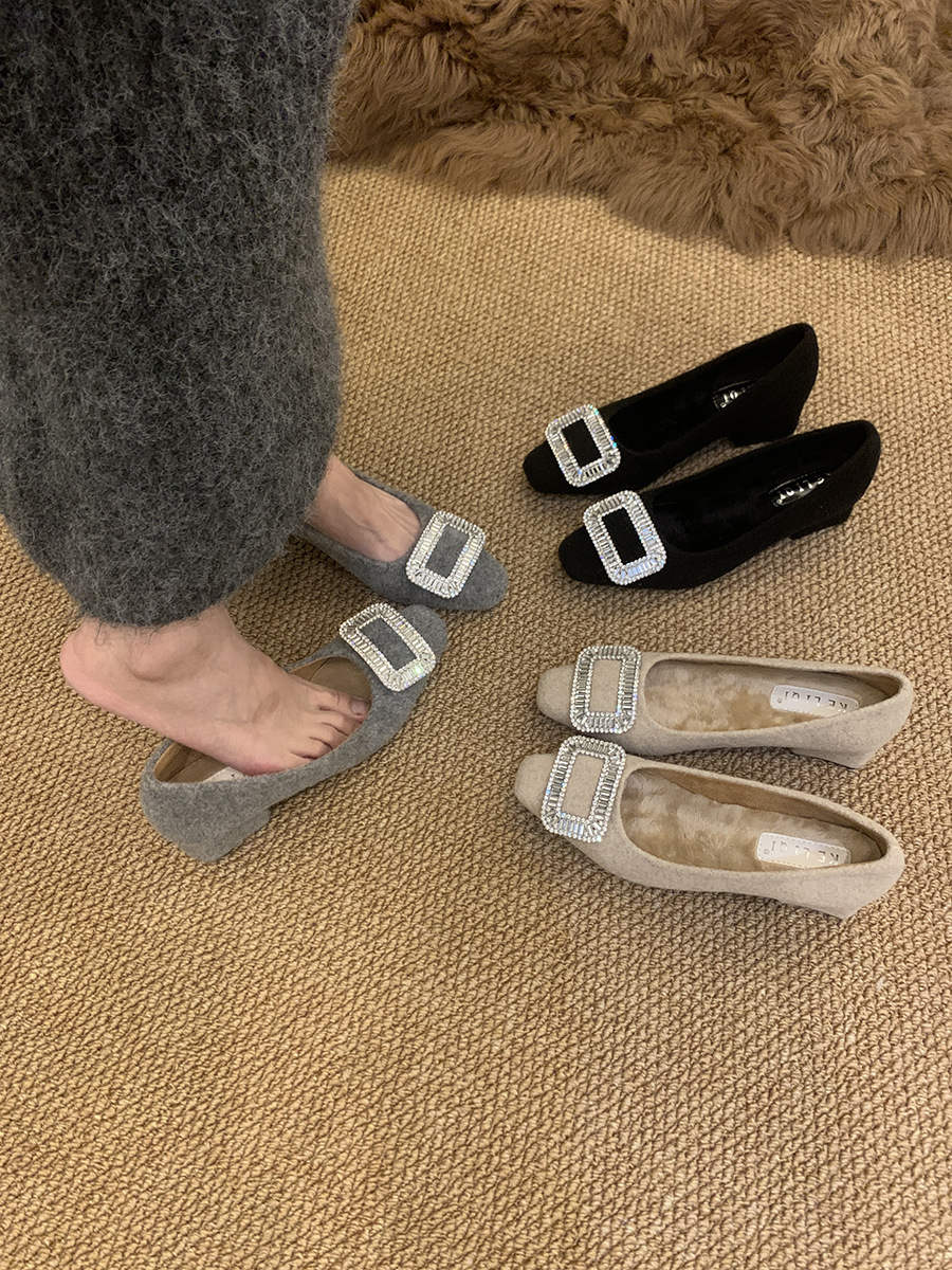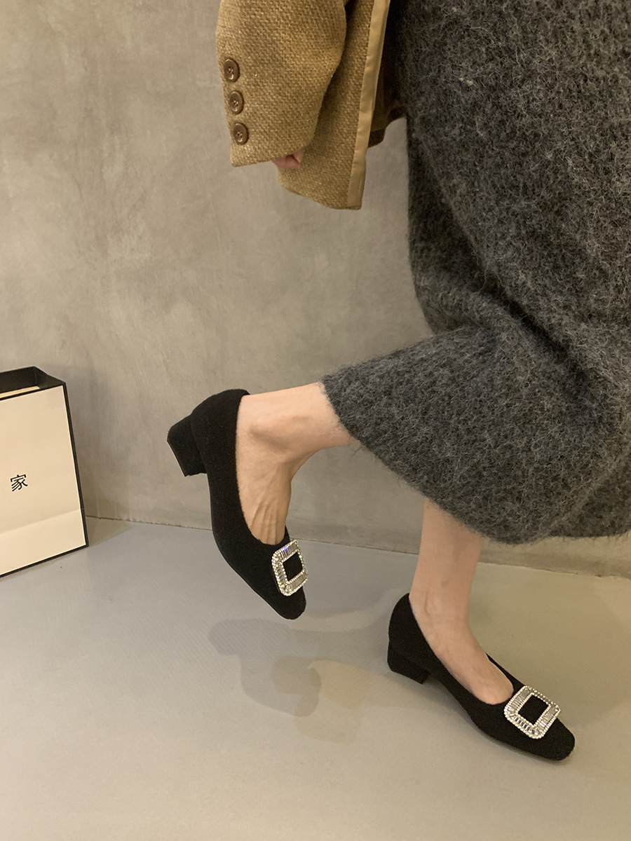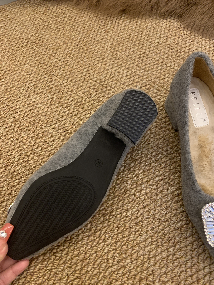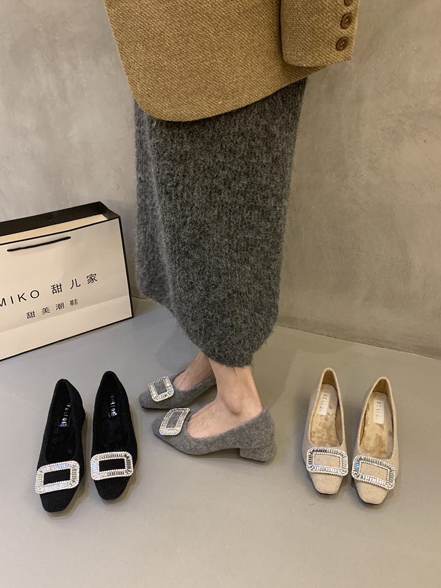 Толстые каблуки квадратные стразы одиночные туфли женские туфли 2024 новые осенние и зимние плюшевые меховые туфли французские темпераментные туфли