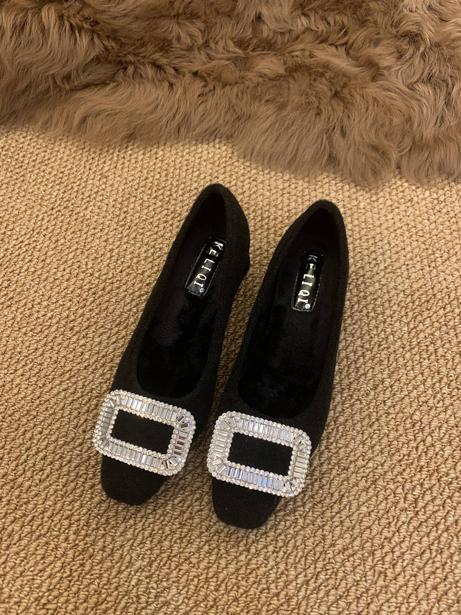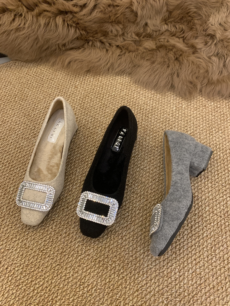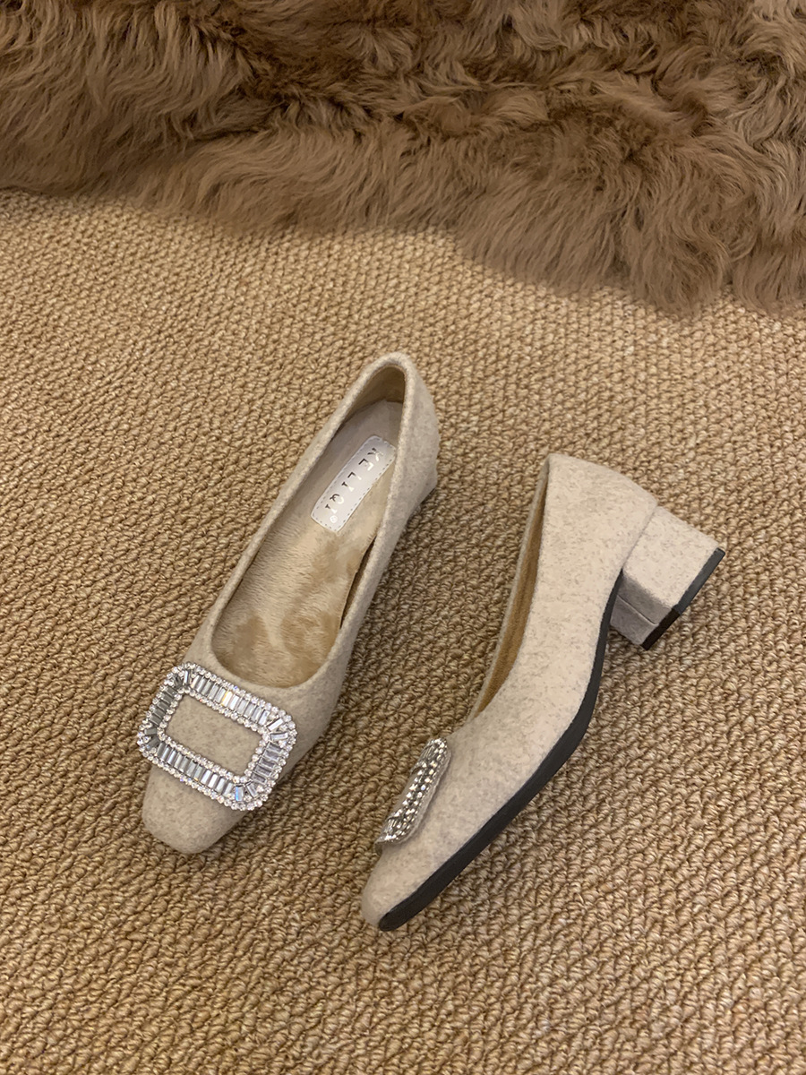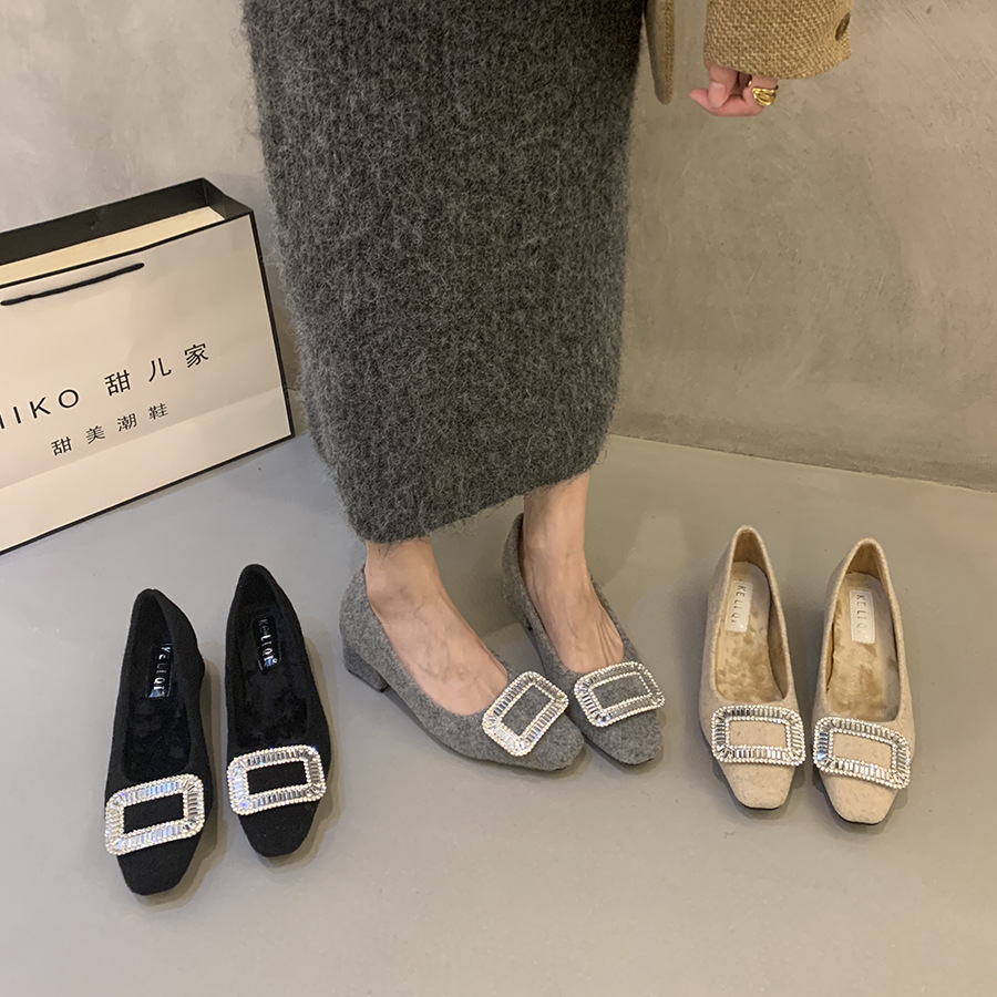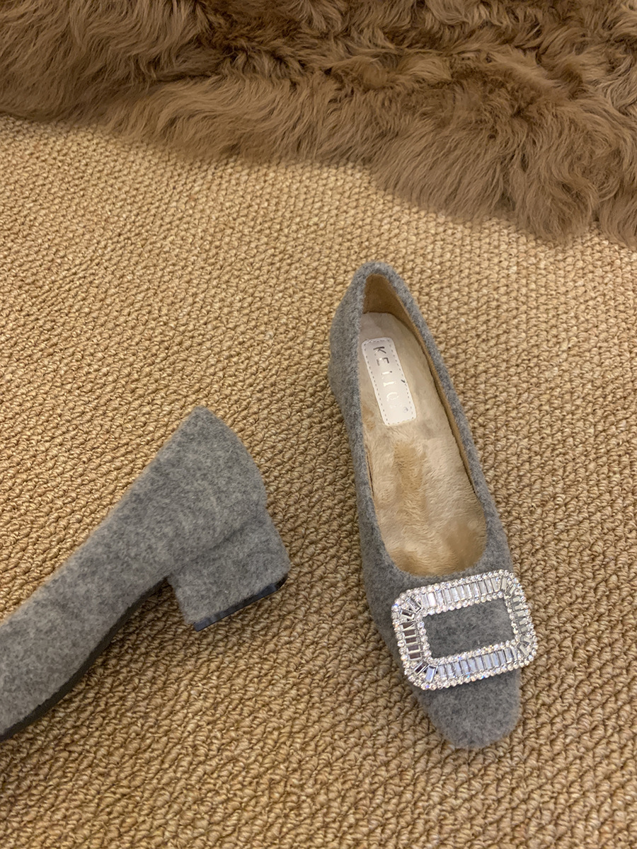 Толстые каблуки квадратные стразы одиночные туфли женские туфли 2024 новые осенние и зимние плюшевые меховые туфли французские темпераментные туфли