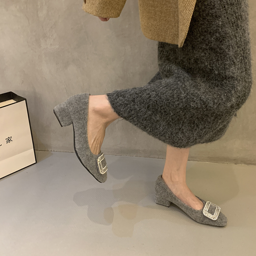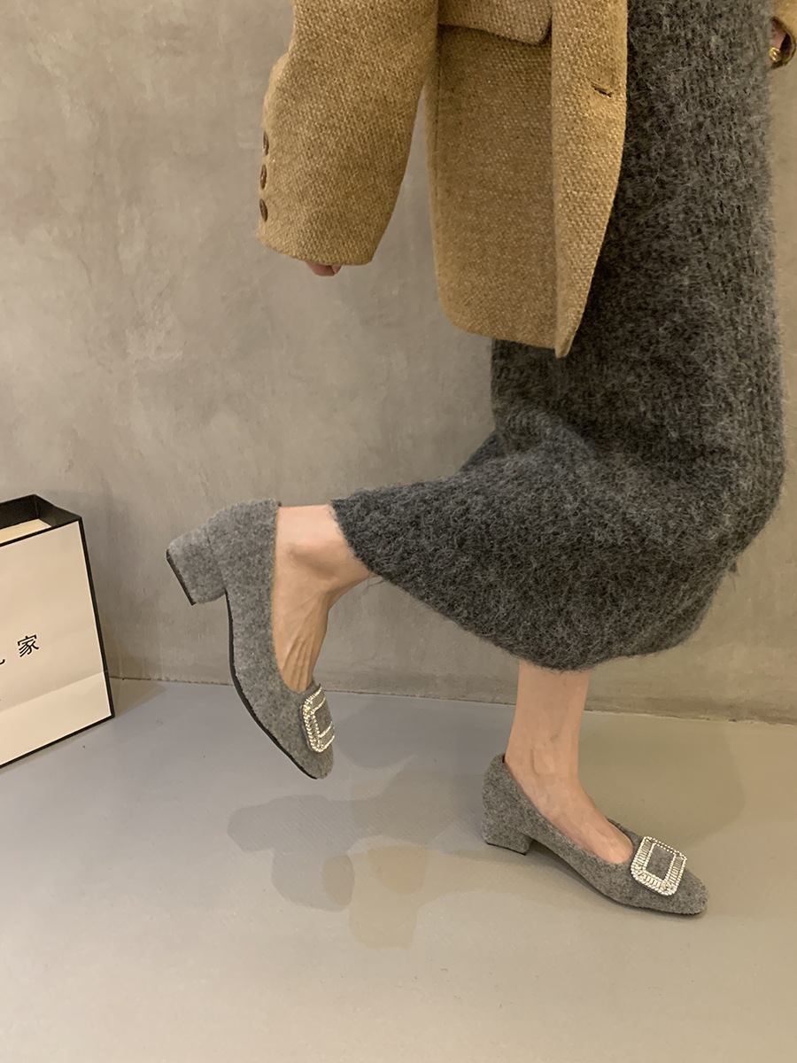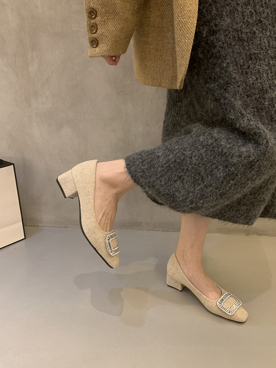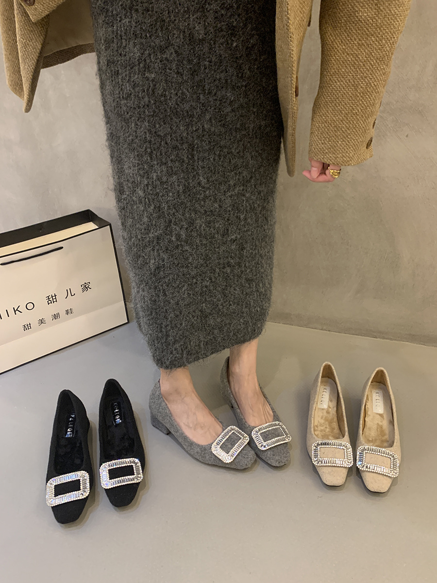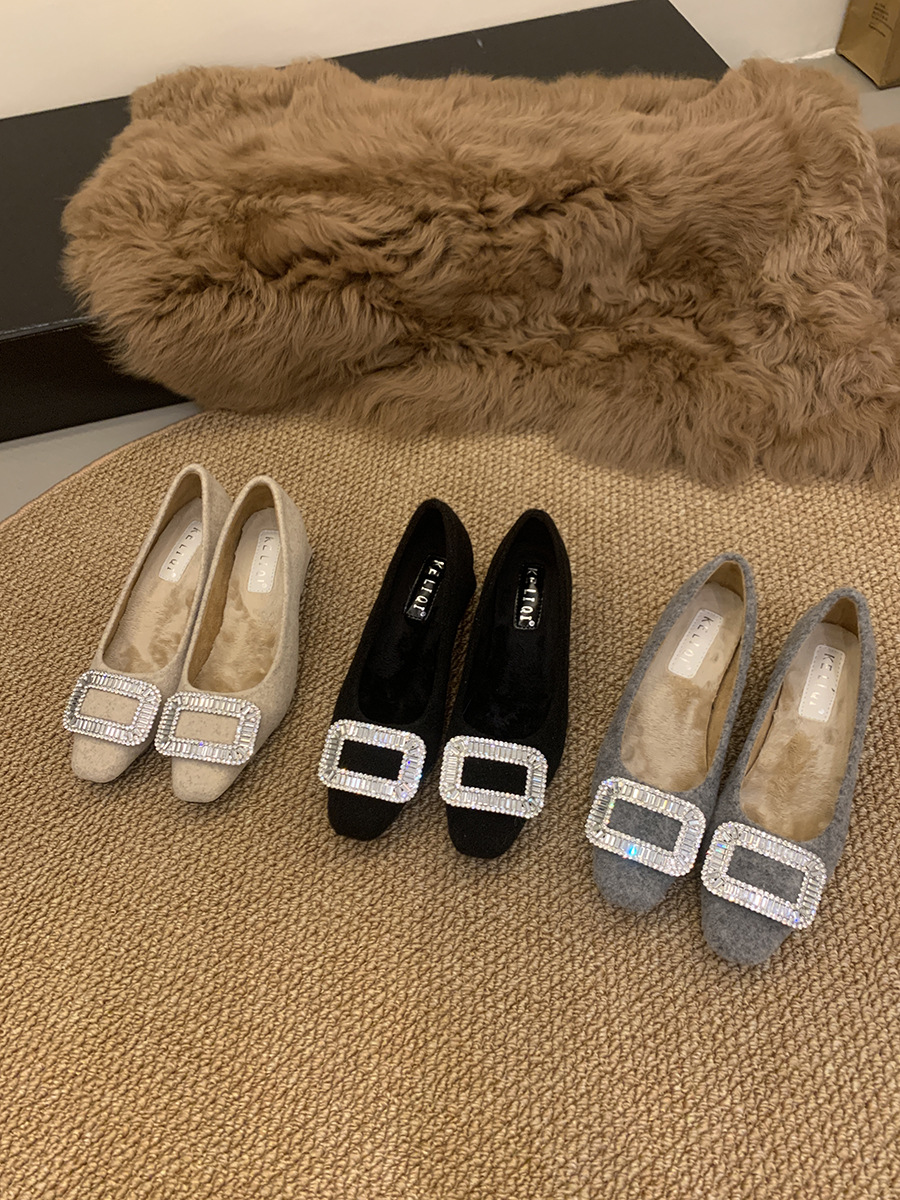 Толстые каблуки квадратные стразы одиночные туфли женские туфли 2024 новые осенние и зимние плюшевые меховые туфли французские темпераментные туфли