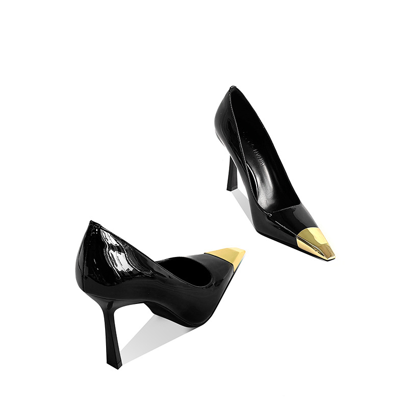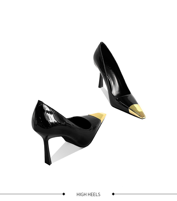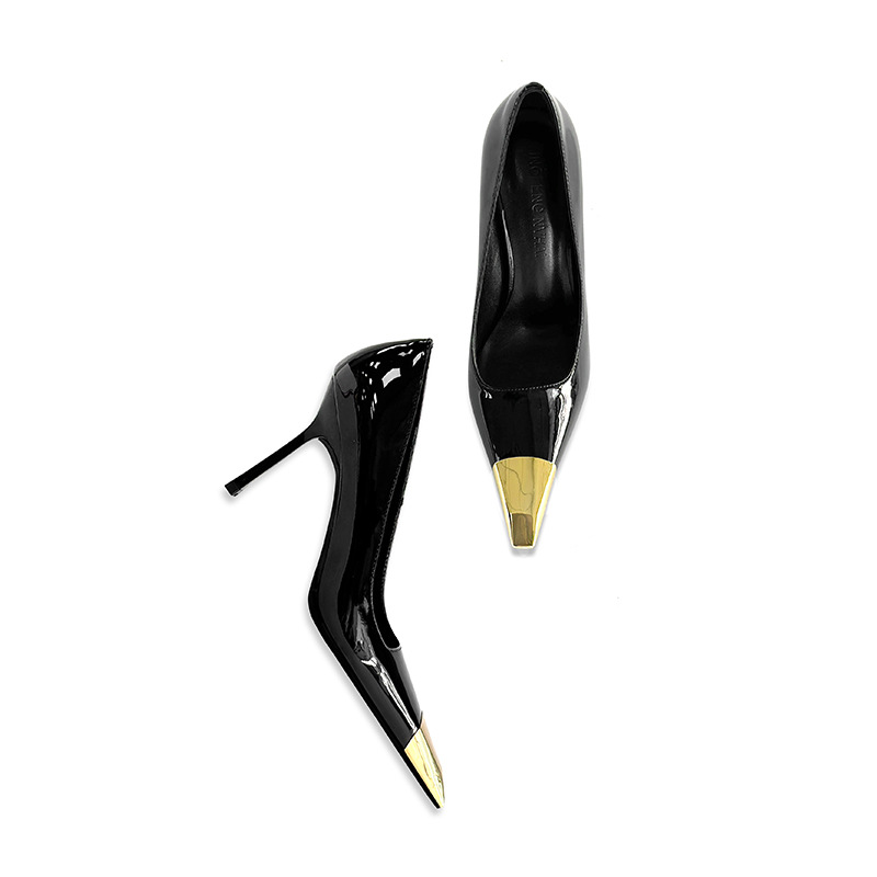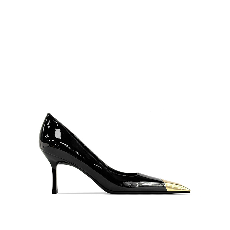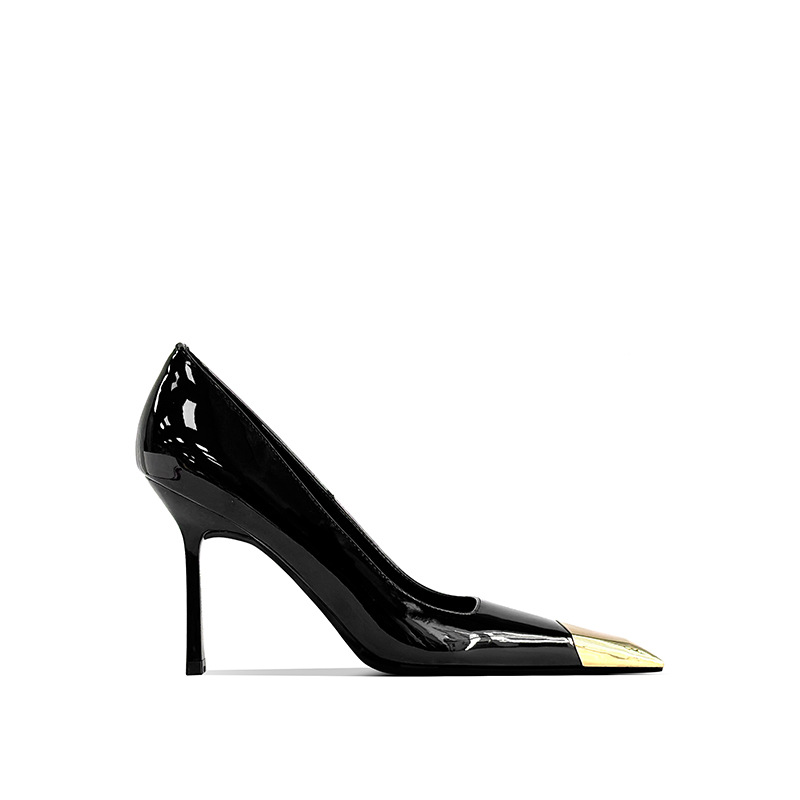 В наличии: женские туфли на шпильке в стиле Ян Шулина, с металлическим квадратным носком, сексуальные, черные, из лакированной кожи, с металлическим носком.