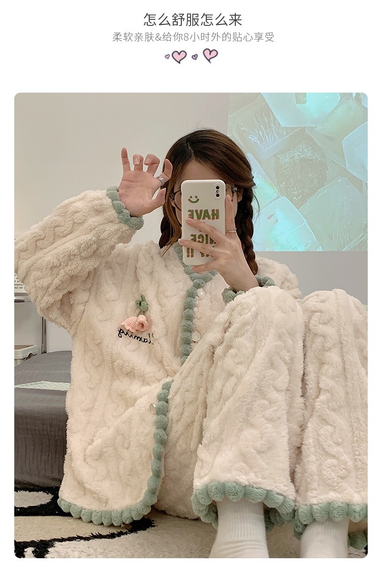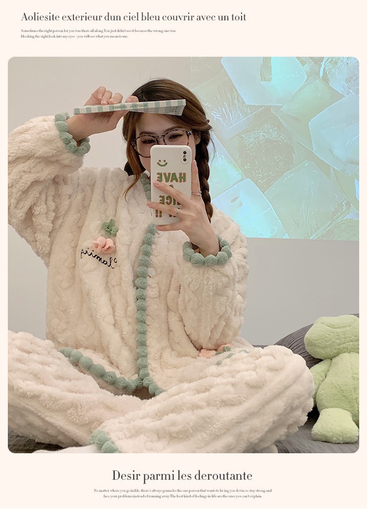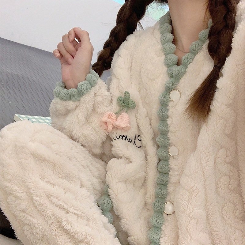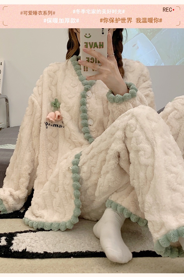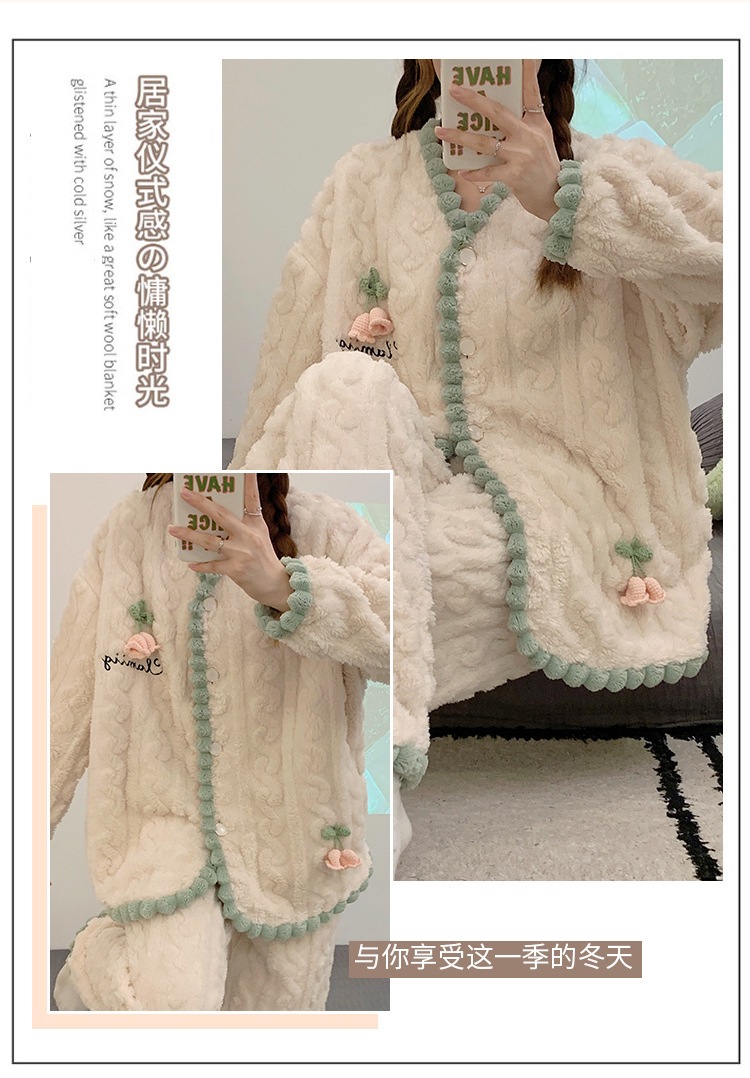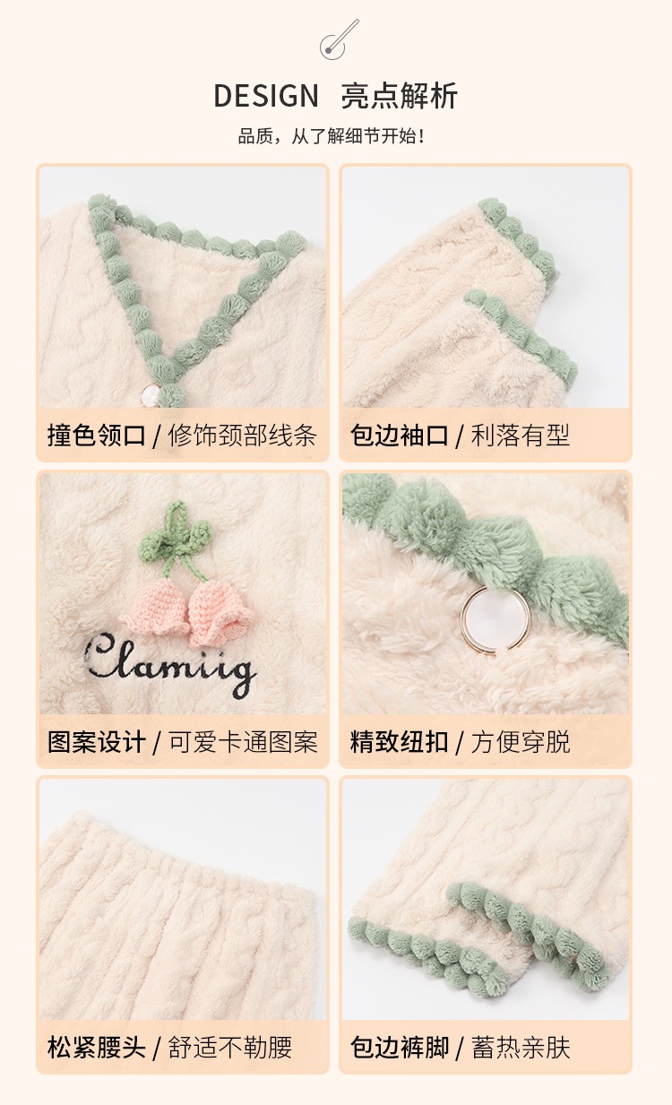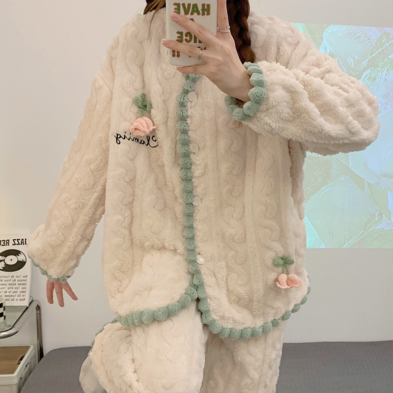 Пижама женская осенняя и зимняя высокая стоимость жаккардовый кардиган корейская версия мультяшного кораллового бархата теплая бархатная толстая домашняя одежда