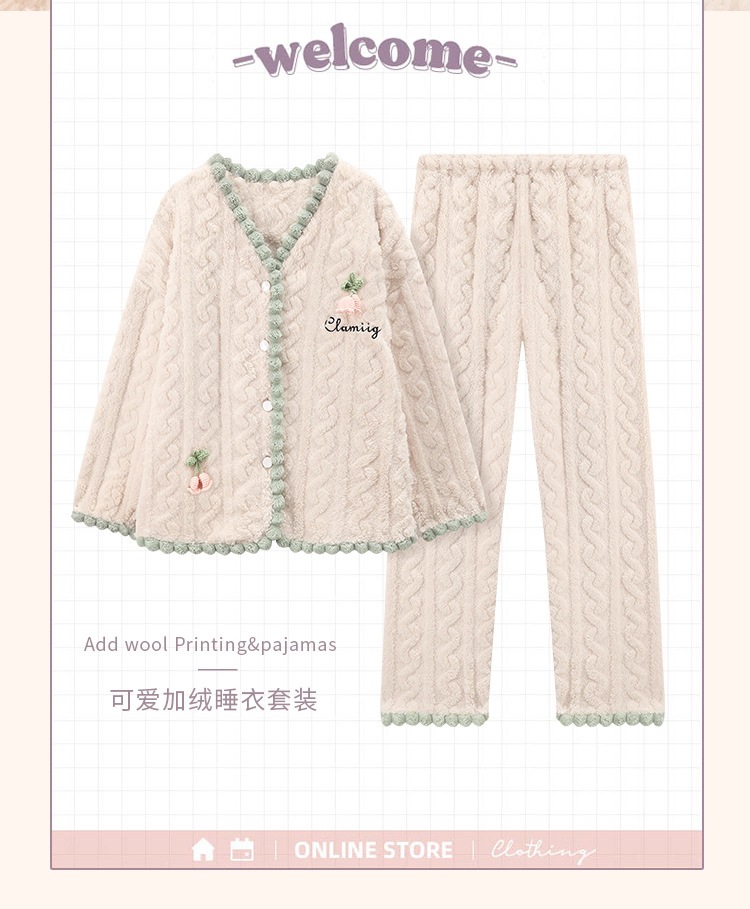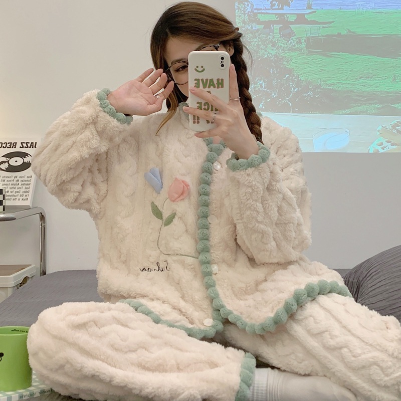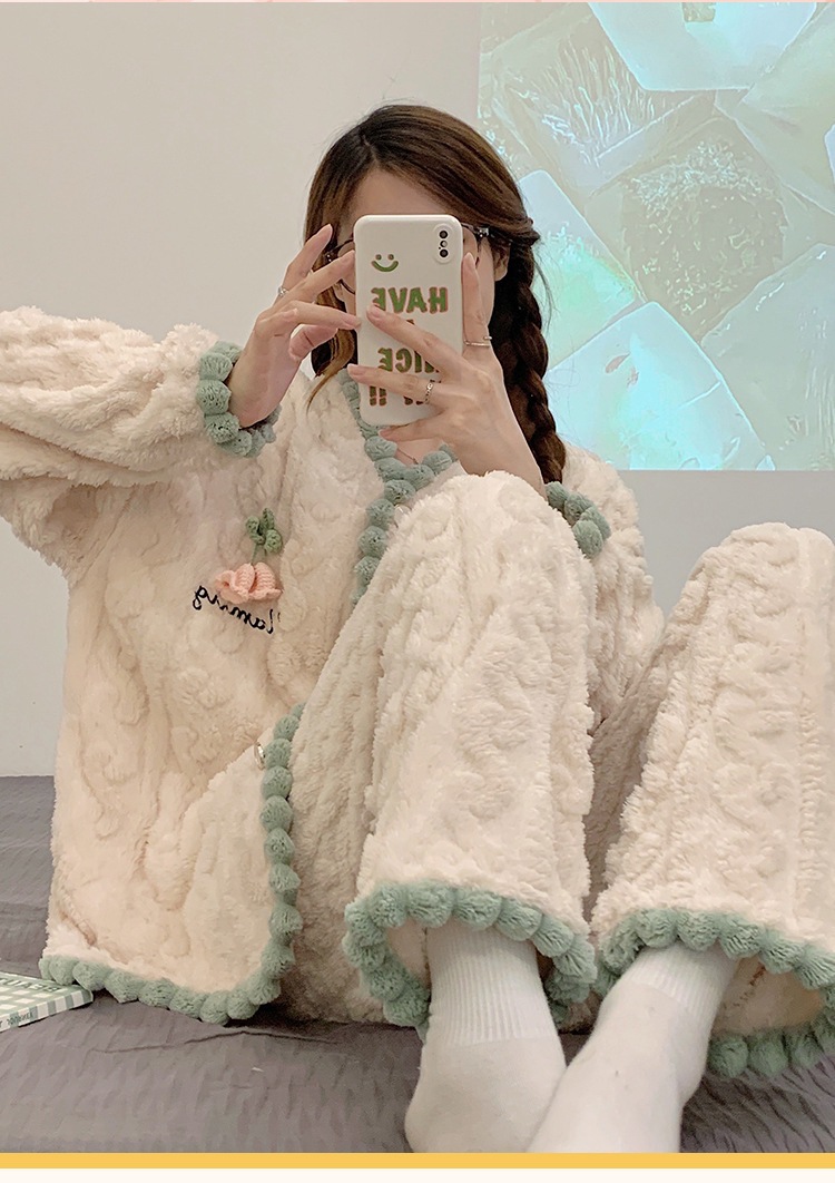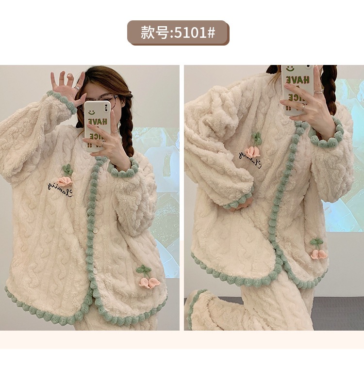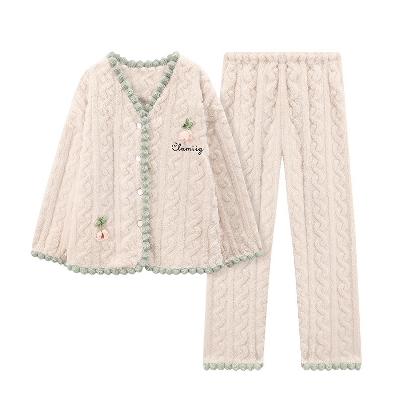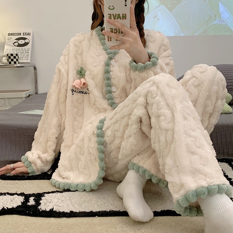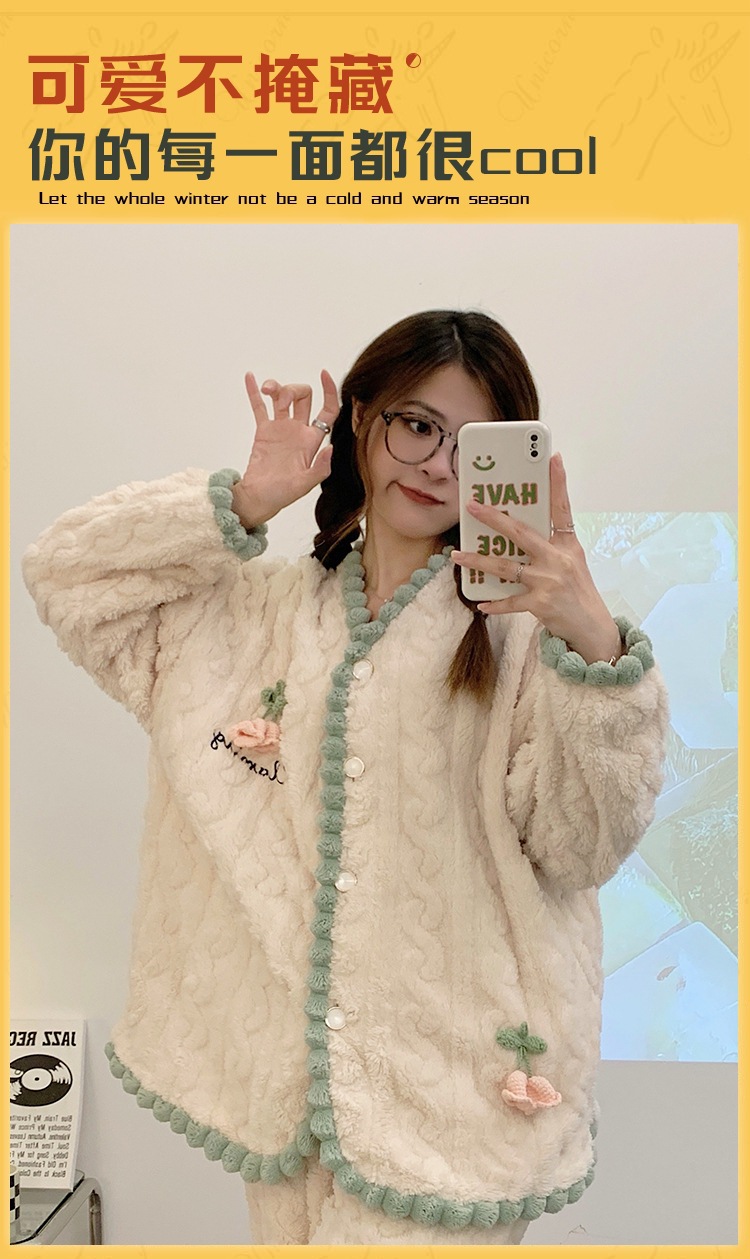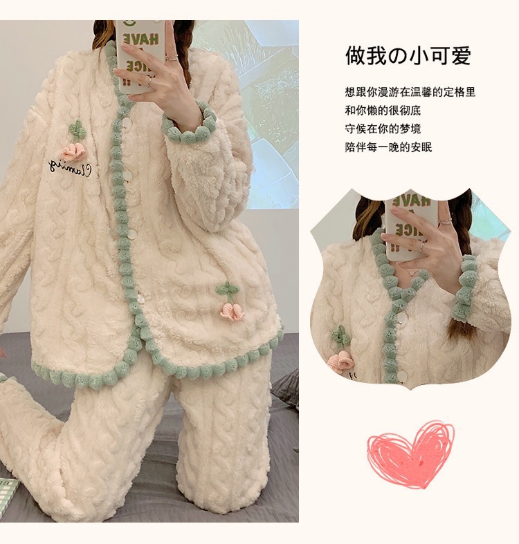 Пижама женская осенняя и зимняя высокая стоимость жаккардовый кардиган корейская версия мультяшного кораллового бархата теплая бархатная толстая домашняя одежда