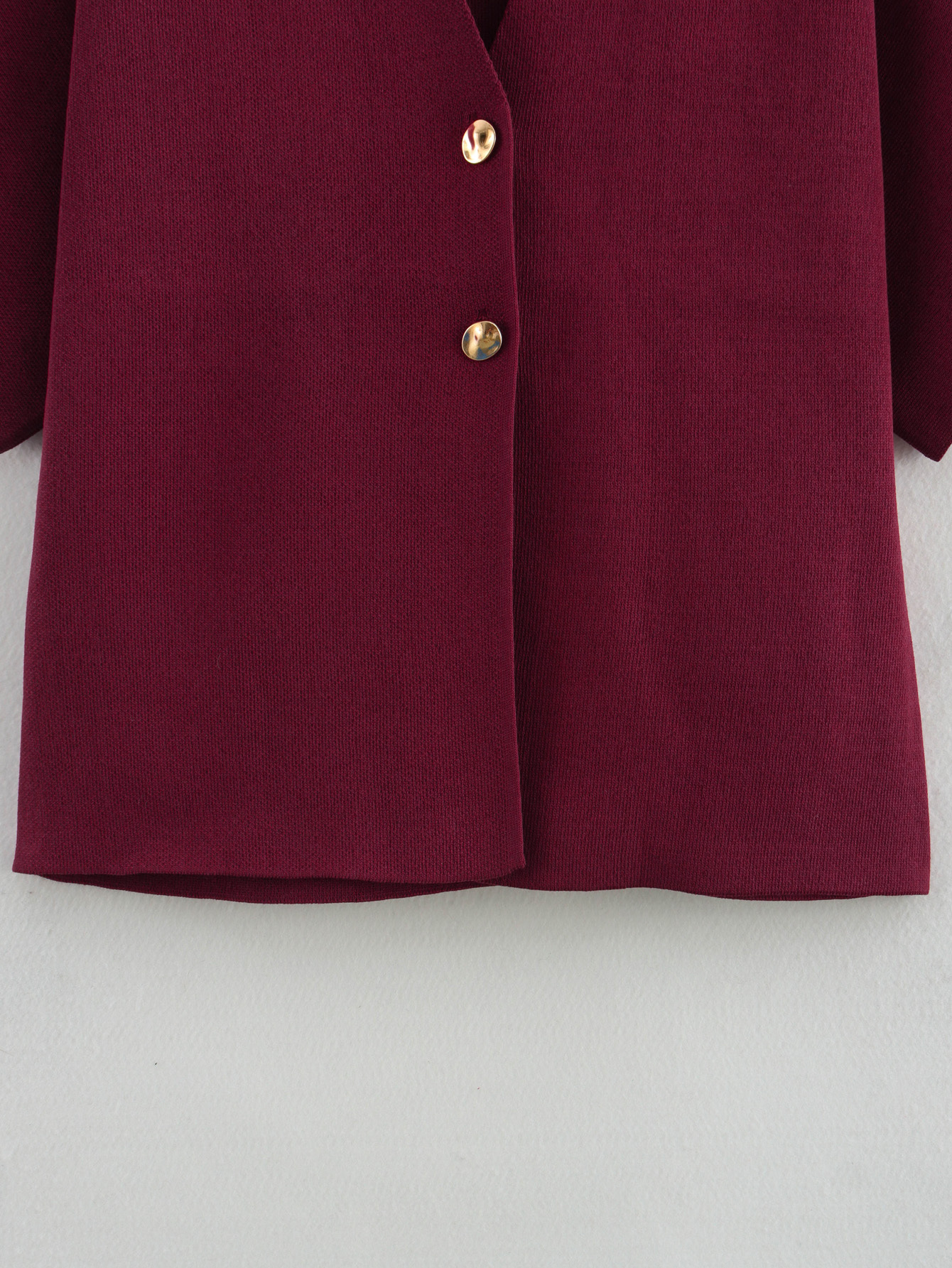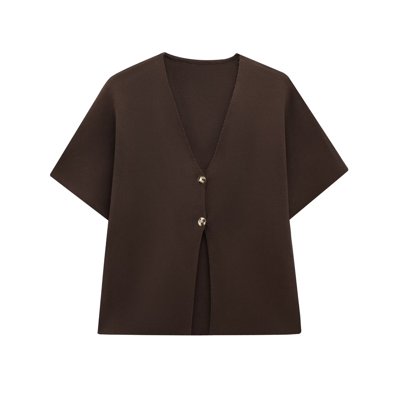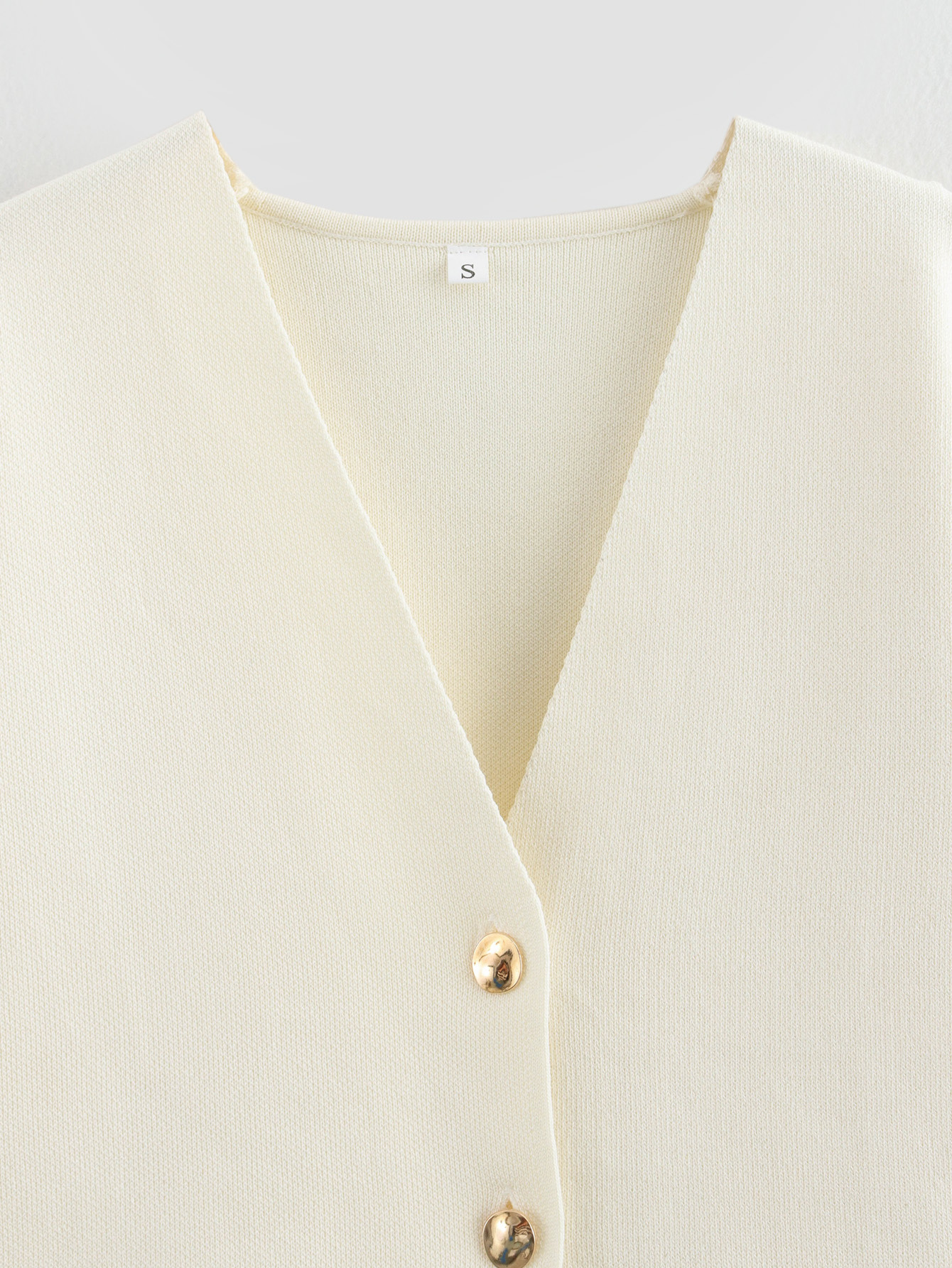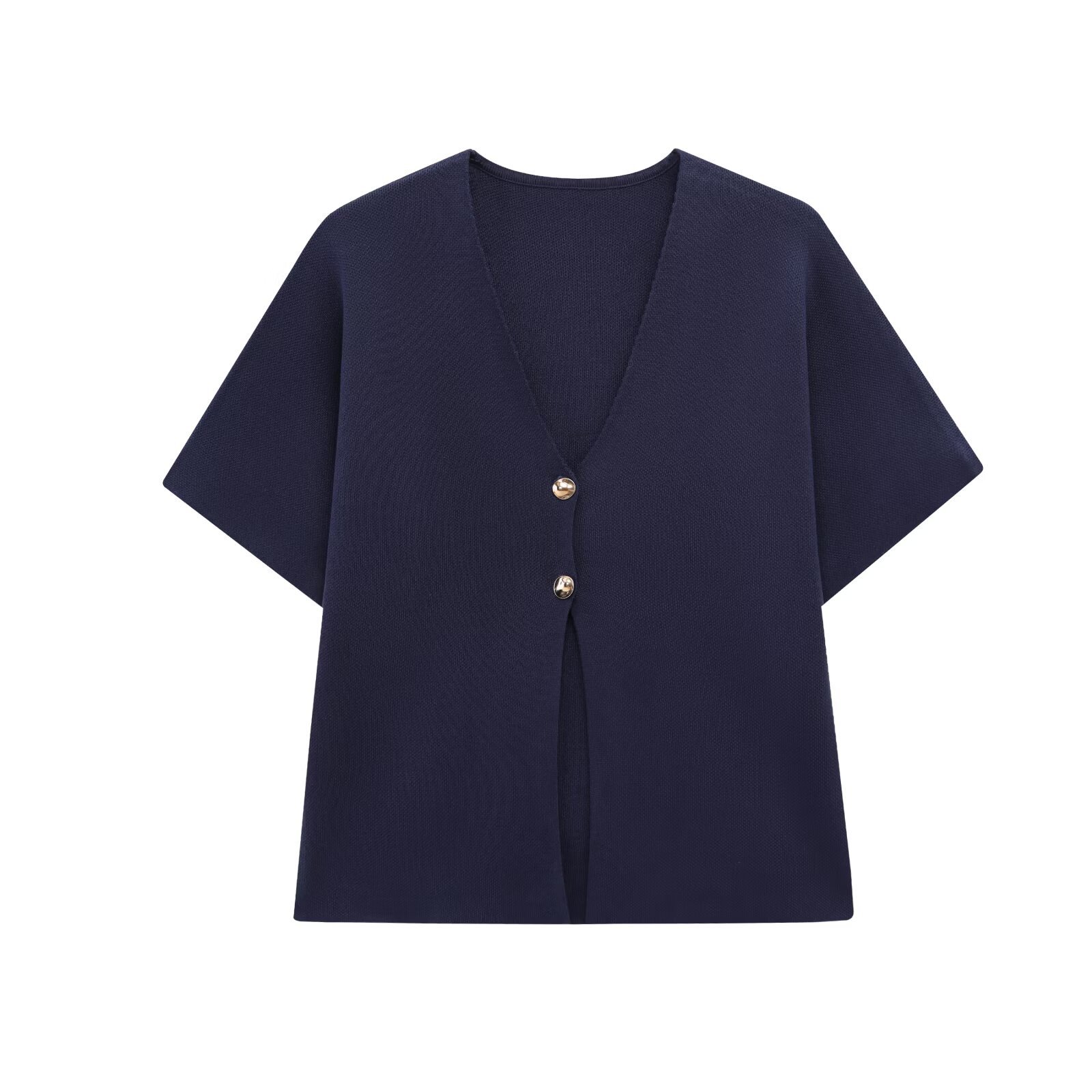 Оптовая продажа для внешней торговли: модный женский трикотаж с V-образным вырезом и золотыми пуговицами в европейском и американском стиле, лето 2025, короткий рукав, плоская вязка, модель D16110