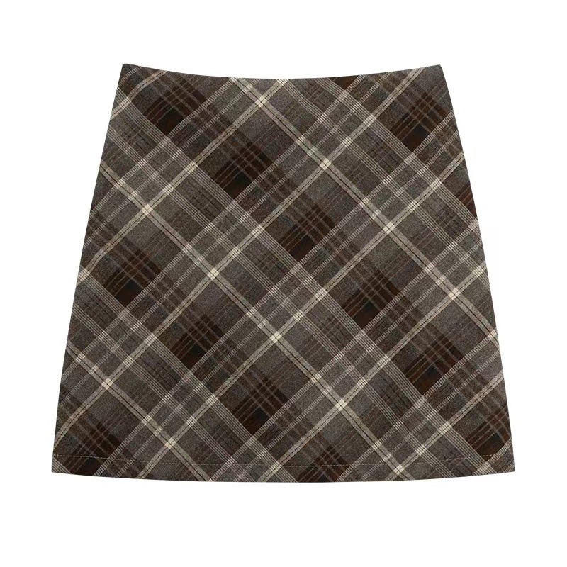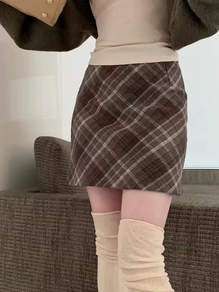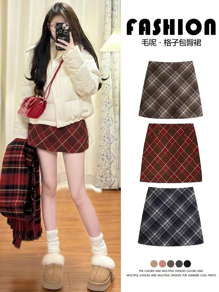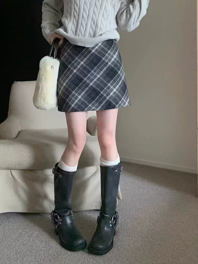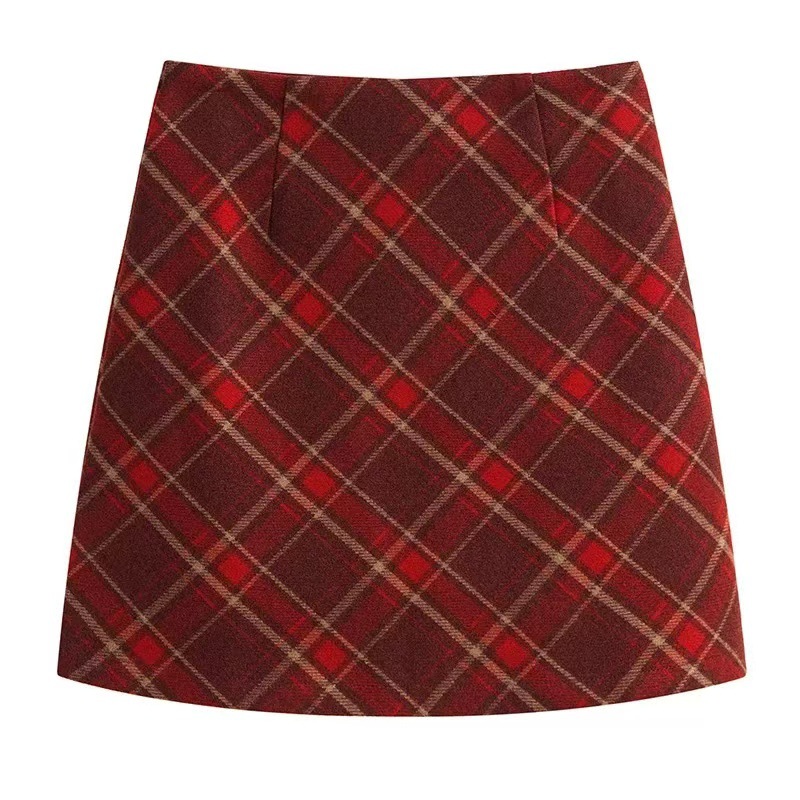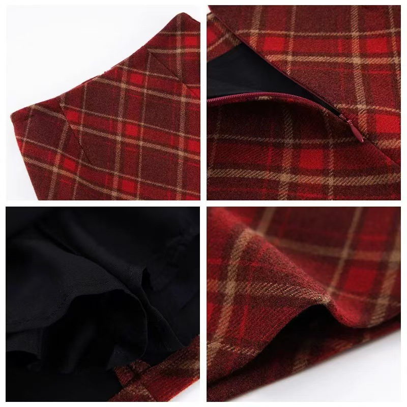 Ретро-юбка из шерстяной ткани в клетку для женщин на осень и зиму 2024 года, короткая юбка облегающая бедра маленького размера, юбка А-силуэта с высокой талией и широким подолом