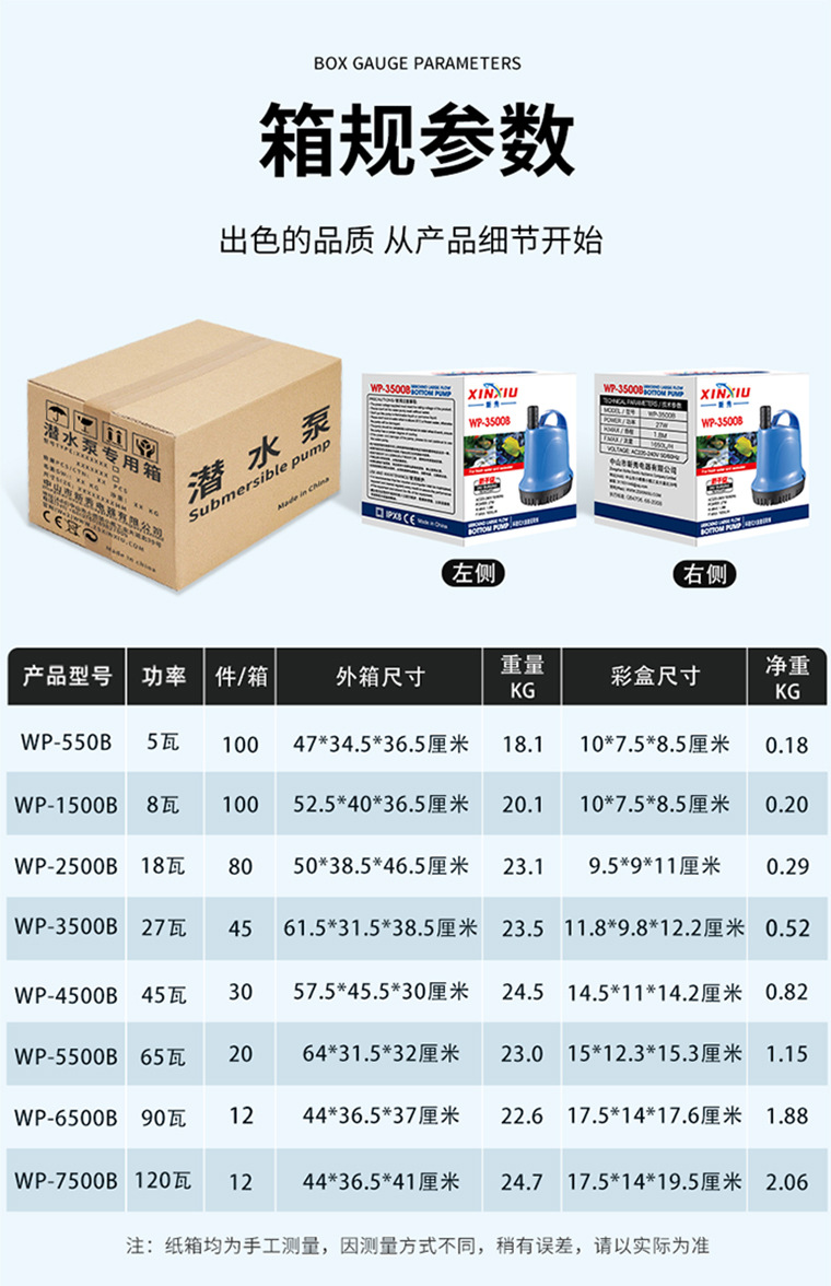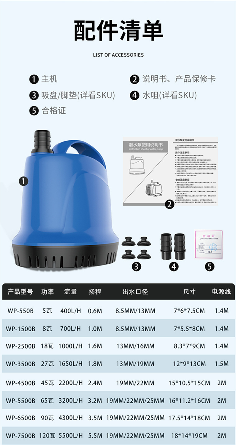 WP-550B 5W; WP-1500B 8W; WP-2500B 18W; WP3500B-модернизированная модель с защитой от сухого горения 27 Вт; WP-4500B-модернизированная модель с защитой от сухого горения 45 Вт; WP5500B-обновление против сухого горения 65 Вт; WP6500B-улучшенная модель с защитой от сухого горения 90 Вт; WP7500B-модернизированная модель с защитой от сухого горения 120 Вт