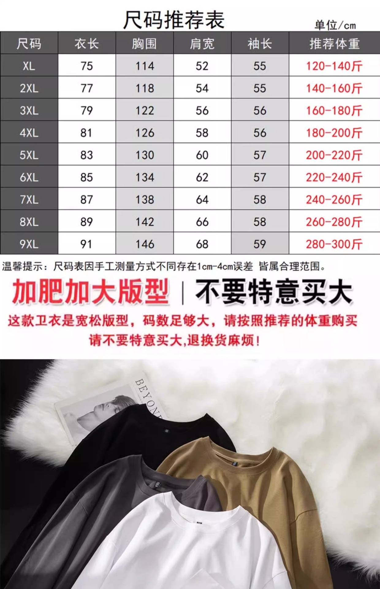 XL ( 60-70kg ); 2XL( 70-80kg ); 3XL( 80-90kg ); 4XL( 90-100kg ); 5XL( 100-110kg ); 6XL( 110-120kg; 7XL( 120-130kg; 8XL( 130-140kg; 9XL( 140-150kg )