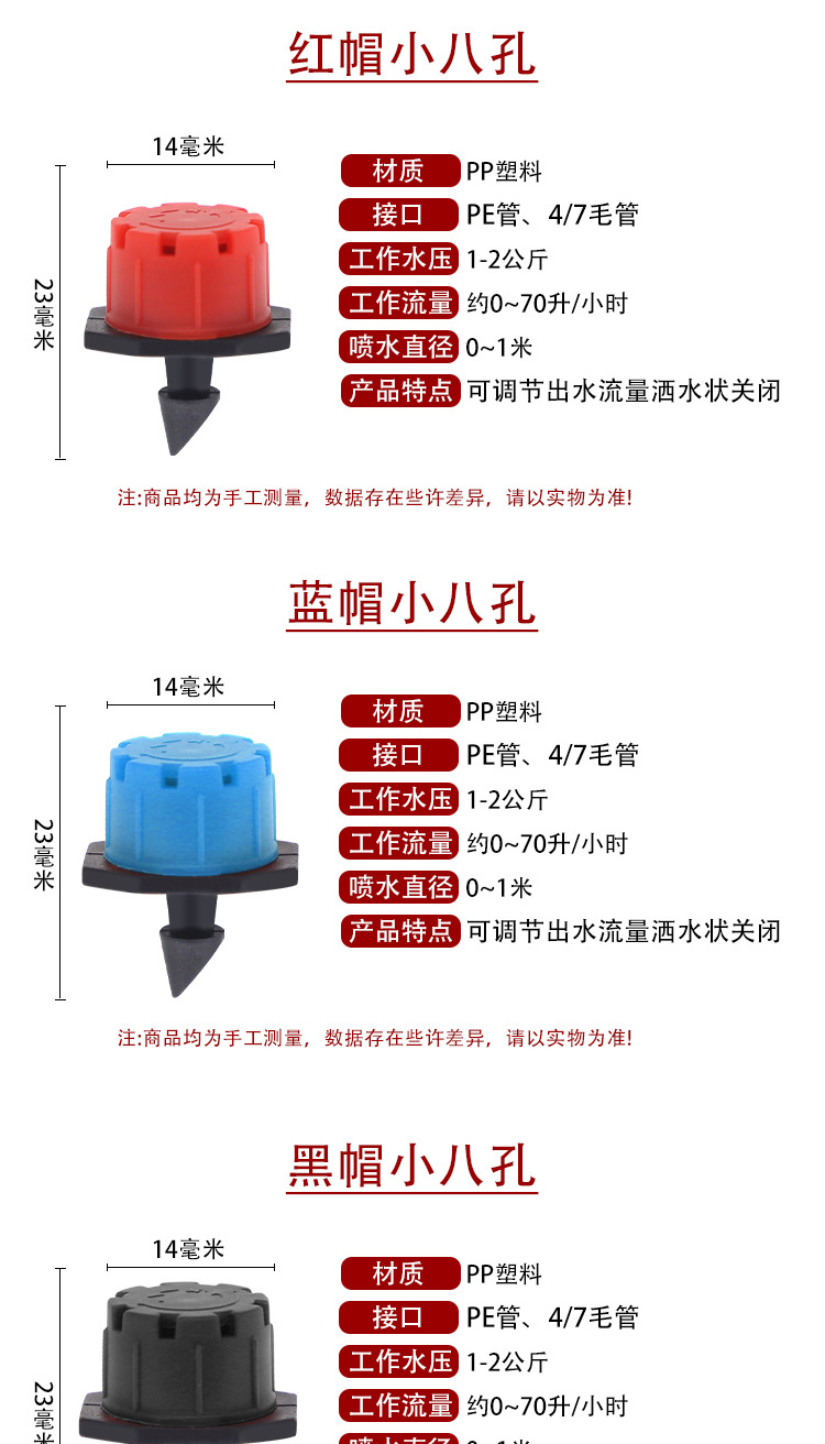 Черная шляпа маленькая восьми отверстий; Красная шапка маленькая восьми отверстий; Синяя шапка с маленькими восьмью отверстиями; Синяя шапка с маленькими восьмью отверстиями (длинное тело с резиновым кольцом против бокового протекания); Зеленая шляпа с восемью отверстиями.