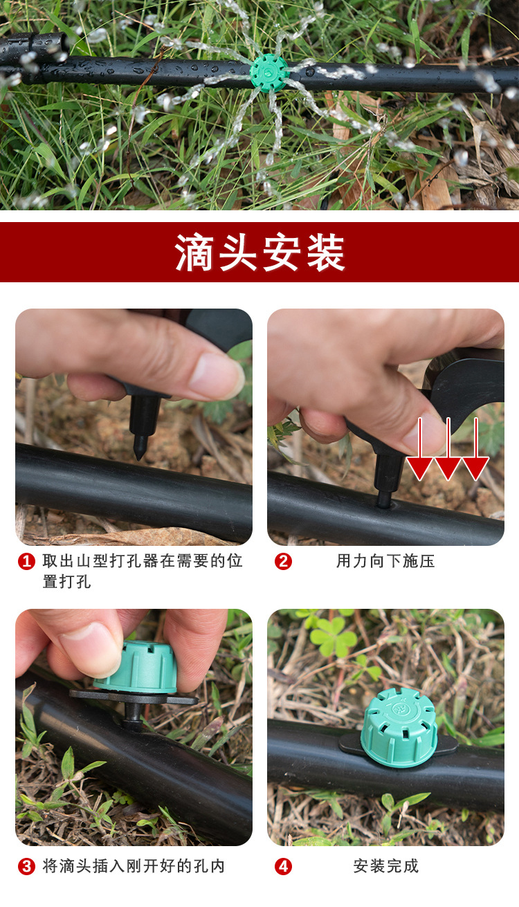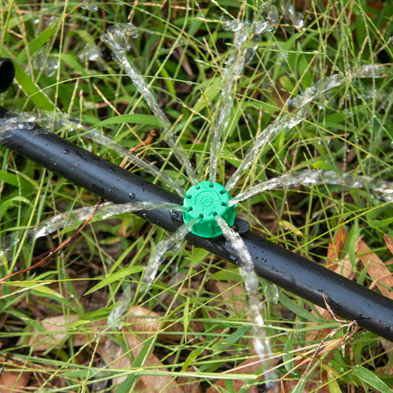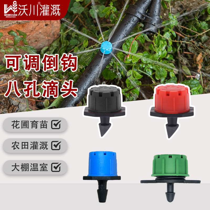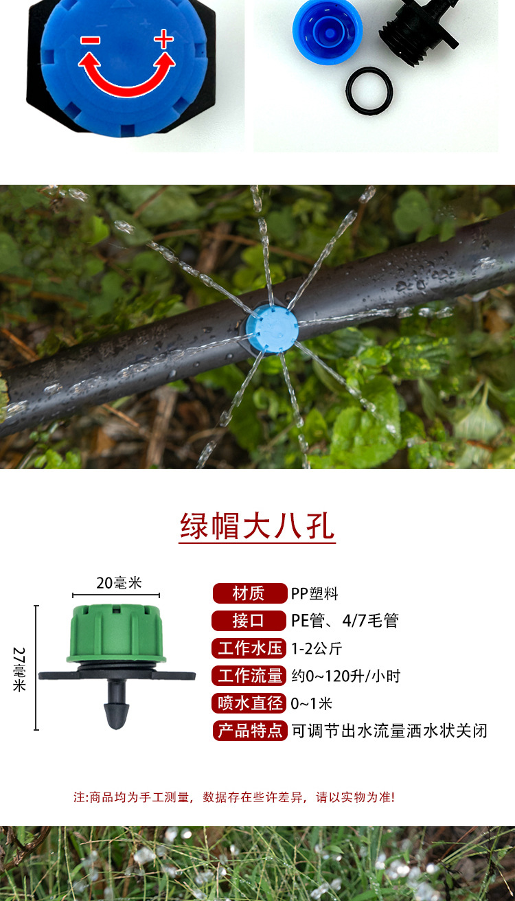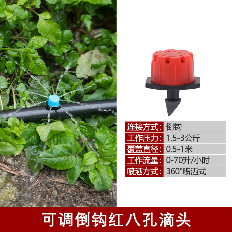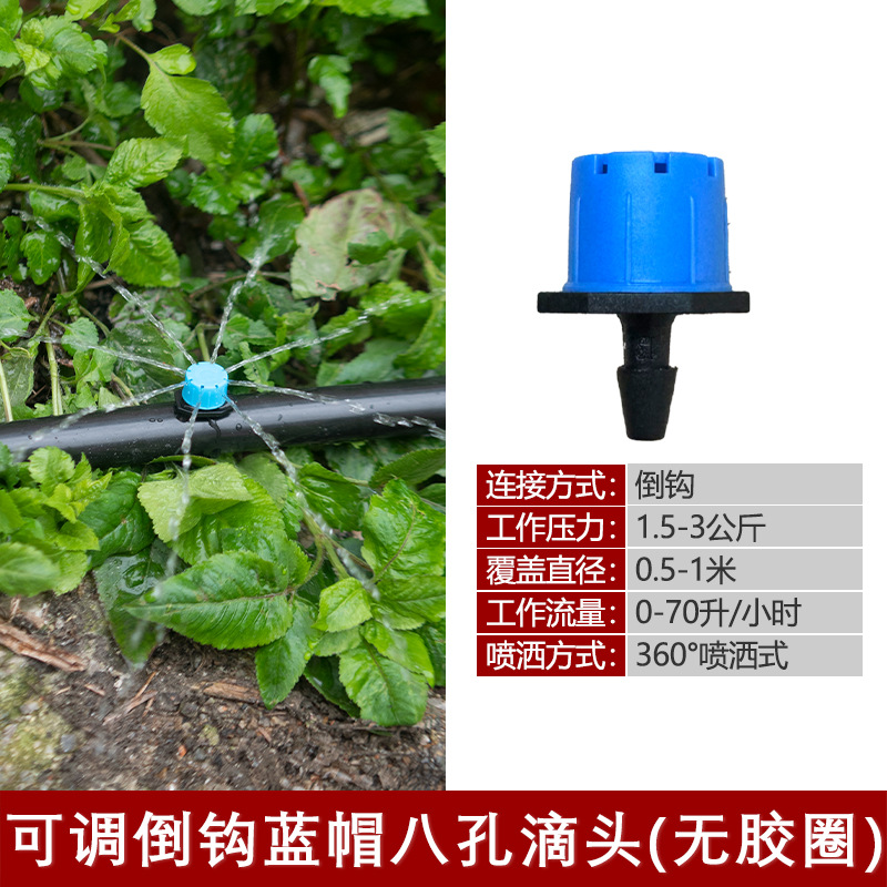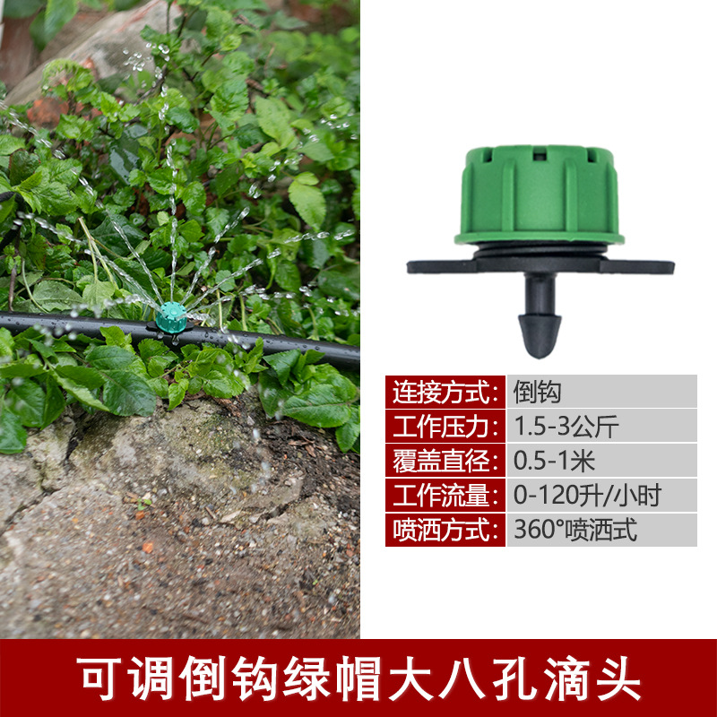 Регулируемый микро-распылитель с восьмью отверстиями для орошения, зеленый, большой, для экономичной системы полива и внесения удобрений в садах, сине-черный, с маленьким красным колпачком-капельницей.
