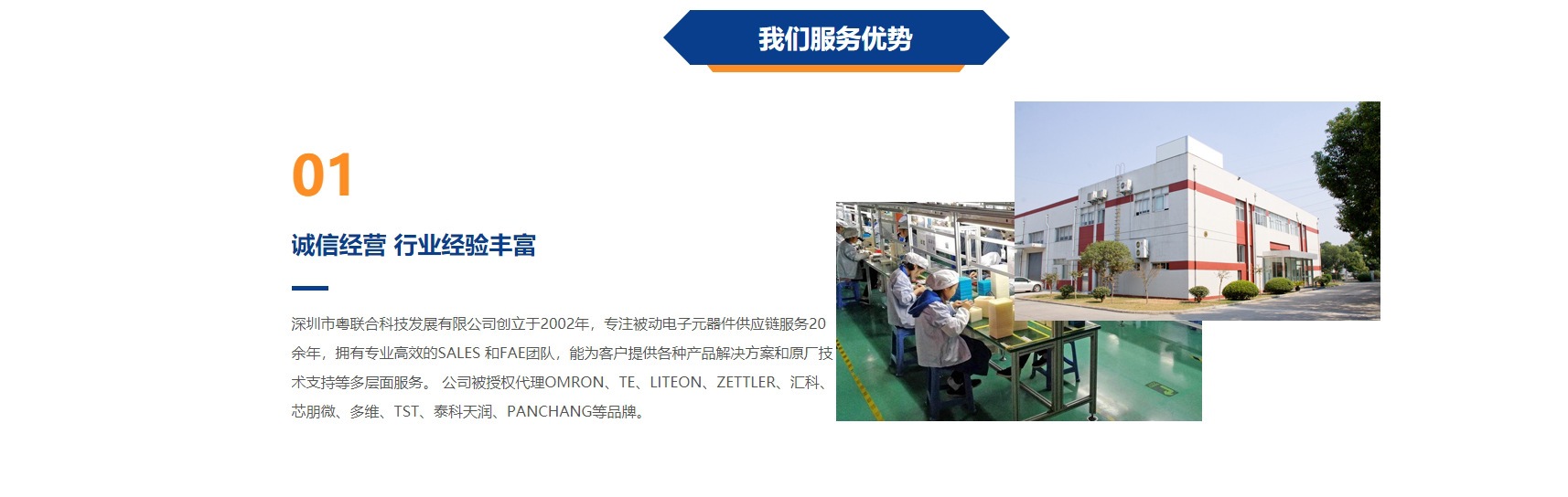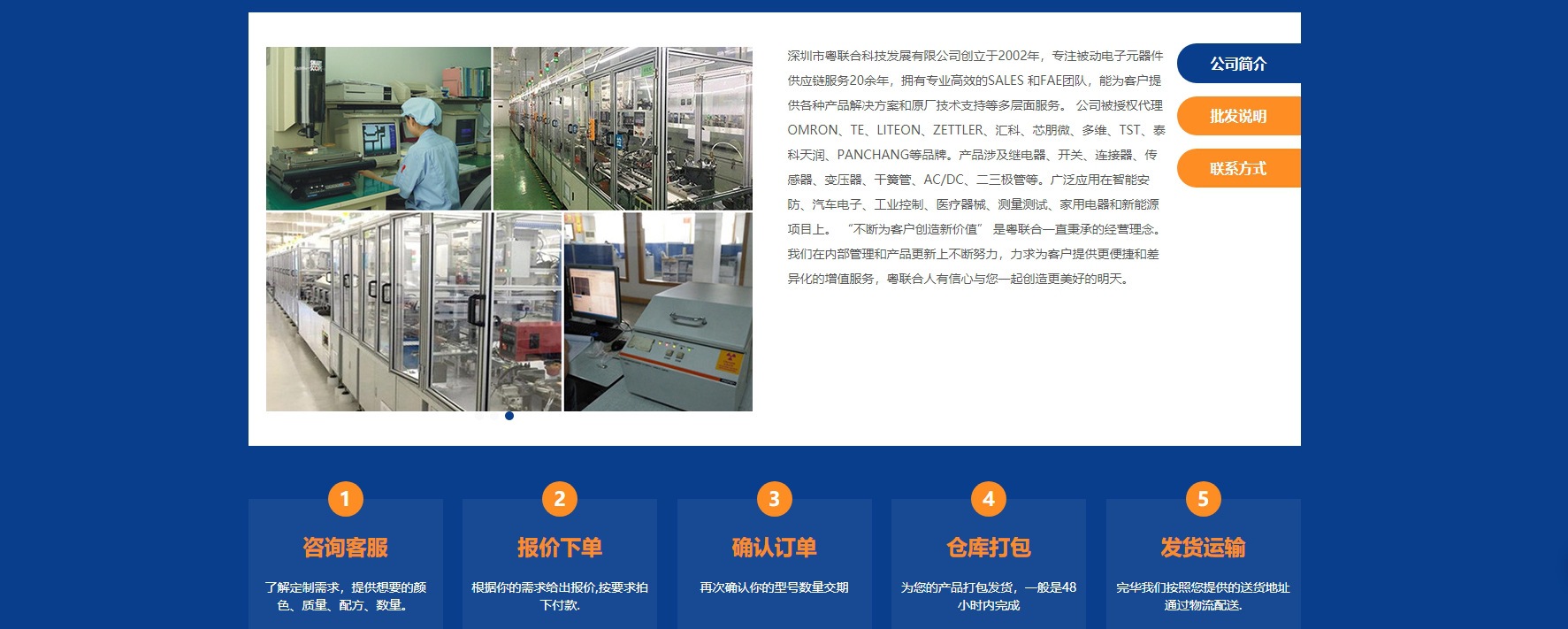 公司被授权代理OMRON、TE、LITEON、ZETTLER、汇科、芯朋微、多维、TST、泰科天润、PANCHANG等品牌。产品涉及继电器、开关、
