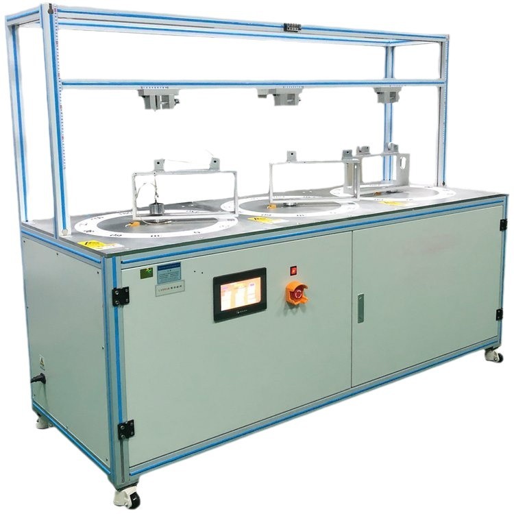 主要适用与耳机线,USB 线,电源线等做锥度摇摆试验。 将待测产品固定于测试夹具并施加一定荷重,线材固定于设备摇摆臂上并 使线材与端子呈 45°角,200g(或者其他重量)的砝码力度测试。一定的线距长度,以10次/mm的速度,正反角度的情况下进行对产品做检测测试,来评检产品品质问题。设定试验测试次数及测试速度,达到设定次数即可停止运行,线材中途断线自动停机。各种工位数量可以定制! |