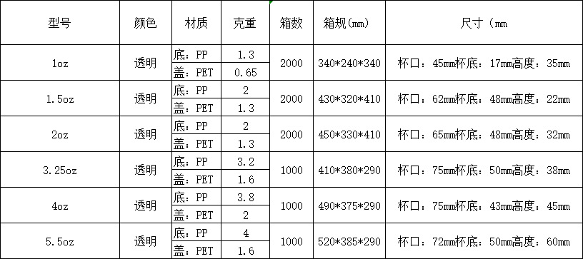 1 унция прозрачный; 1,5 унции прозрачный; 2 унции прозрачный; 3,25 унции прозрачный; 4 унции прозрачный; 5,5 унций прозрачный; 1 унция черный; 1,5 унции черный; 2 унции черного цвета; 3,25 унции черный; 4 унции черный; 5,5 унций черный