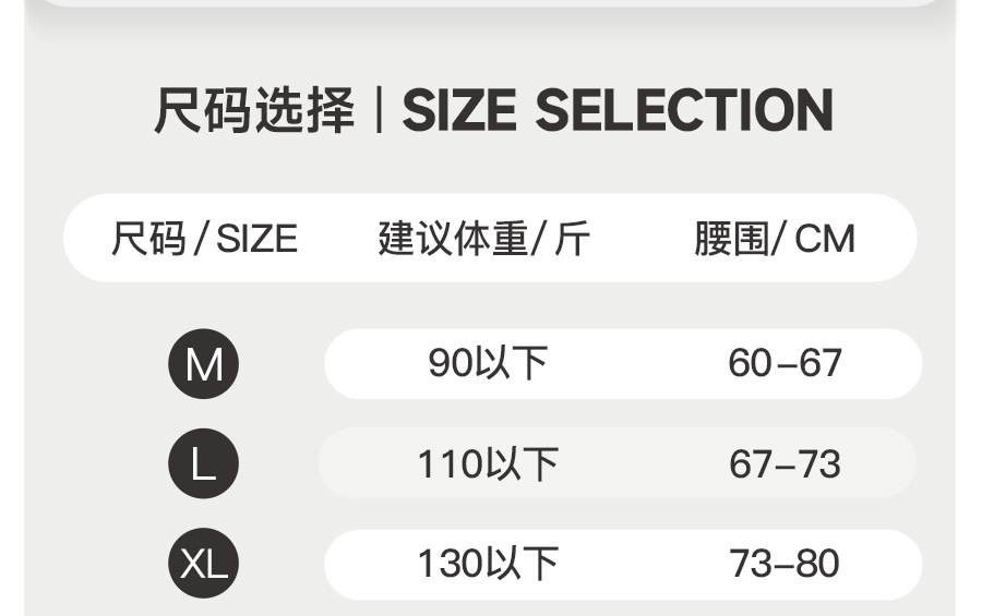 Размер M (рекомендуемый вес до 45kg кг); Размер L (рекомендуемый вес 45-55kg ); Размер XL (рекомендуемый вес 55-65kg ); Размер 2XL (рекомендуемый вес 65-75kg ); Размер 3XL (рекомендуемый вес 75-85kg ); Увеличение 4XL (рекомендуемый вес 85-95kg); Увеличение 5XL (рекомендуемый вес 85-95kg)