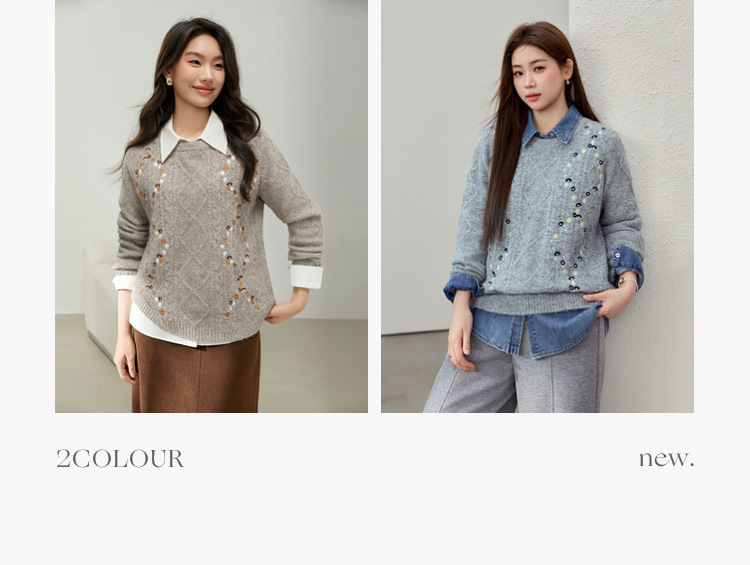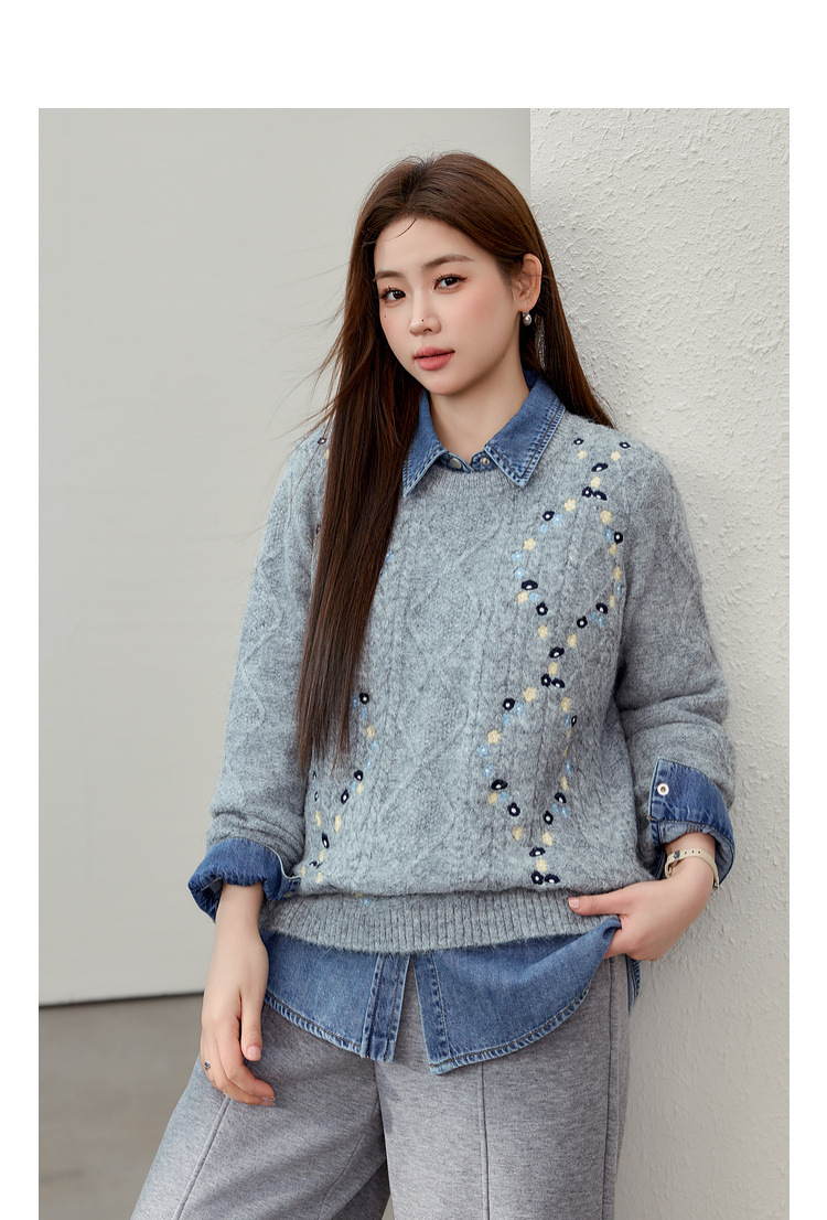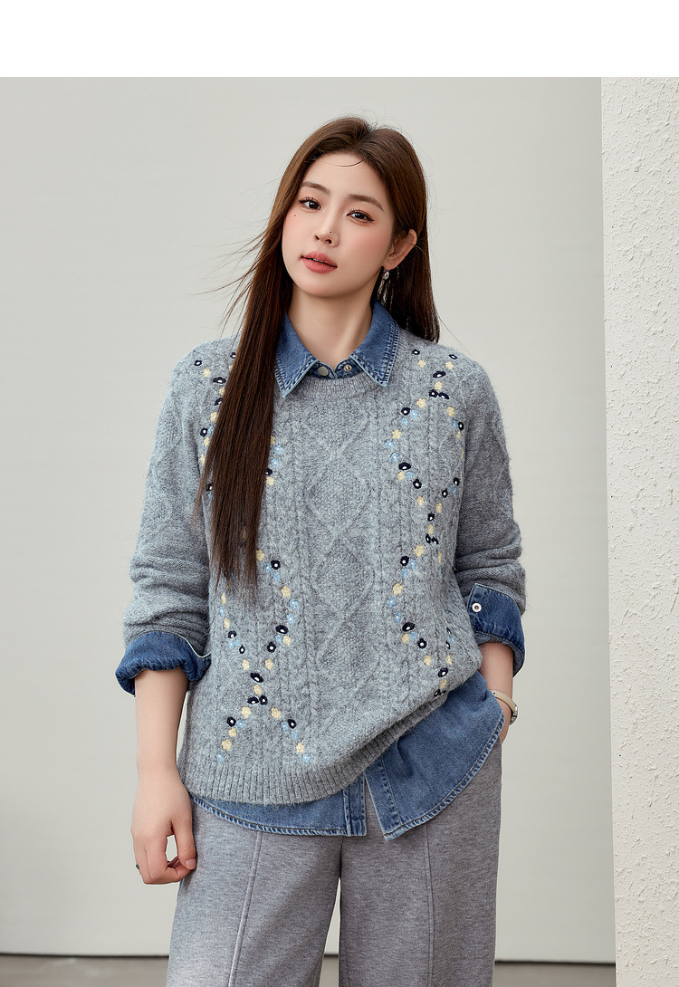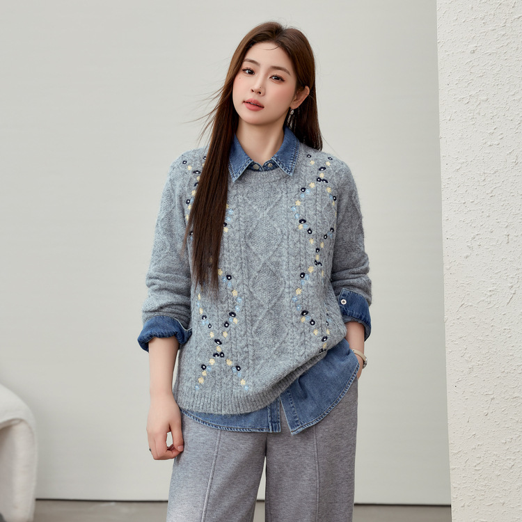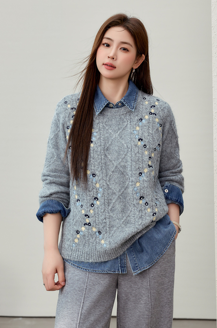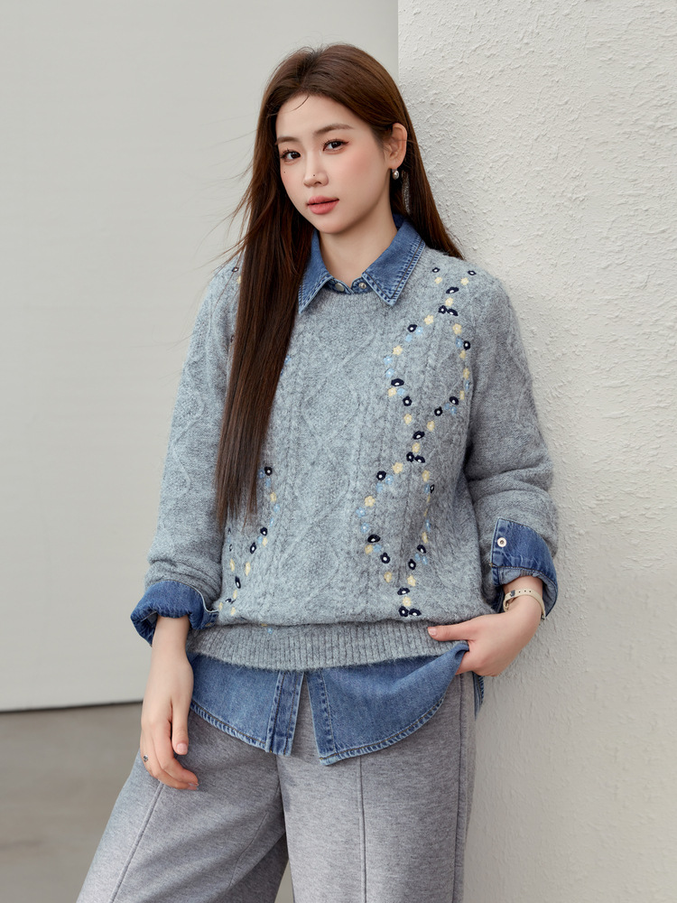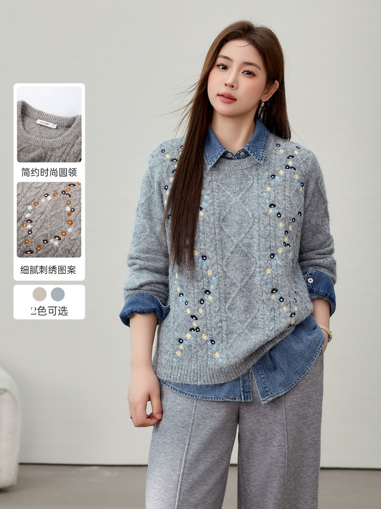[Ретро нежный ветер вышитый дикий свитер с круглым вырезом] Цветное шоу большой размер женский толстый mm2025 весенний стиль новый