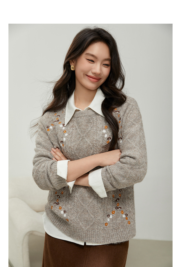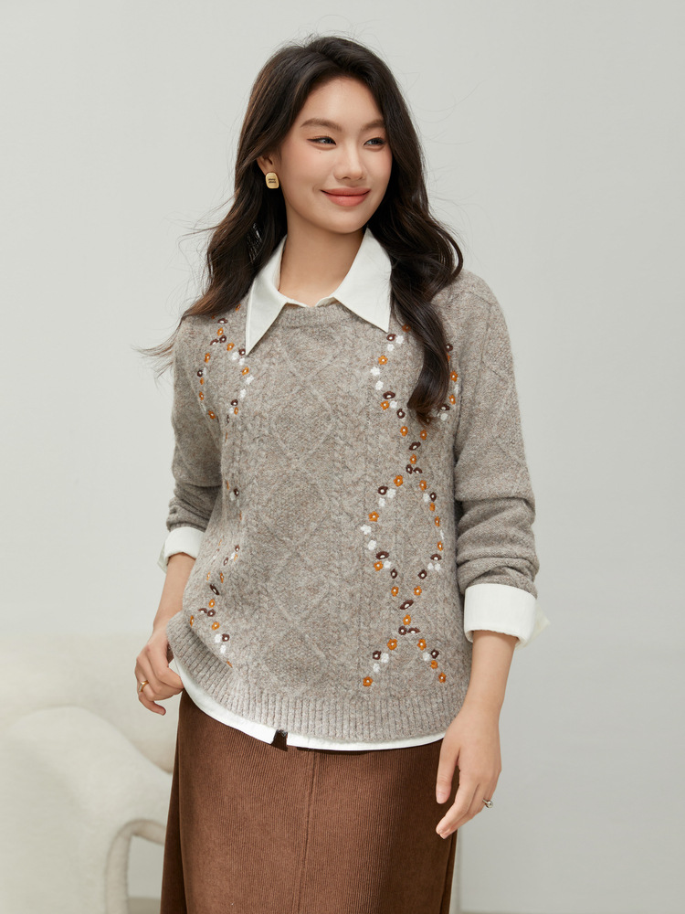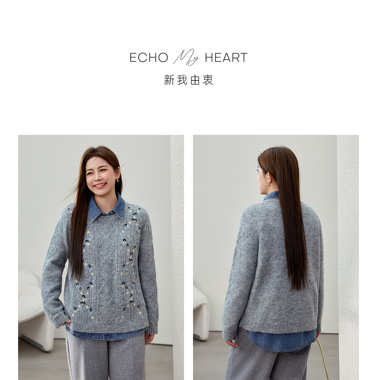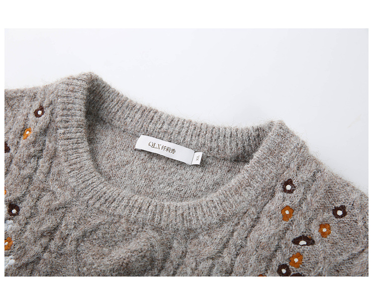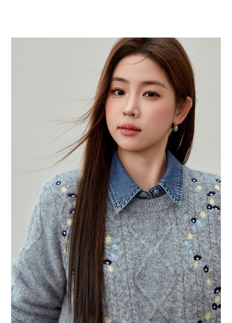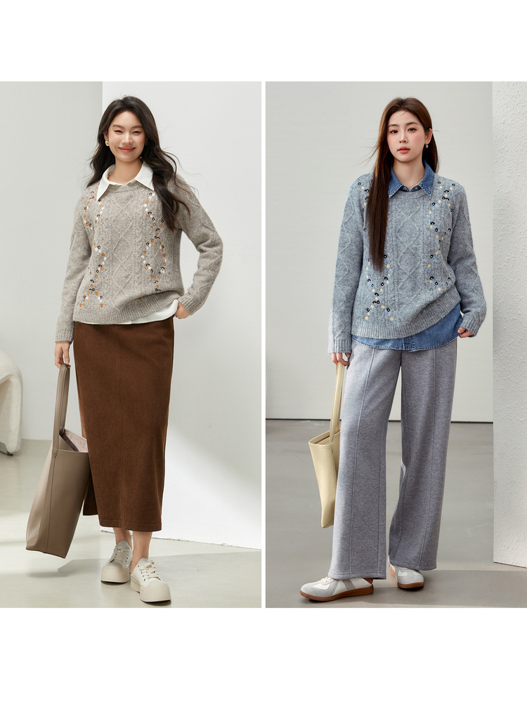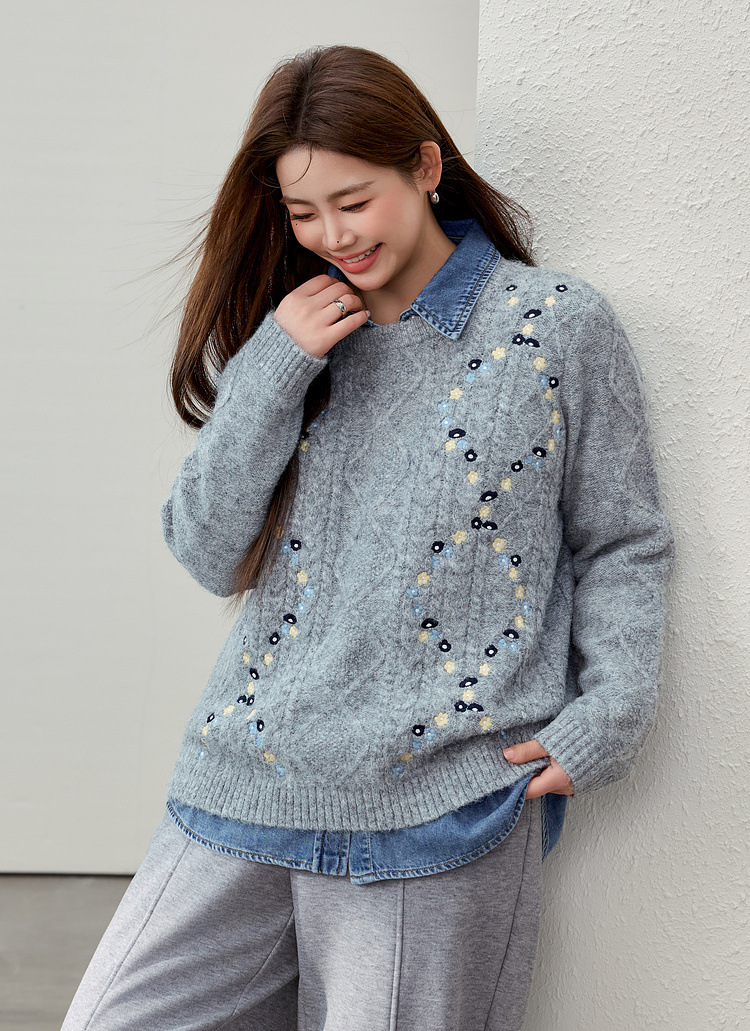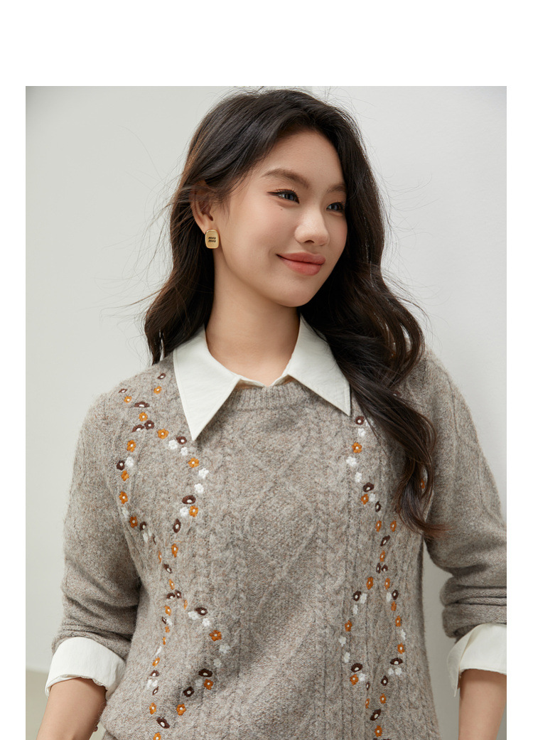 [Ретро нежный ветер вышитый дикий свитер с круглым вырезом] Цветное шоу большой размер женский толстый mm2025 весенний стиль новый
