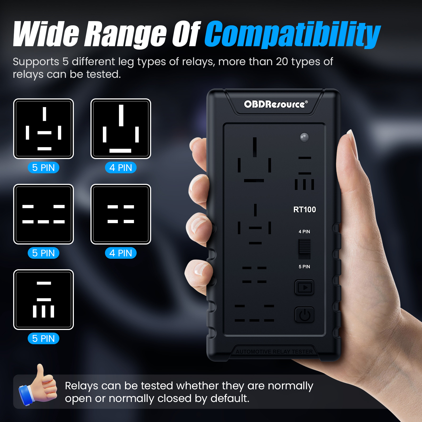 该设备是一款专业的继电器测试仪,可以在 5 个不同的引脚位置测试 12V/24V 继电器,并自动识别它们以指示常见汽车继电器的一般健康状况和功能。