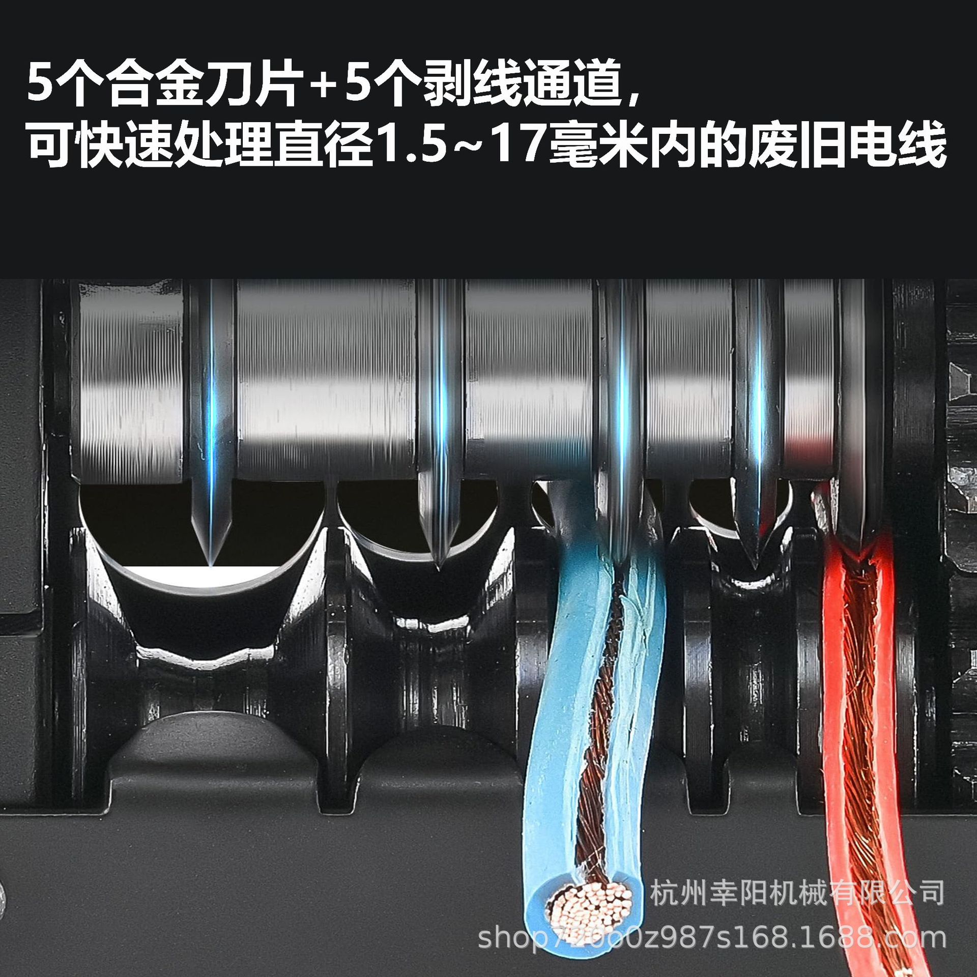 -此款剥线机配有5个合金刀片及7个进线孔,可以轻松处理1.5mm~17mm的电线,告别手工剥线,拥抱高效。