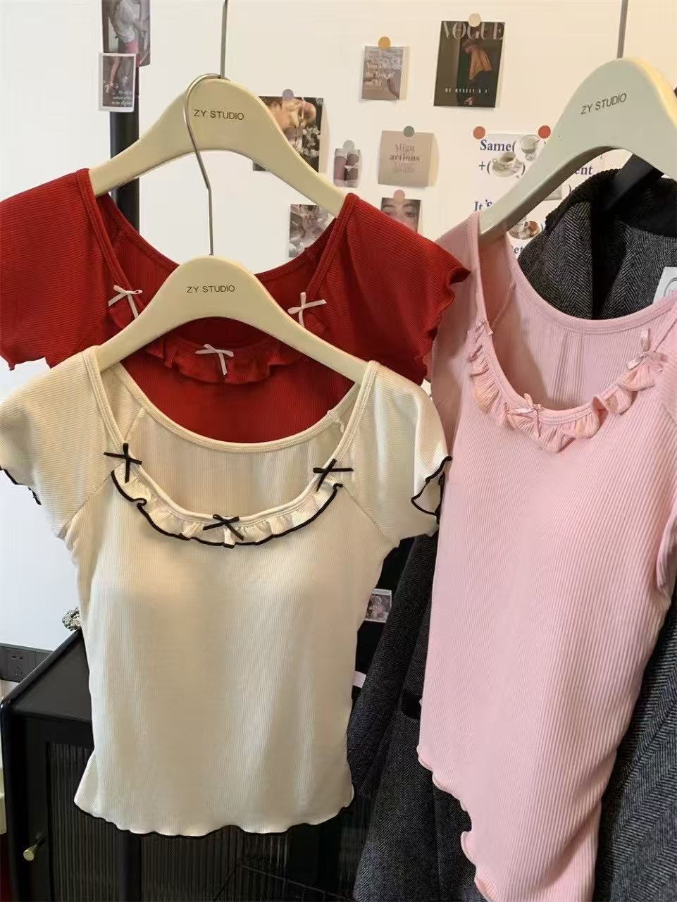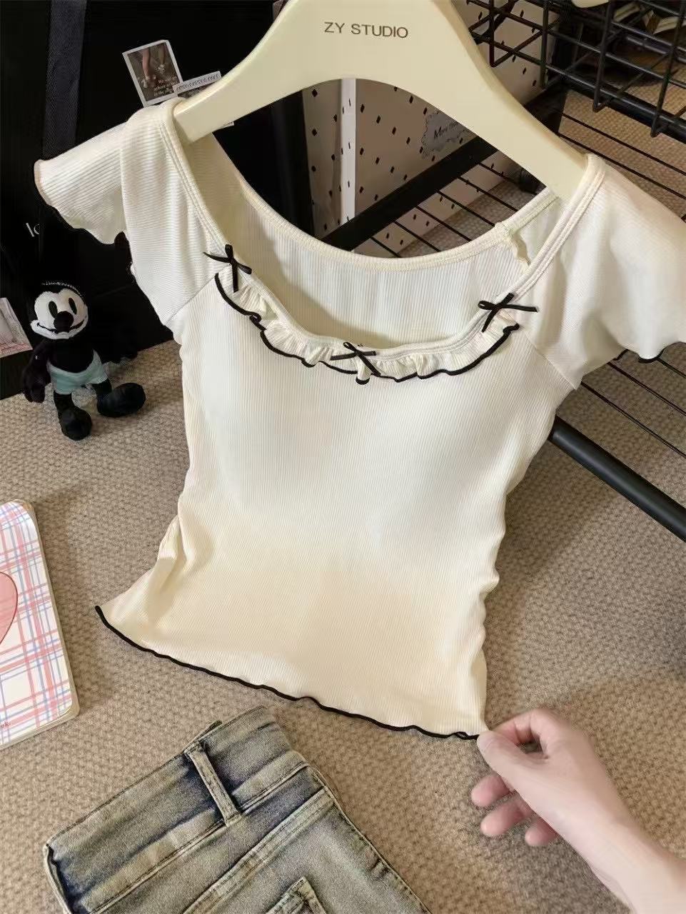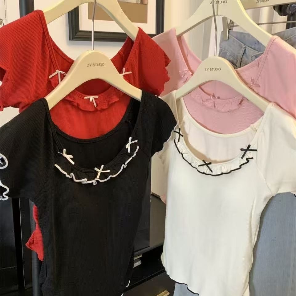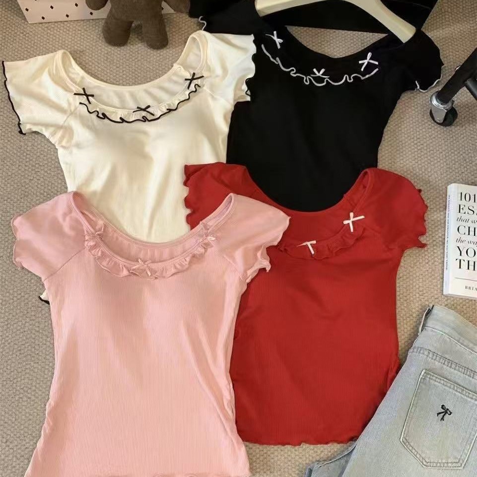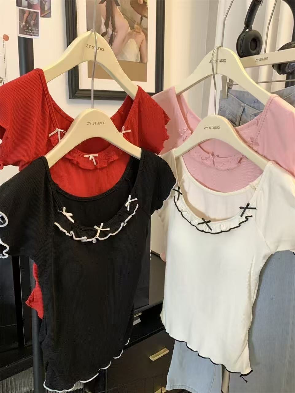 Дизайн с бантиком чистый ветер с короткими рукавами футболка женская с нагрудным ковриком