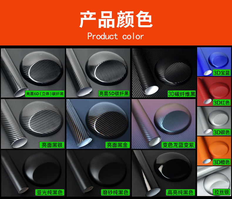 Глянцевый 7D (трехмерный) углеродное волокно черный; Глянцевый 6D (трехмерный) углеродное волокно черный; Глянцевое 5D углеродное волокно черного цвета; Глянцевый черный серебристый; глянцевое черное золото; 3D углеродное волокно черный; 3D хамелеон из углеродного волокна; матовый черный; Матовый черный; Глянцевый черный