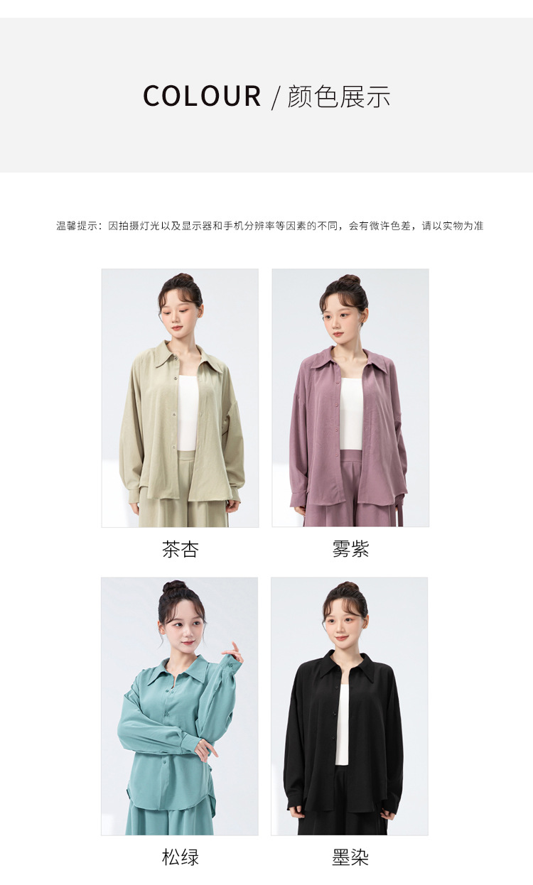 Чай Абрикос-Топ; Чернильный краситель-топ; Сосновый зеленый верх; Туман Фиолетовый-Топ; Чаксинг-Брюки; Брюки с чернильным красителем; Сосновые зеленые брюки; Туман Фиолетовые Брюки; Ча Син-топ + брюки; Тушь-краситель-топ + брюки; Сосновый зеленый топ + брюки; Туман Фиолетовый топ + брюки