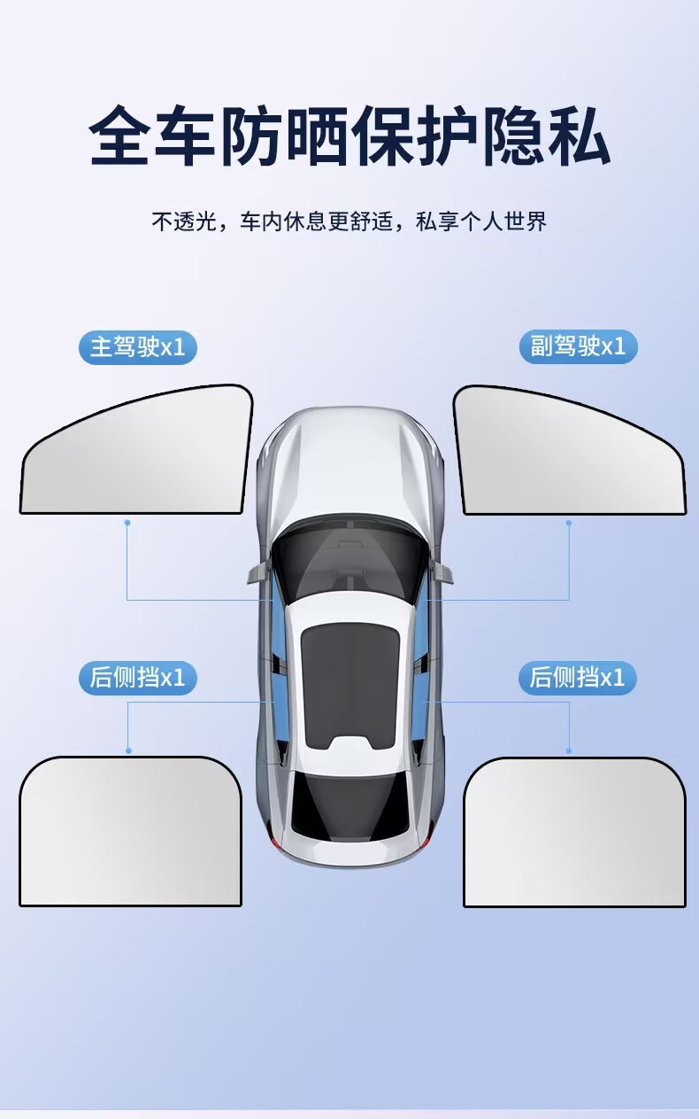 Полная автомобильная четырехдверная оконная занавеска [защита конфиденциальности]; Пара штор для задних окон [детский солнцезащитный козырек, защита от света и солнца]; Пара штор в первом ряду [изоляция и солнцезащитный козырек]; Окно основного водителя (одна штука); Заднее стекло (одна штука)