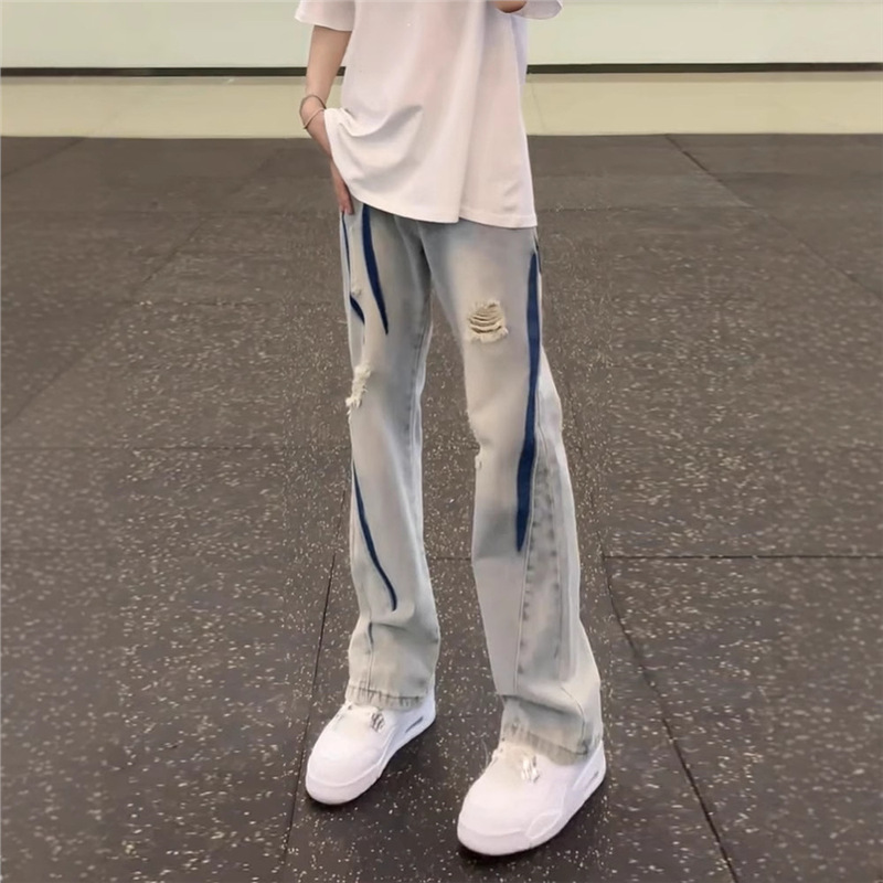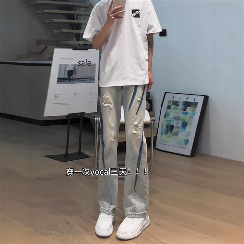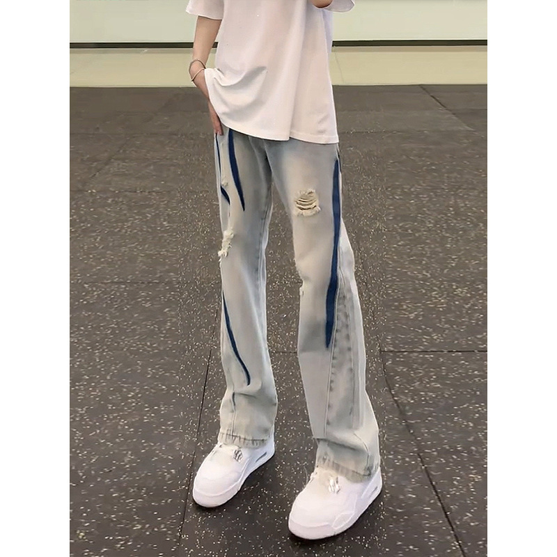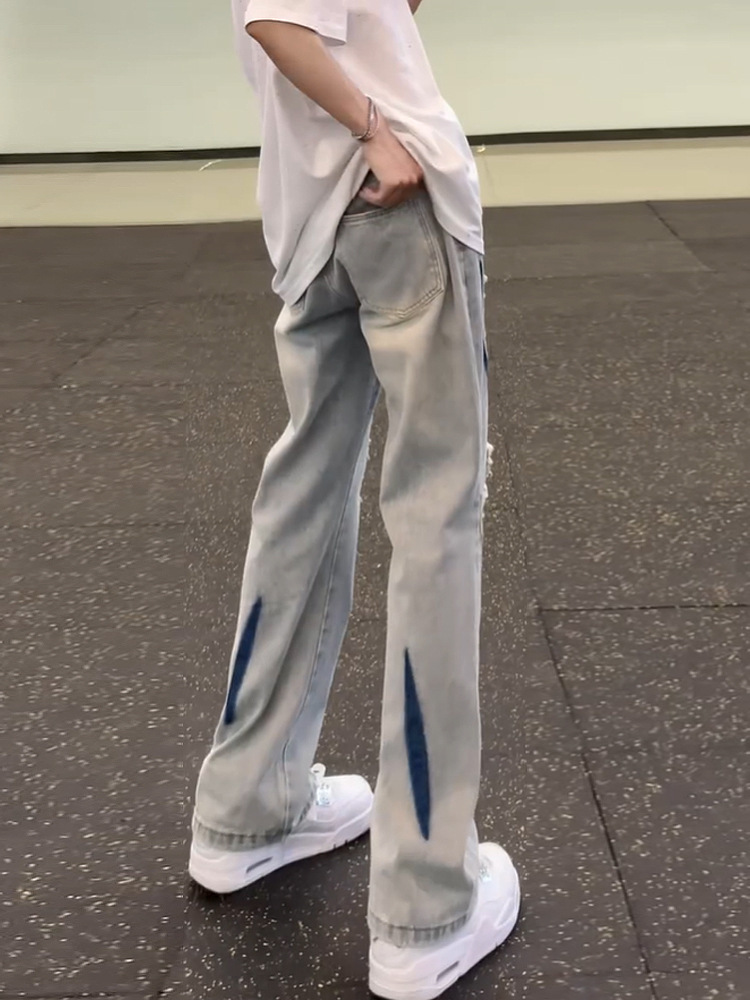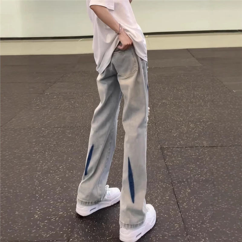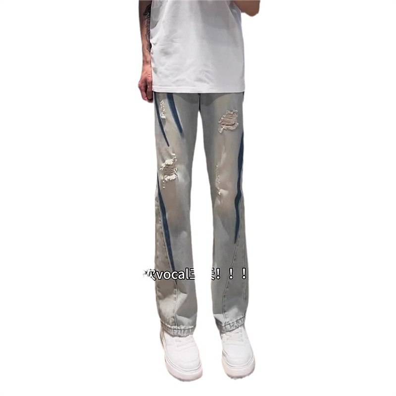 Американские высокие улицы Прямые штаны с пряными пряными брюками, окрашенные в дыры, джинсы, мужские осенние и зимние приливы, красивые жареные уличные брюки