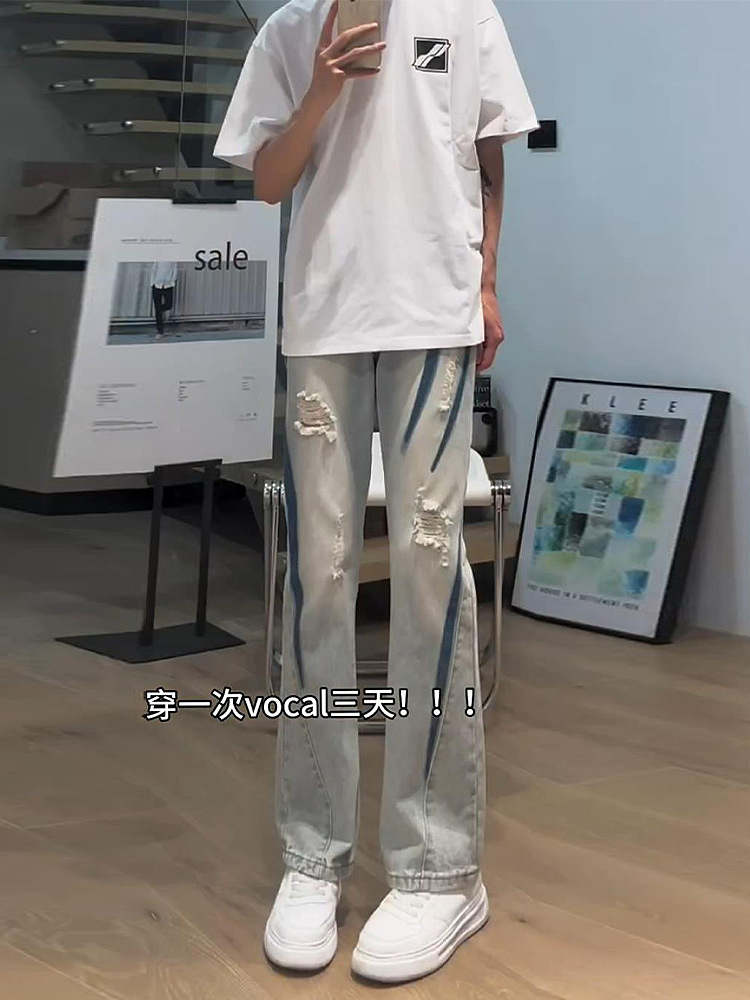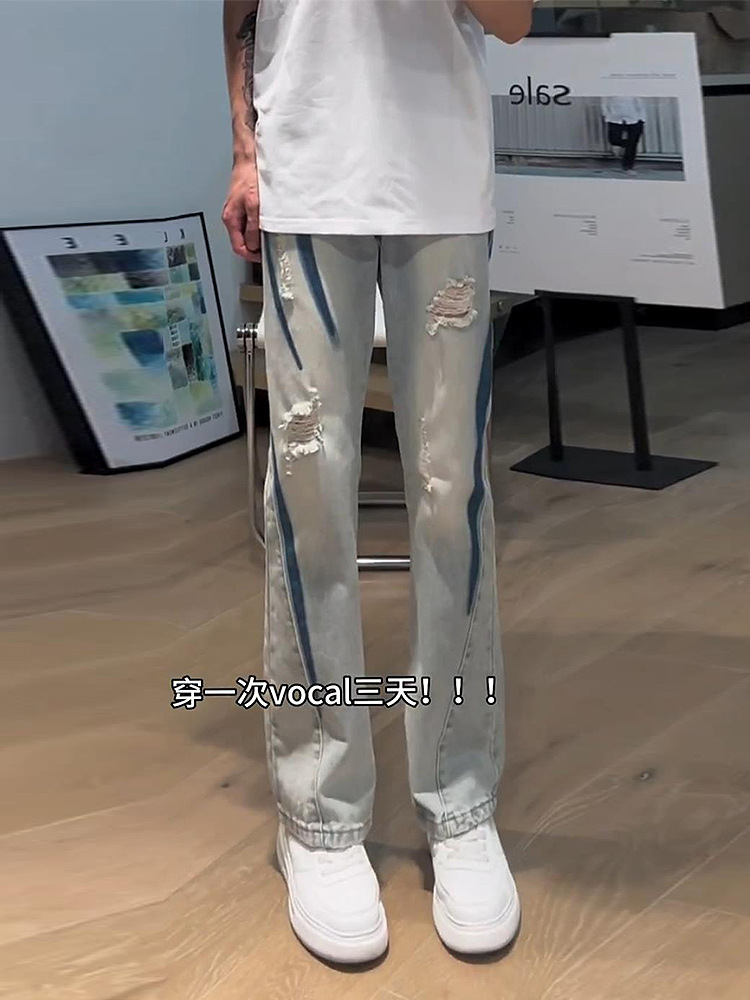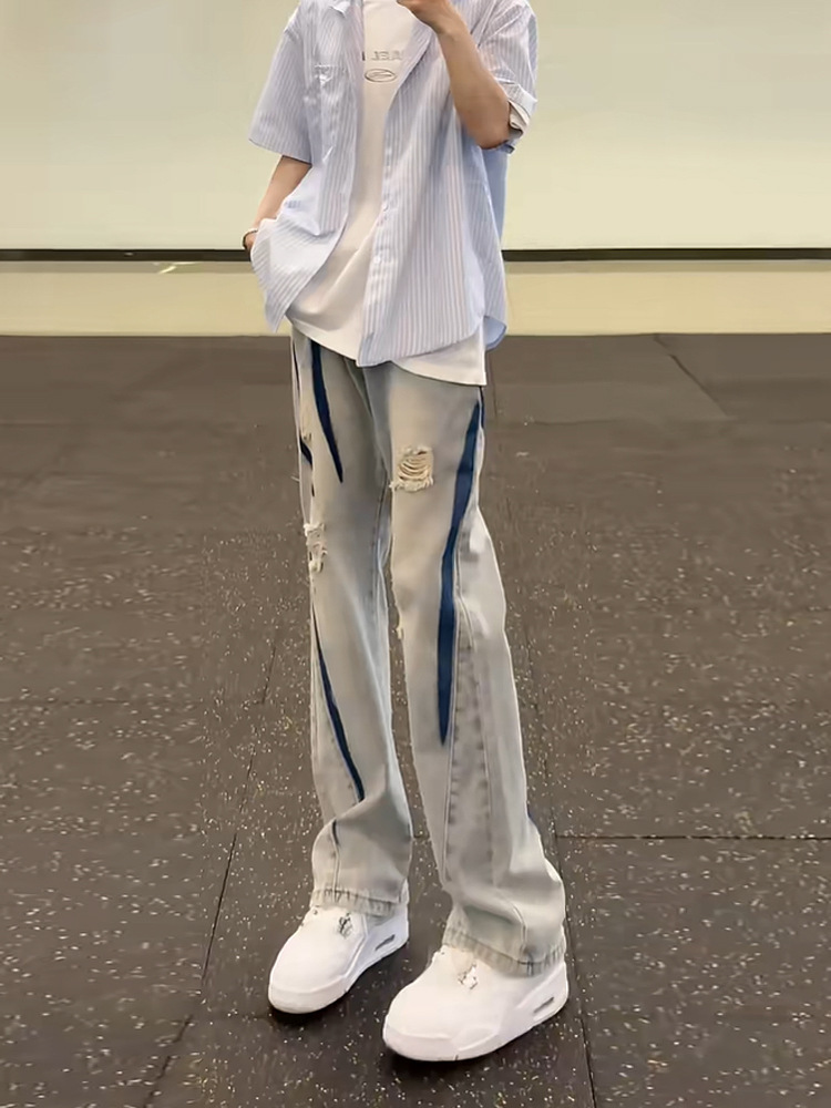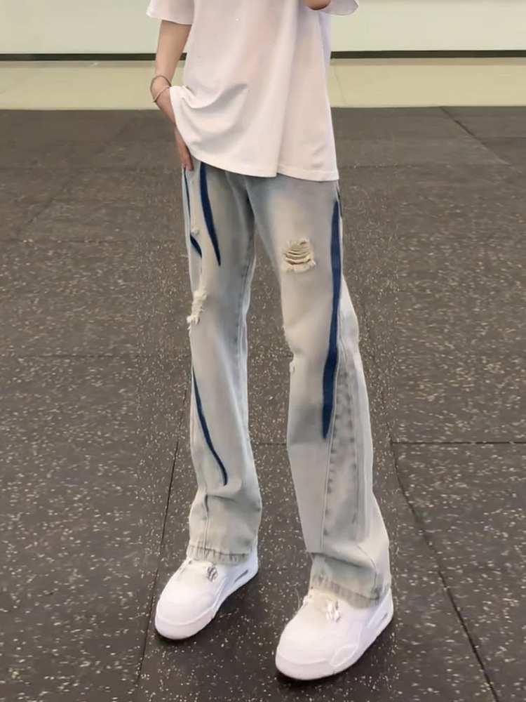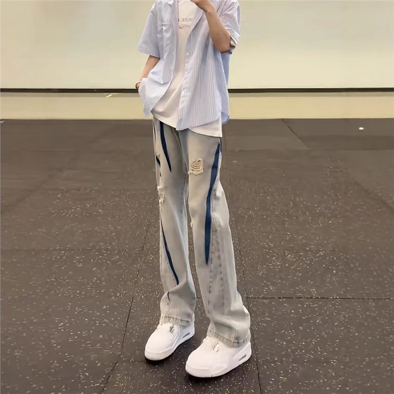 Американские высокие улицы Прямые штаны с пряными пряными брюками, окрашенные в дыры, джинсы, мужские осенние и зимние приливы, красивые жареные уличные брюки