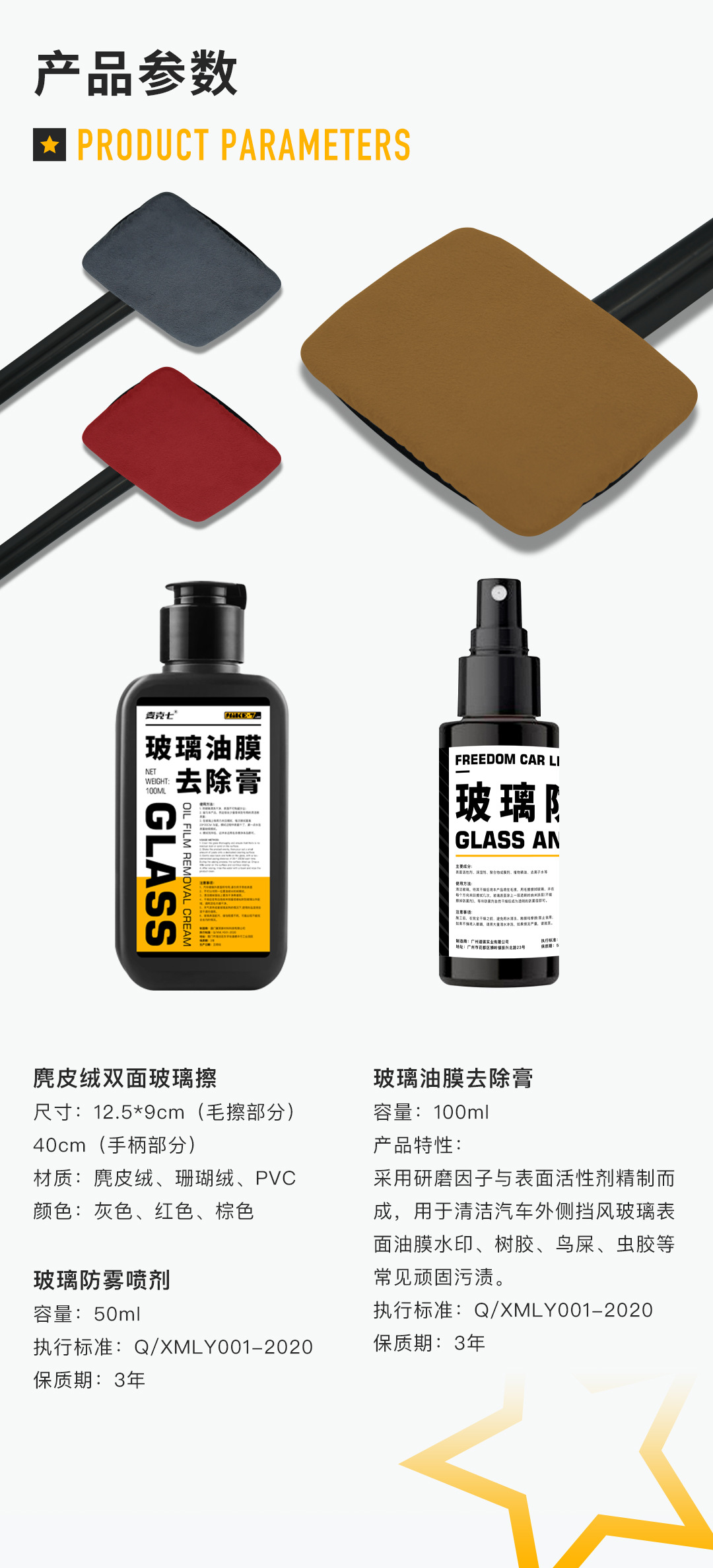 стеклянный противозапотевающий агент; Щетка для замши + стеклянный противозапотевающий агент; Щетка для замши + средство для защиты от запотевания стекла + средство для удаления масляной пленки; Щетка для замши + сменный тканевый чехол + стеклянный противозапотевающий агент + паста для удаления масляной пленки; Замшевая стеклянная щетка + сменный тканевый чехол + стеклянный противозапотевающий агент
