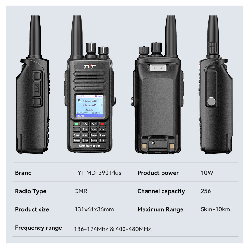 Рация TYT MD-UV390, водонепроницаемая по стандарту IP67, DMR цифровая, с AES256 шифрованием, двухдиапазонная, 10Вт, портативная, ударопрочная.