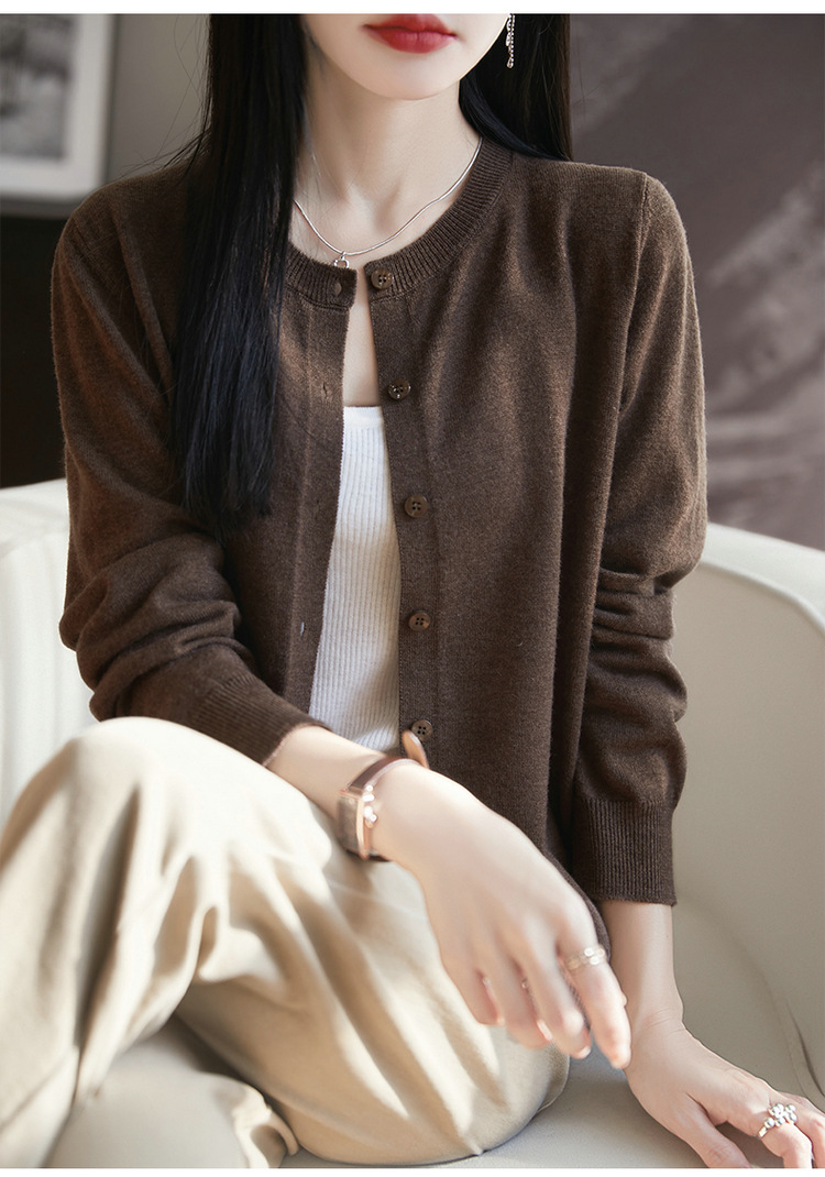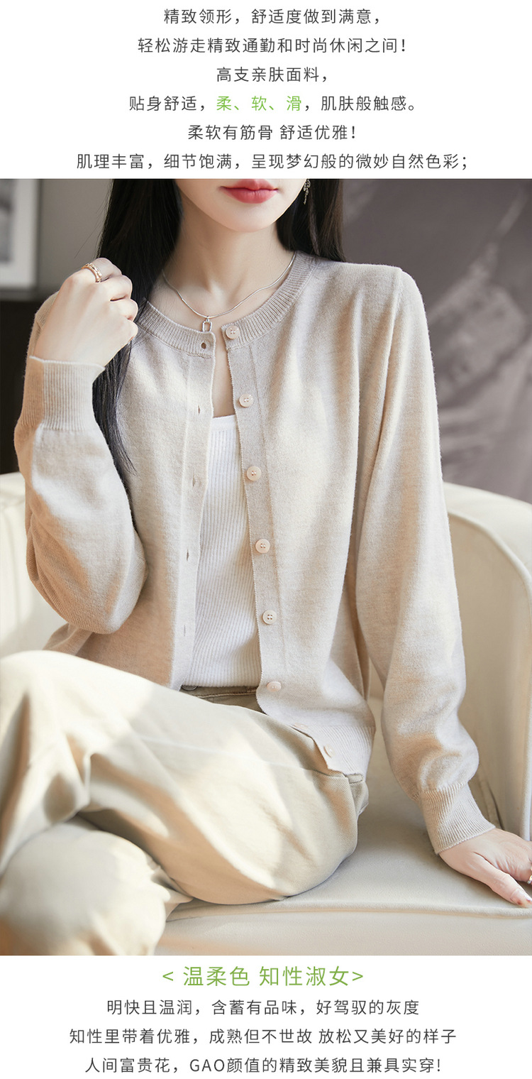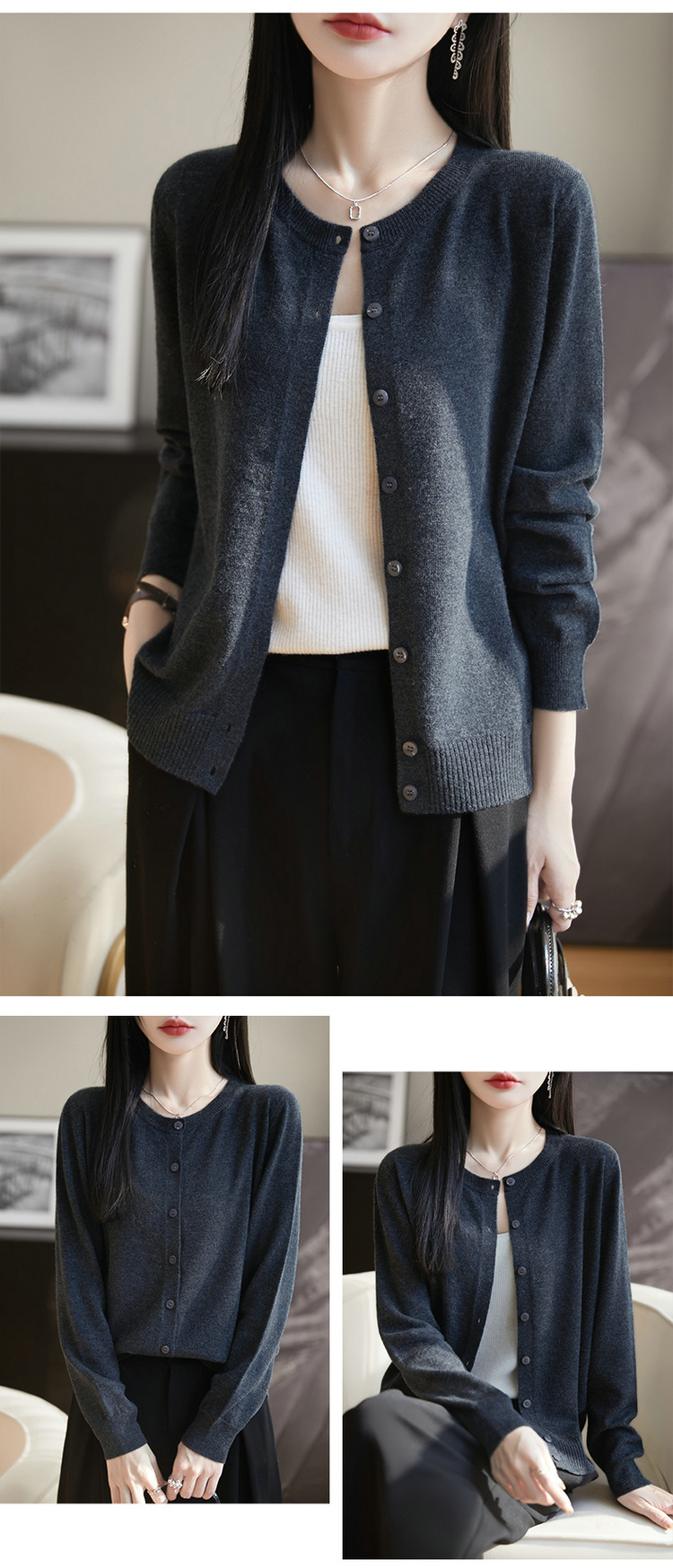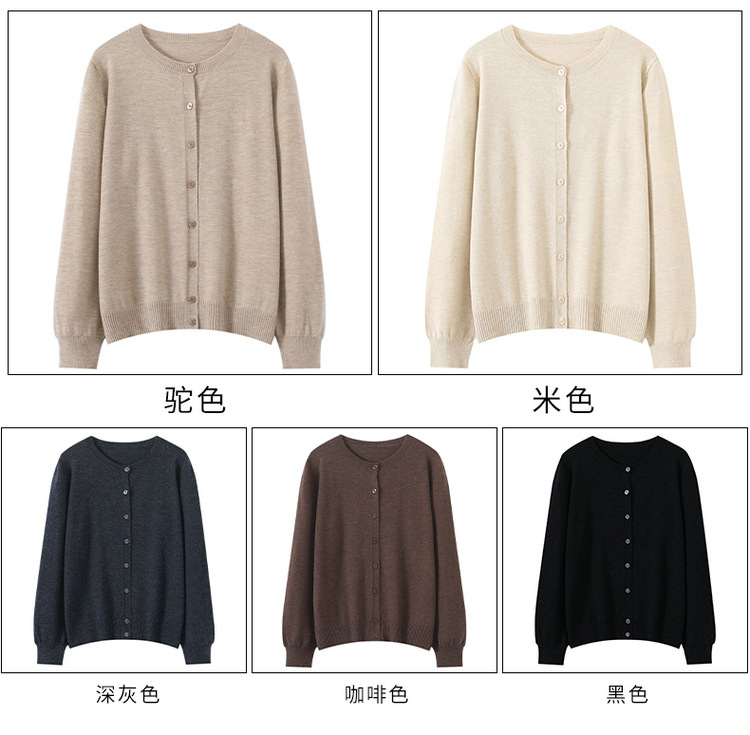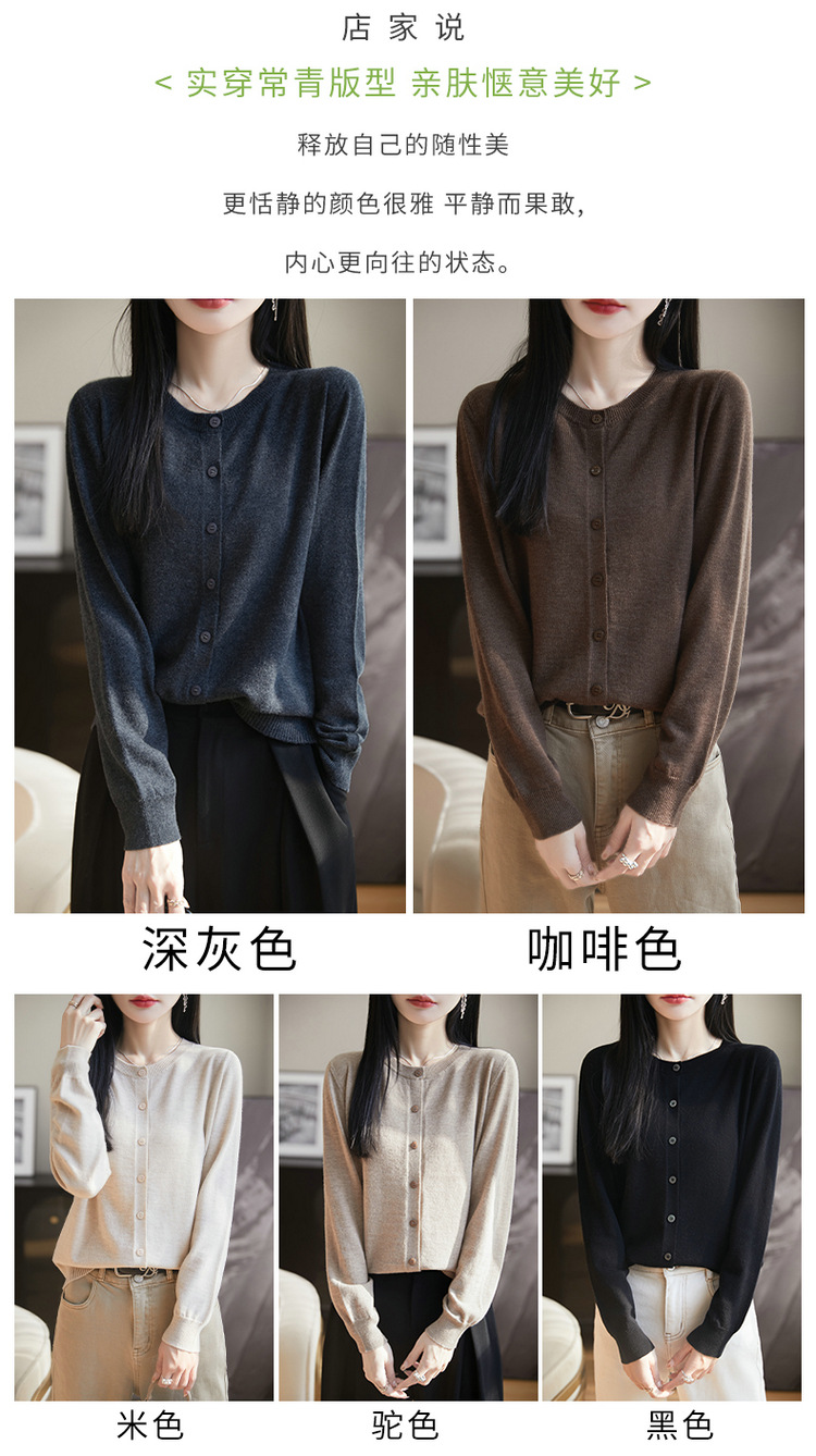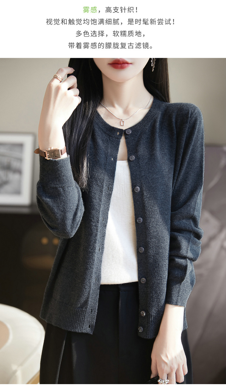Тонкий кардиган из тонкой пряжи для ранней осени, свободный и стройнящий трикотажный жакет для весны и осени, 100% чистый шерстяной кардиган для женщин с круглым вырезом.