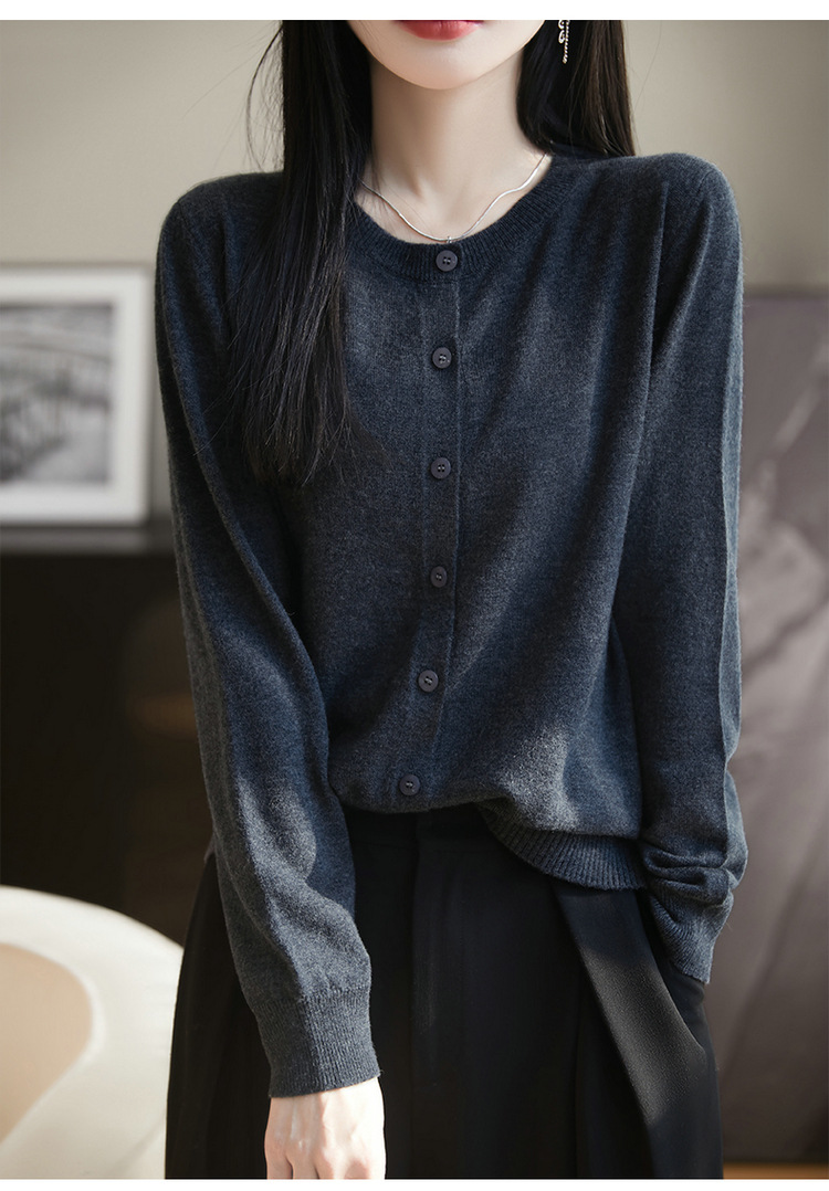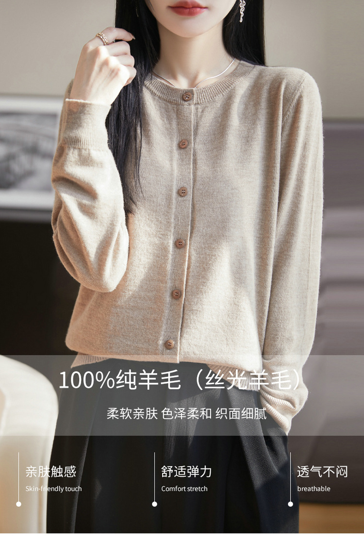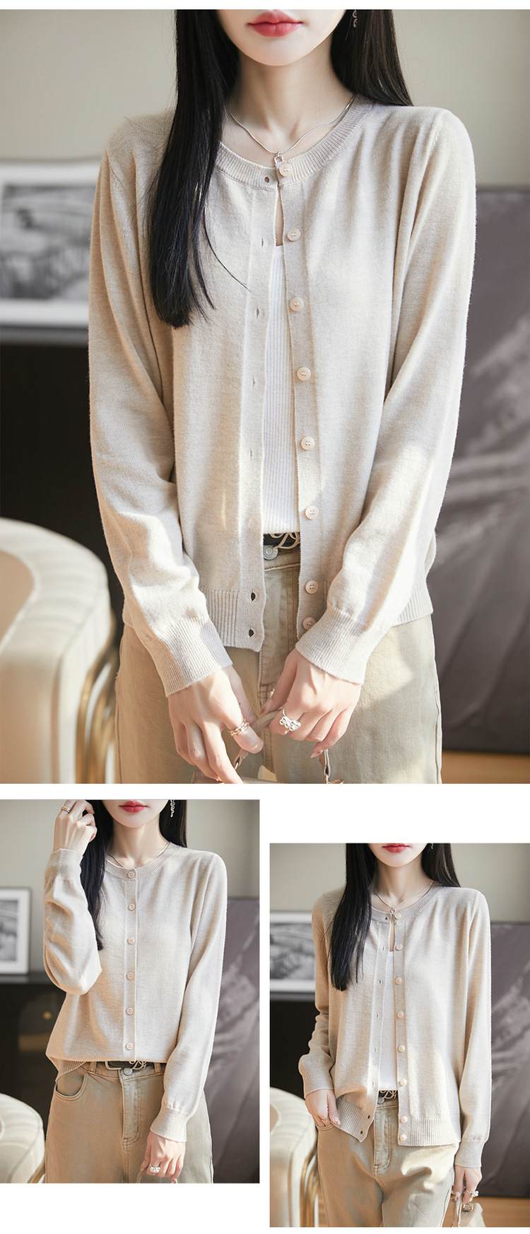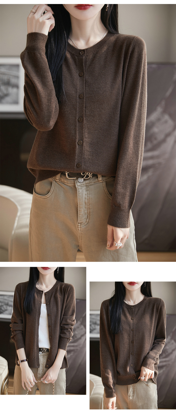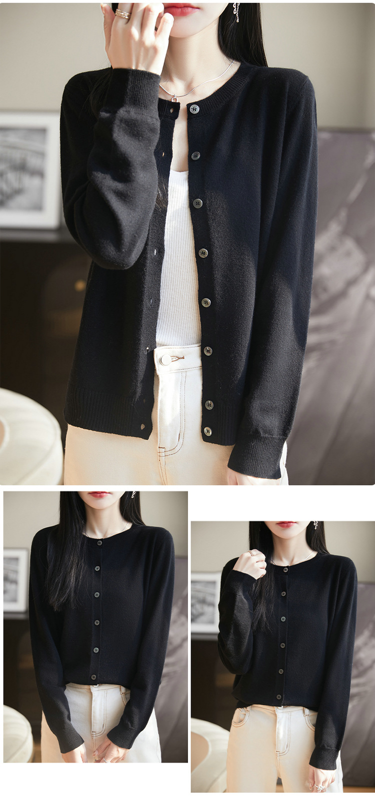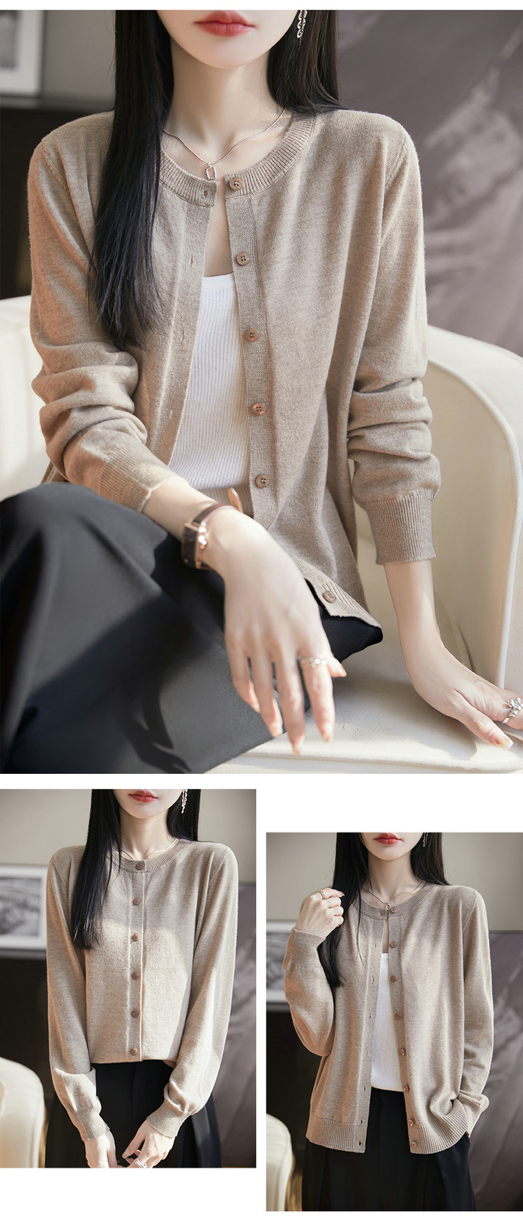 Тонкий кардиган из тонкой пряжи для ранней осени, свободный и стройнящий трикотажный жакет для весны и осени, 100% чистый шерстяной кардиган для женщин с круглым вырезом.