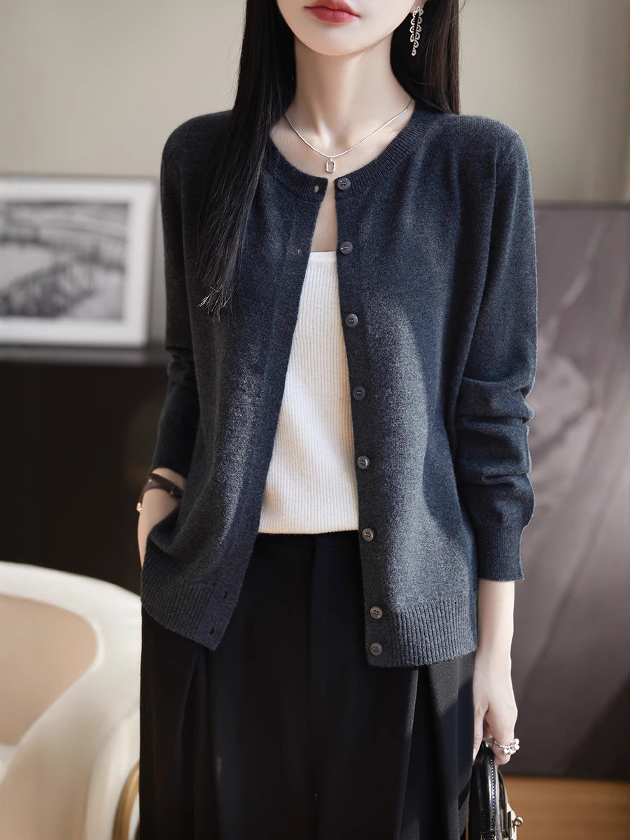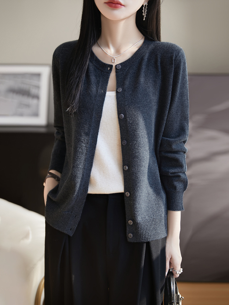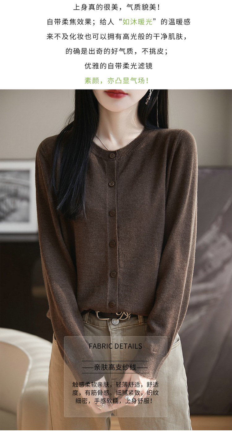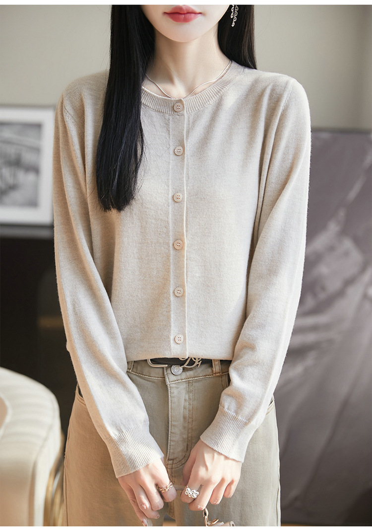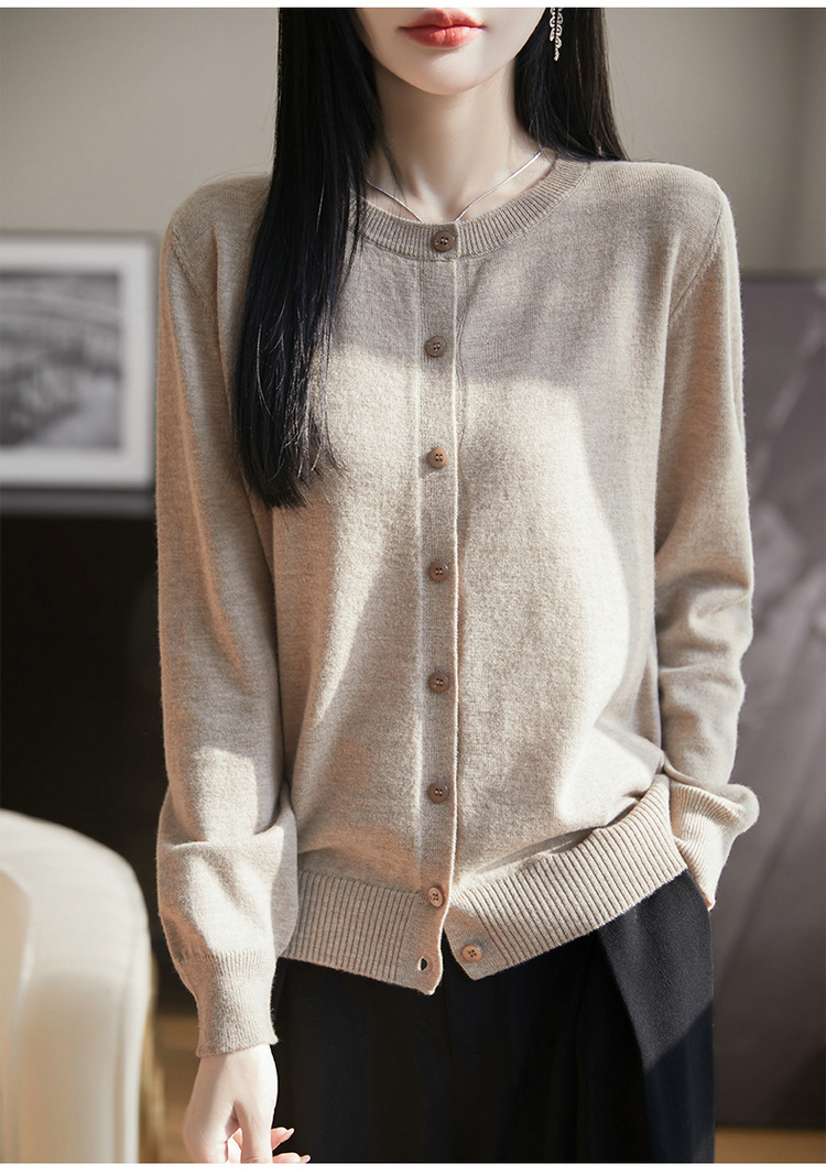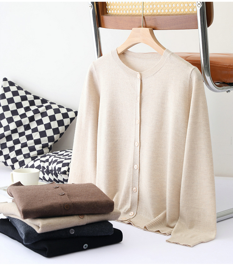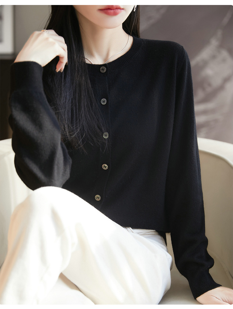 Тонкий кардиган из тонкой пряжи для ранней осени, свободный и стройнящий трикотажный жакет для весны и осени, 100% чистый шерстяной кардиган для женщин с круглым вырезом.