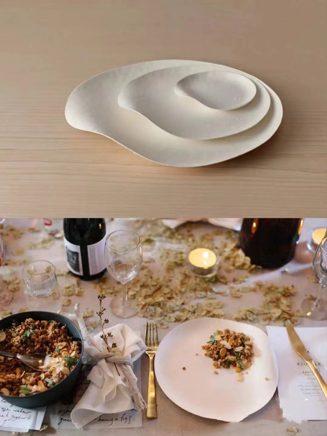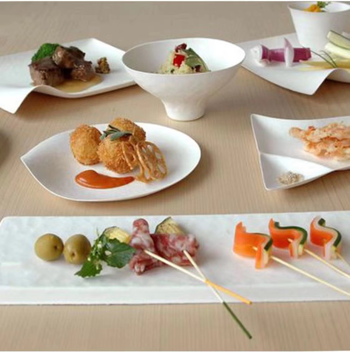 Чашка 350 мл.; Чашка 300 мл.; Медовая снежная миска на 350 мл.; Чашка 200 мл.; Чашка 160 мл.; Прямоугольная пластина; Квадратная деформированная кромковая пластина; Круглая деформированная кромковая пластина; треугольная пластина; миска