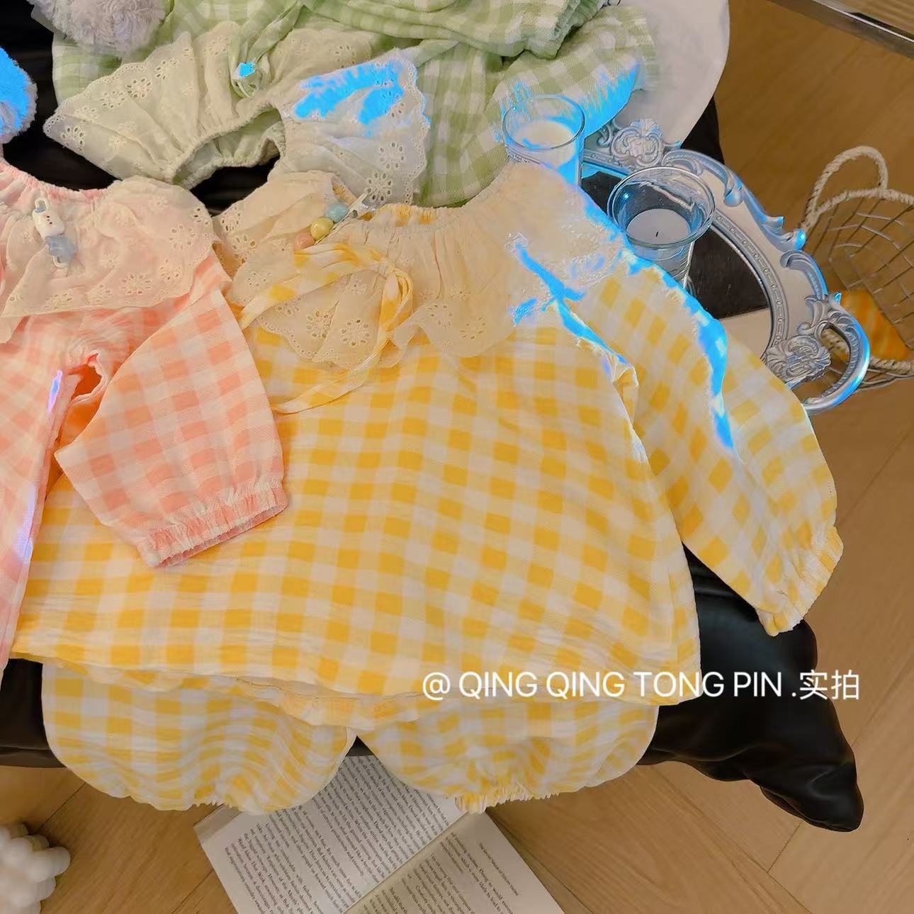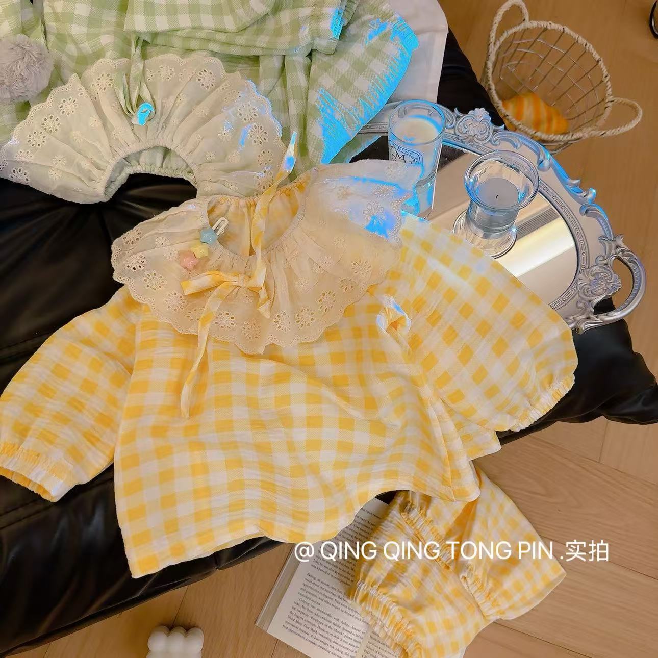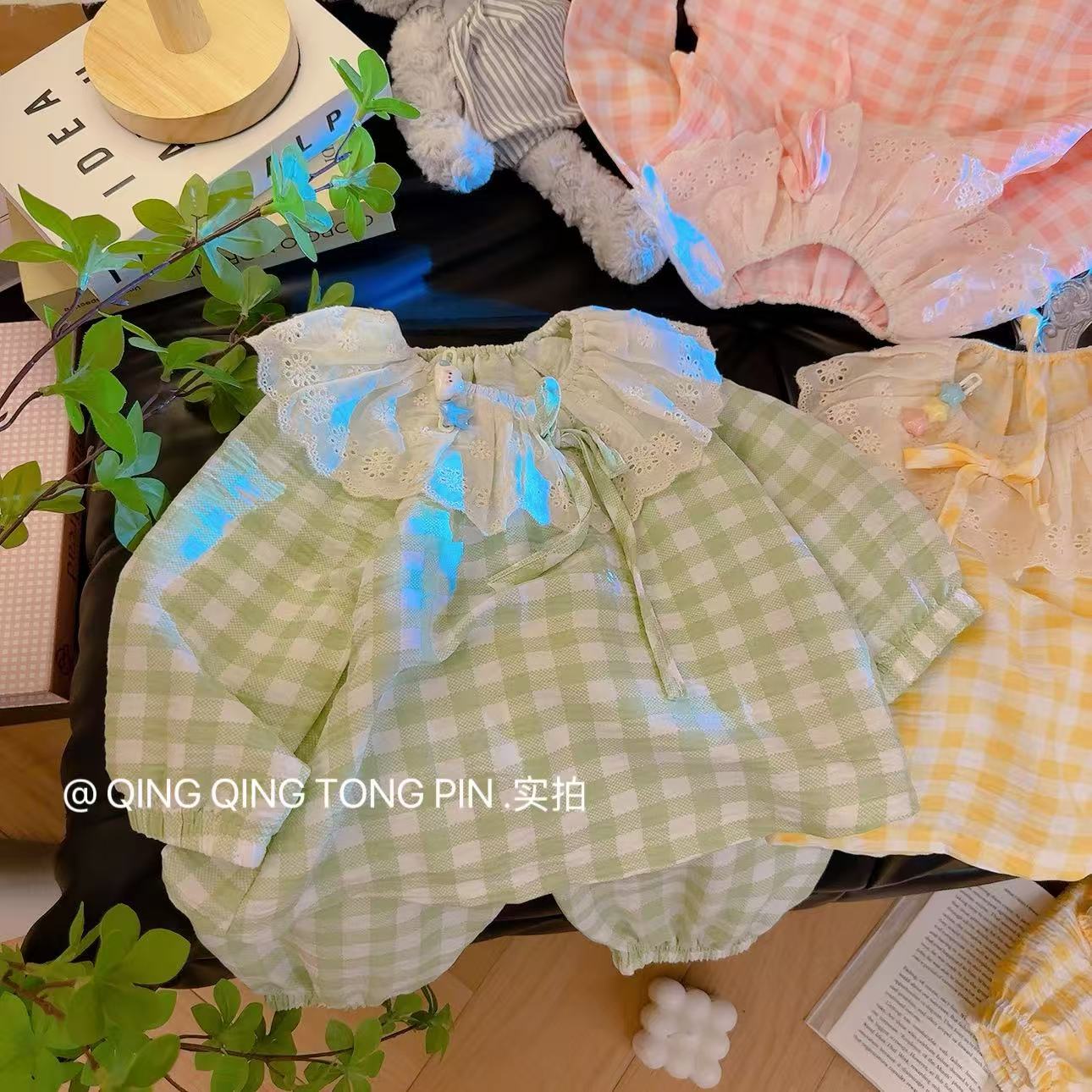 Кружевной клетчатый костюм-розовый; Кружевной клетчатый костюм-зеленый; Кружевной клетчатый костюм-желтый