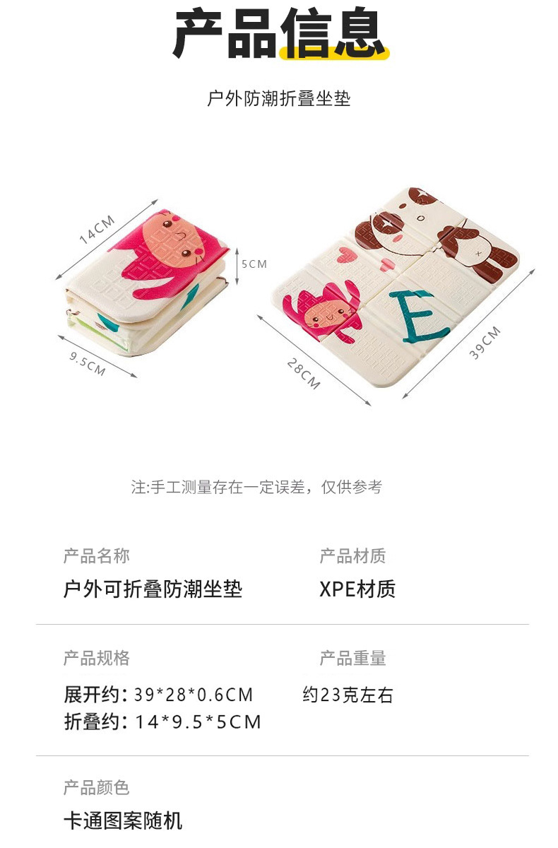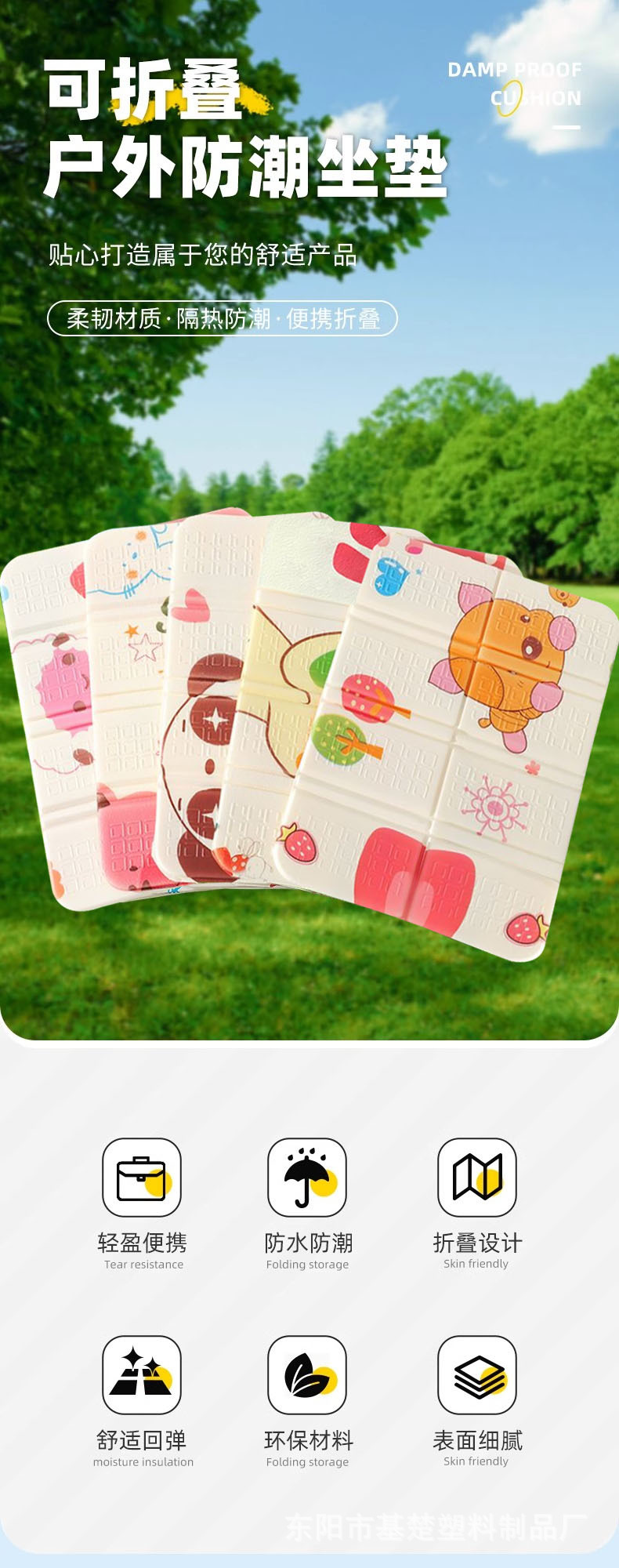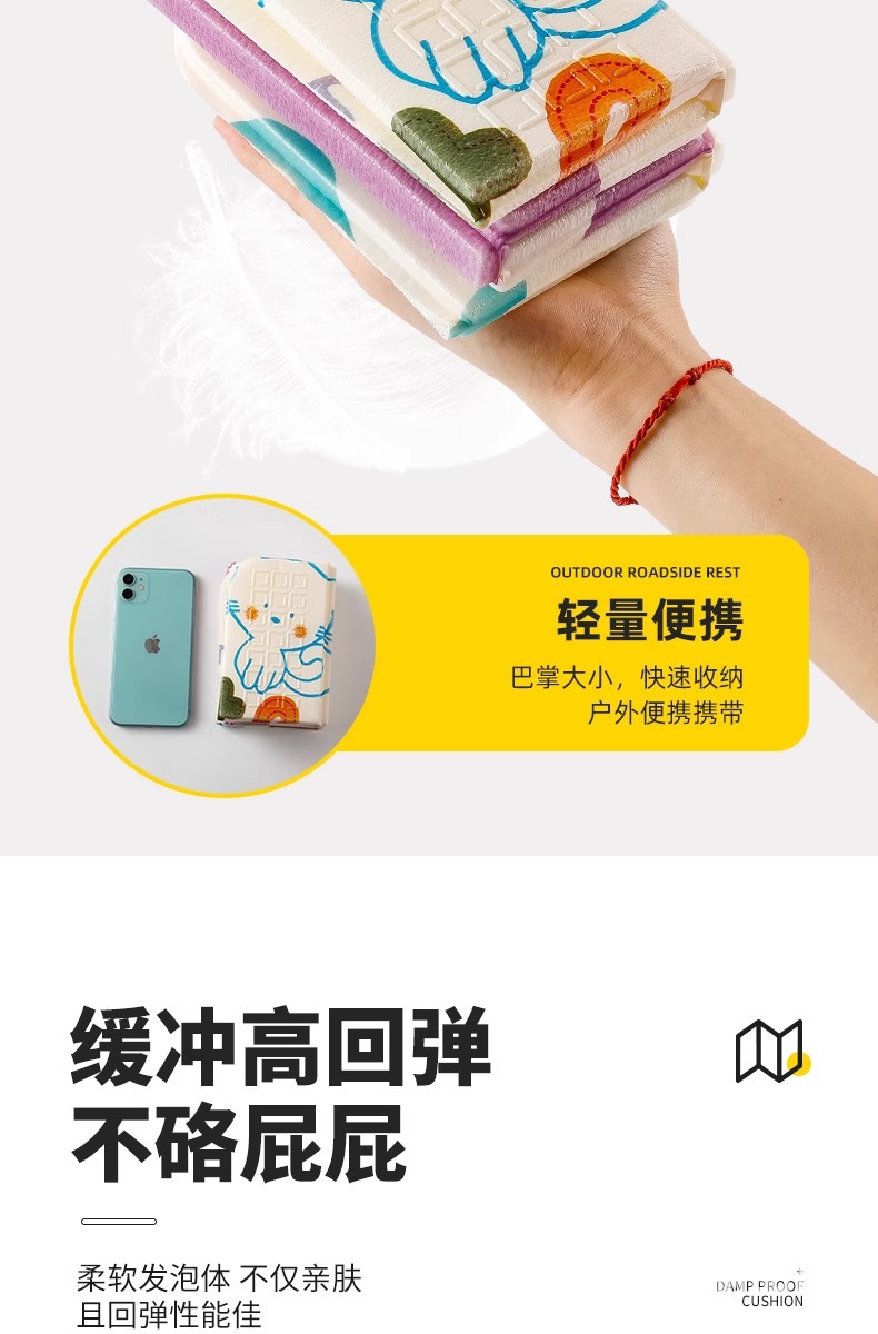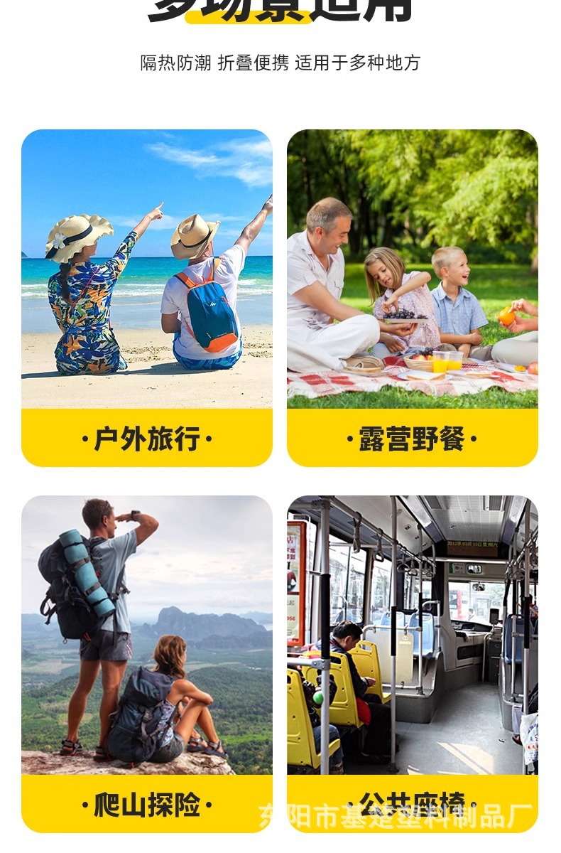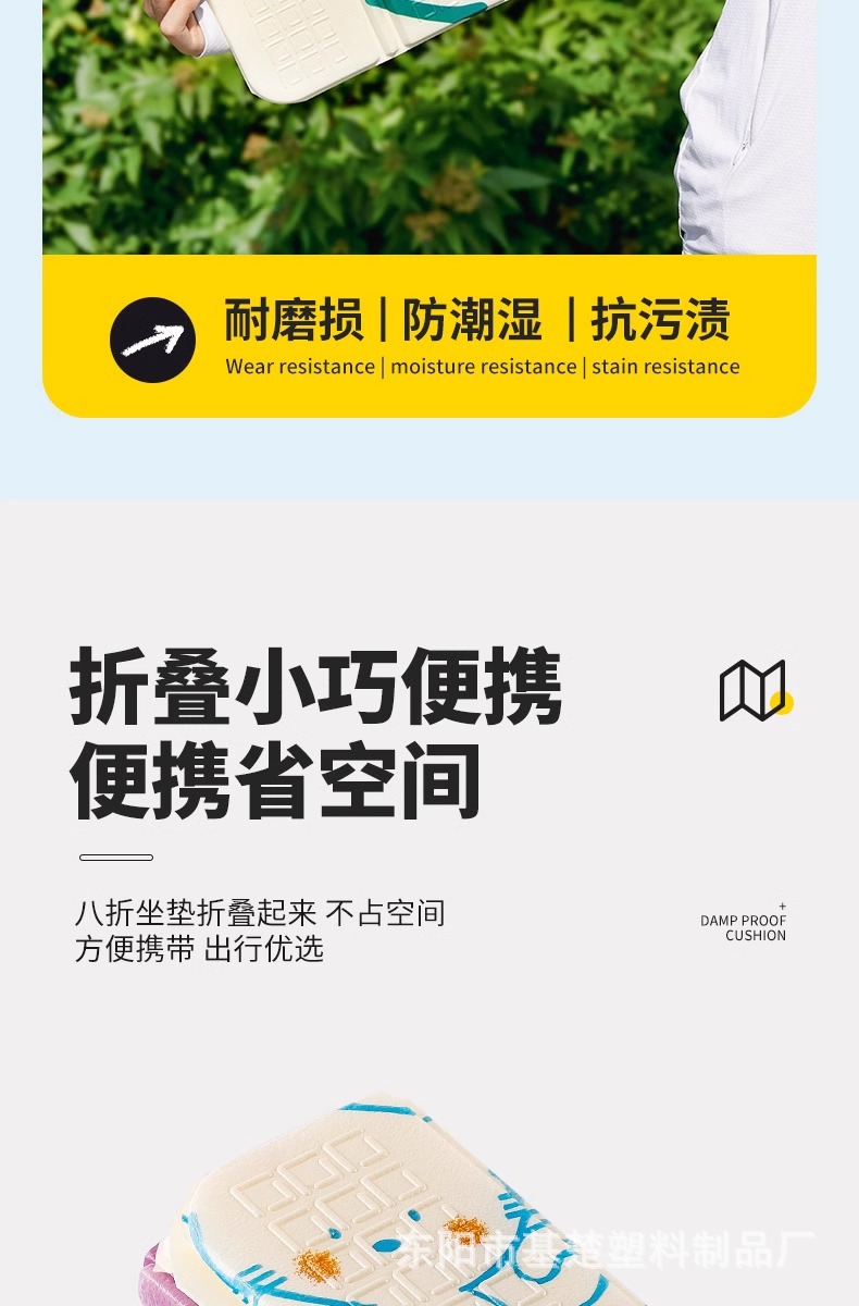 产品特点:经典款折叠八折小坐垫,XPE超轻环保材料,颜色多样,无异味,不掉色,皮实耐用;户外运动,休闲娱乐可随时携带;质量轻,体积小,老年人外出散步可随身携带。户外出行隔脏隔凉防潮防水,实在是出行的贴心小物件!