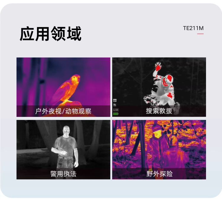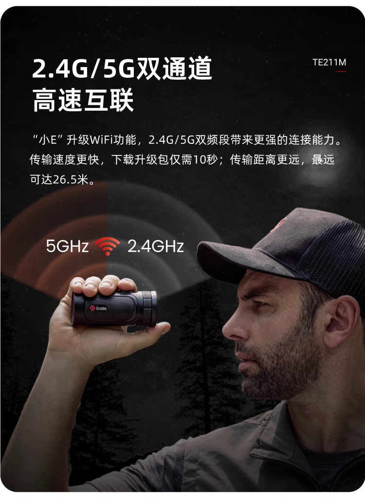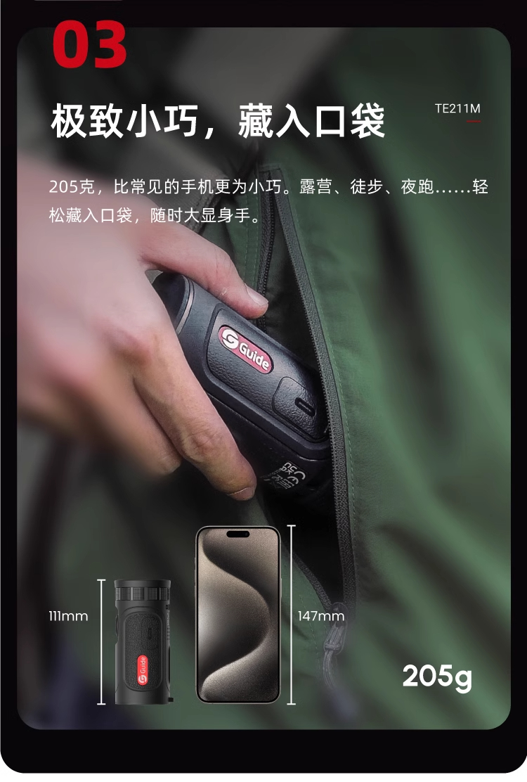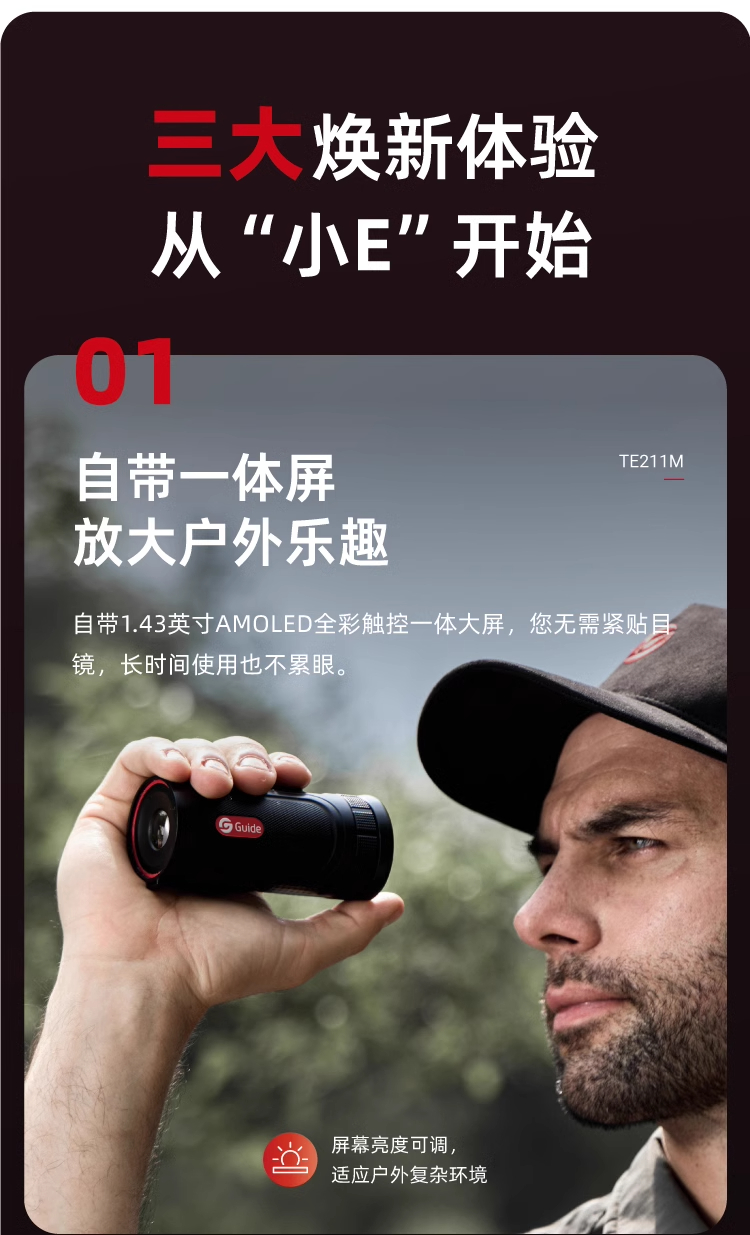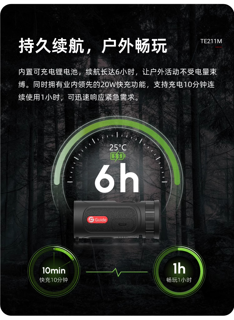 TE Mini单目手持红外望远镜,口袋里的夜视小能手。它配备256×192分辨率红外探测器和10mm红外镜头,探测距离可达130米。1.43英寸AMOLED全彩触控屏幕,一体化设计让您无需紧贴目镜,也能清晰地观察红外图像,长时间使用也不必担心眼睛疲劳。仅需充电10分钟,便可连续使用一小时,是您身边随时待命的理想伙伴。