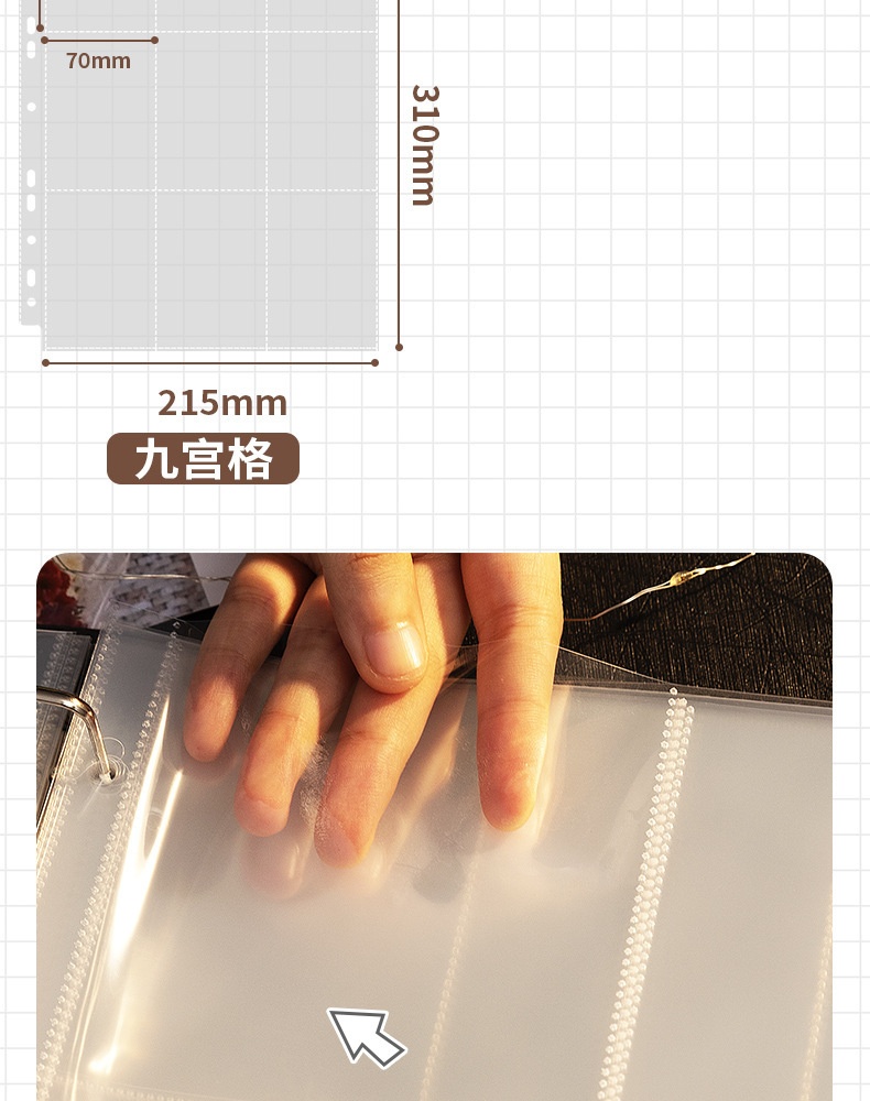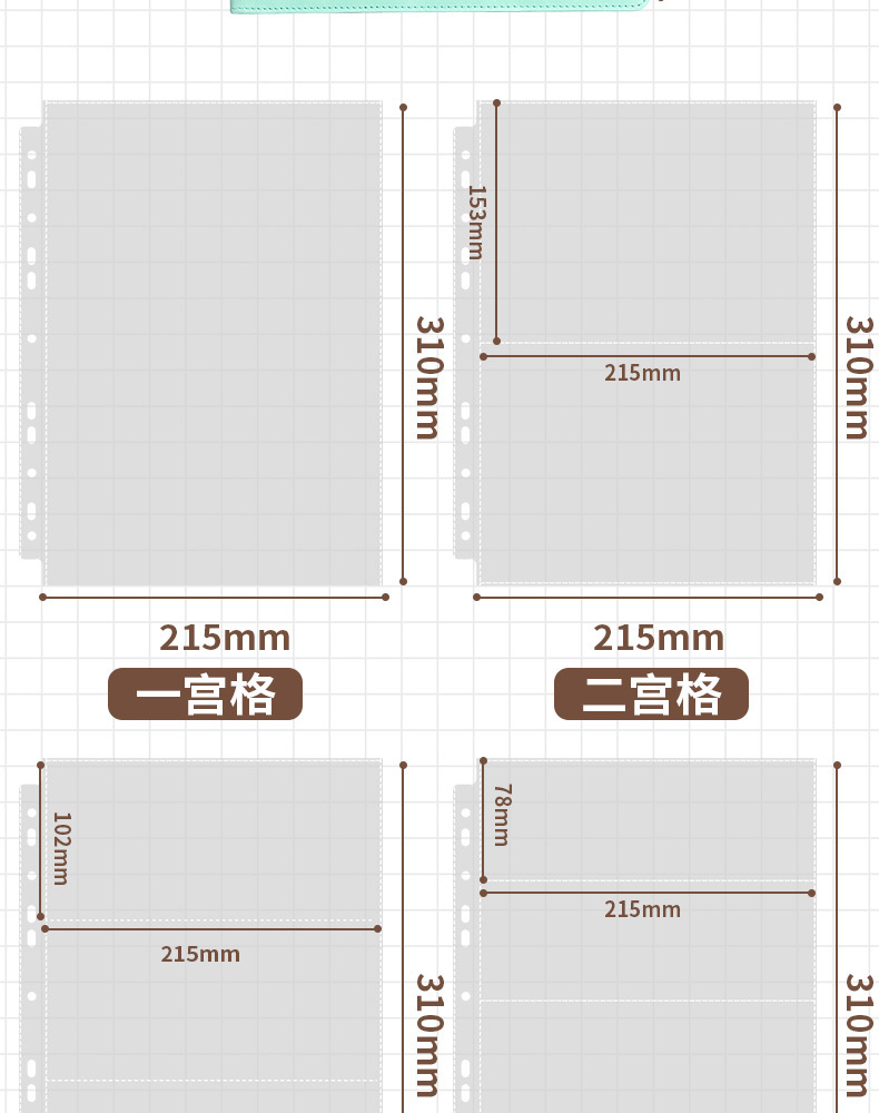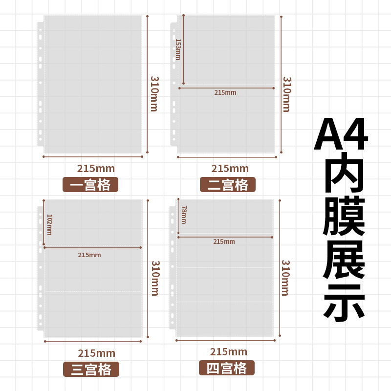 А4 10 сеток (вертикальная вставка); А4 сетка на два квадрата 10 листов; 10 листов А4 с трехквадратной сеткой.; А4 с четырехквадратной сеткой, 10 листов.; 10 шестиугольных сеток формата А4 (вставлены горизонтально); А4 с восьмиквадратной сеткой, 10 листов.; А4 с девятью квадратами, 10 листов.; 10 четырехквадратных сеток формата А4 (вертикальная вставка); Листовой лист А6 с 6 отверстиями [двустороннее хранилище для денег в одной рамке] вставная пленка * 25 листов; Квадрат с 6 отверстиями и вкладными листами [двусторонние два отделения для экономии денег] вставная пленка * 25 листов; Аксессуары-прозрачная вставка формата А4 с 4 отверстиями*40 листов; А5 с четырехквадратной сеткой, 25 листов.; Двусторонняя вставка с тремя отделениями формата А5, 6 отверстий*25 листов; Двусторонняя вставка с одной рамкой формата А5, 6 отверстий*25 листов; Пустая четырехквадратная сетка формата А5 с 6 отверстиями, вставка из пленки * 25 + 1 лист; Фотоальбом формата А5 с 6 отверстиями, черная вставка для карточек, пленка * 10 листов; А4 черное звездное небо (одинарный корпус); А4 желтый детский дыхание (одинарный корпус); А4 синее звездное небо (одинарный корпус); А4 зеленый дыхание ребенка (одинарный корпус); А4 фиолетовый дыхание ребенка (одинарный корпус)