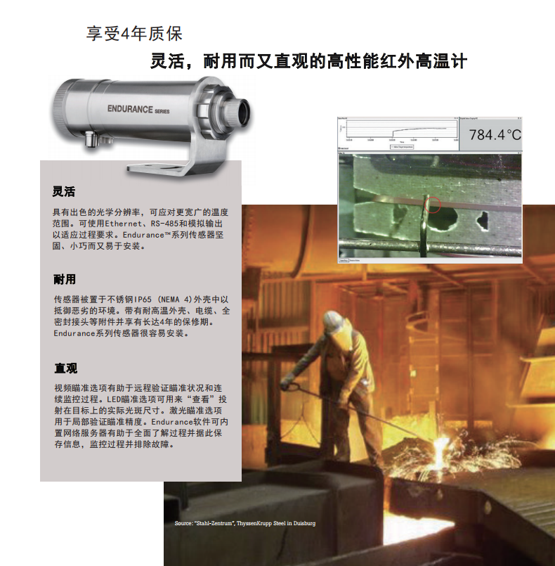 Endurance 系列低温和高温双色高温计满足所有现代工业生产需求:其灵活、安装简易;耐受苛刻的工业环境;可视化 - 允许您查看和好的理解您的过程温度数据。