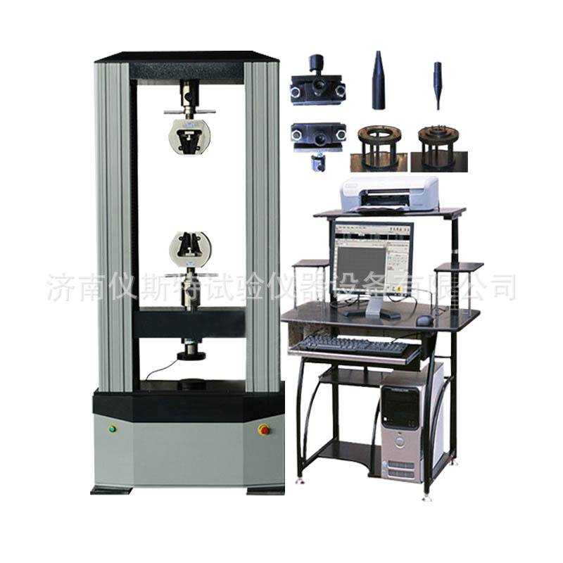 主机由上横梁、移动横梁与工作台通过立柱、滚珠丝杠连接成刚性台式框架结构,交流伺服电机及交流伺服调速系统安装在工作台下面,交流伺服电机通过同步齿型带减速机构驱动双滚珠丝杠旋转,从而带动移动横梁做上下移动以实现对试样加载。测力传感器安装在移动横梁的下部,用于测量试验力的大小;交流伺服电机内置位移测量系统,用于测量试样的位移量,也可近似代替试样的变形量。
