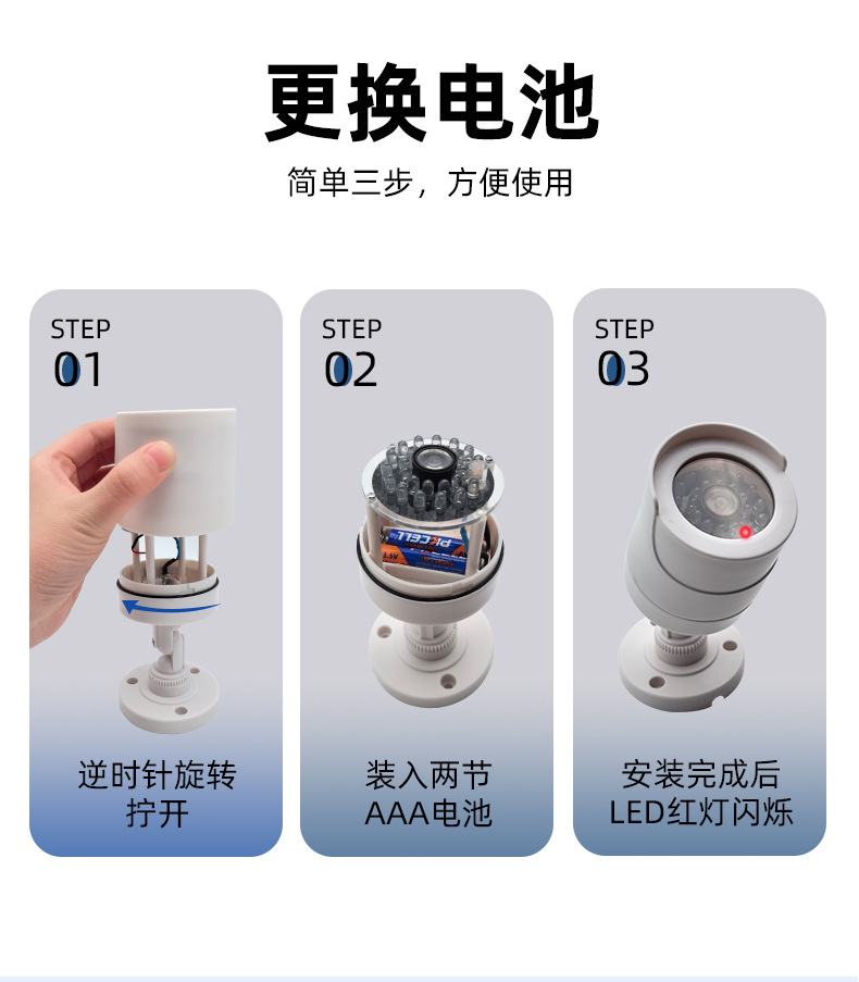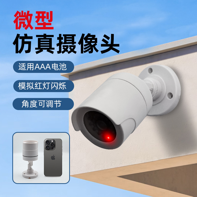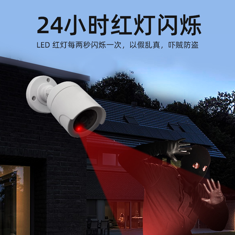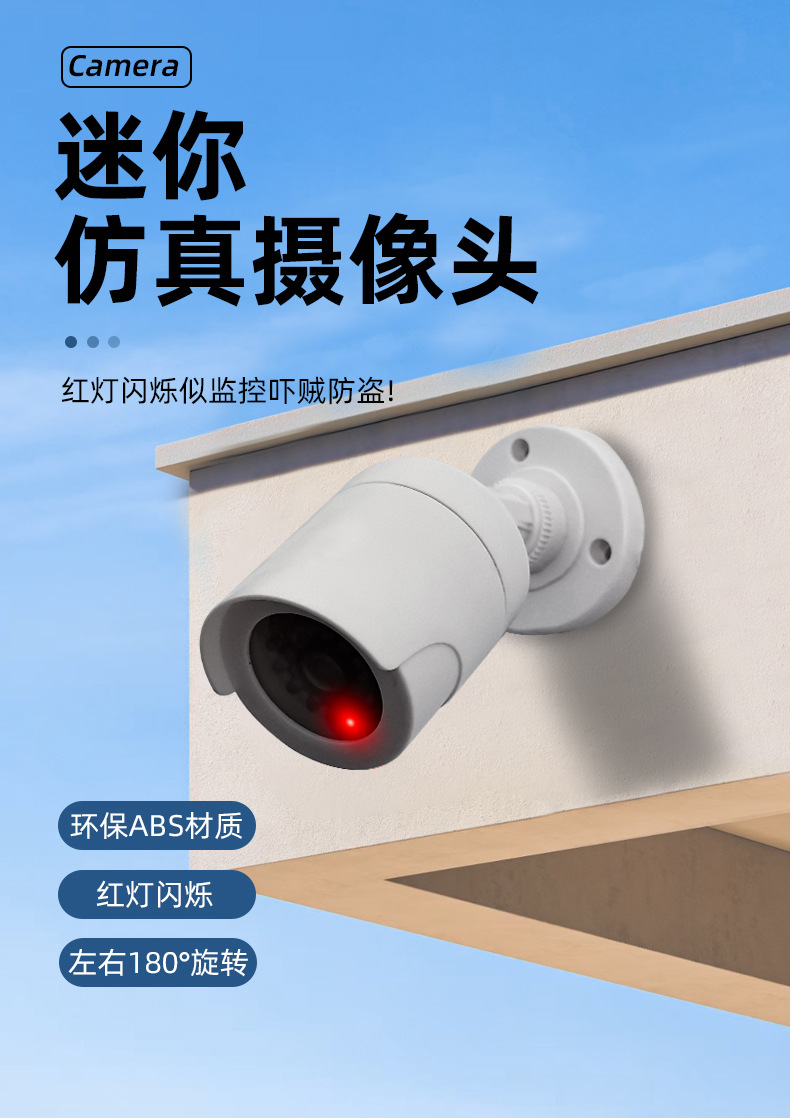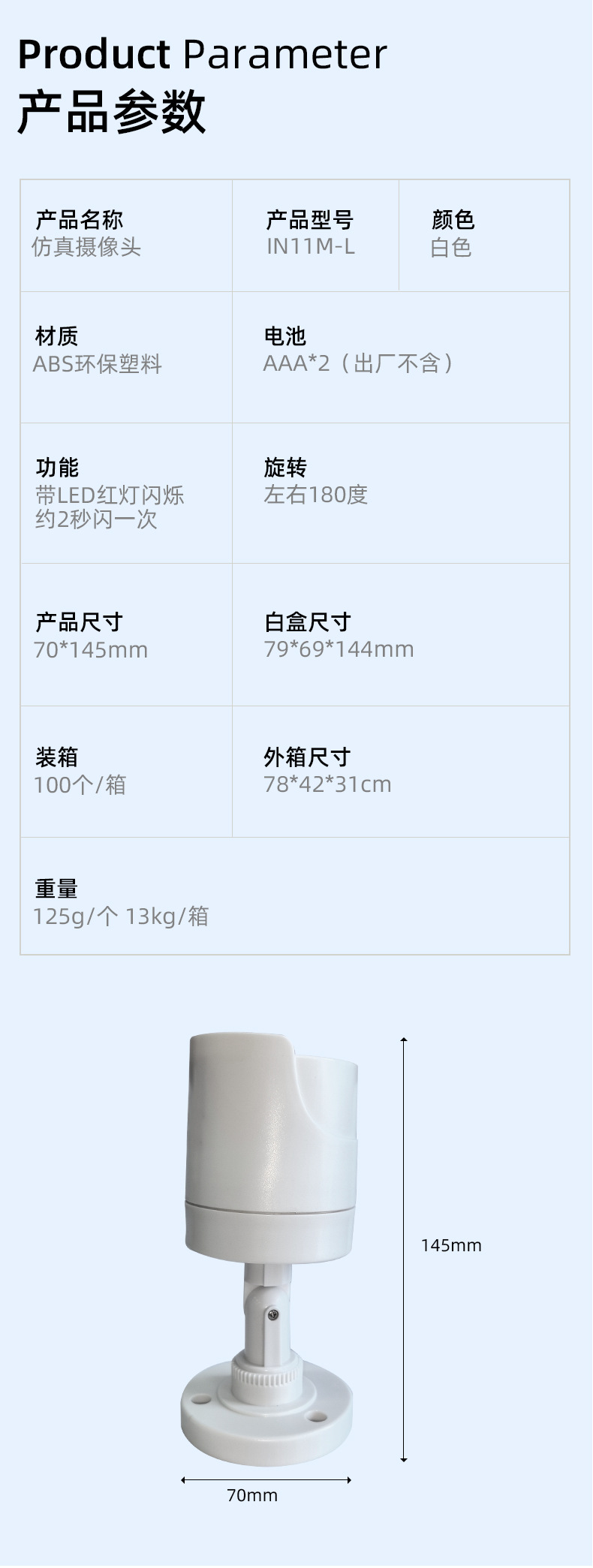 品名:仿真摄像头 材质:ABS塑料 电源:AAA*2(不含) 旋转:左右180度 功能:带LED红灯闪烁,约2秒闪一次