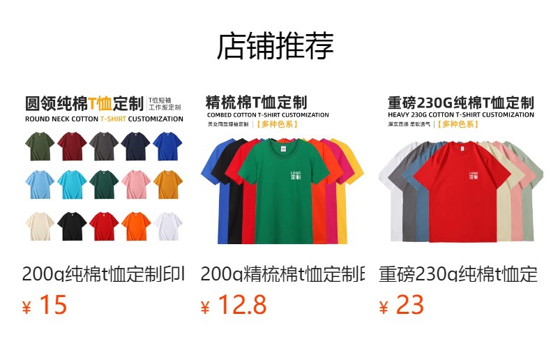 Быстросохнущая спортивная рубашка (спортивная футболка 140 г) 4,5 юаня.; Толстовка из полиэстера и хлопка (плечо 180 г) 8,8 юаней.; Чесаный хлопок (плечо 180 г) 12,8 юаней.; Чесаный чистый хлопок (плечо 180 г) 15 юаней.; Постиранный мягкий хлопок (200 г, слегка упал) 17 юаней.; Высококачественный хлопок, похожий на облако (плечо 210 г), 19 юаней.; Тяжелые маленькие опущенные плечи (230 г слегка опущены) 21 юань; Хлопок Odell ледяной фарфор (плечо 190 г) 22 юаня; Тяжелые рукава средней длины (260 г, слегка упали) 23 юаня.; 7А Антибактериальный Салона (плечо 220 г) 26 юаней