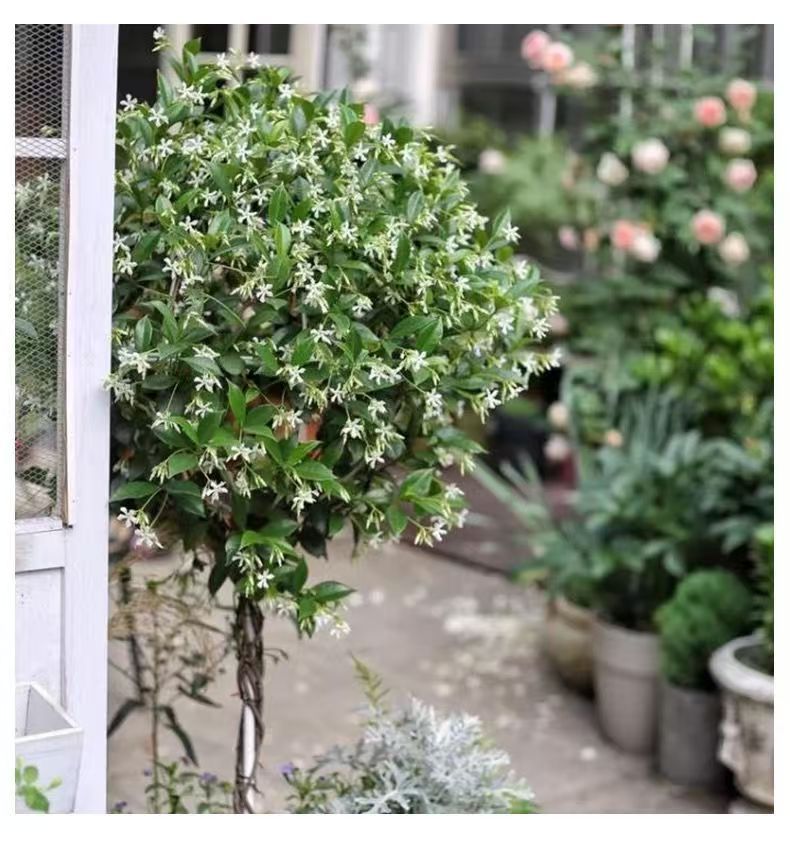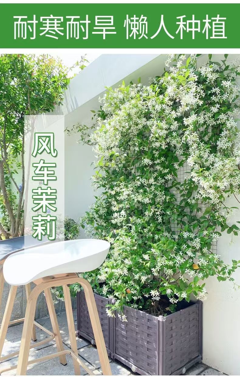 Ветряная мельница в горшках жасмина большие саженцы, лоза, свисает из виноградной лозы, цветочные растения, балкон, двор, цветущий и морозостойкий