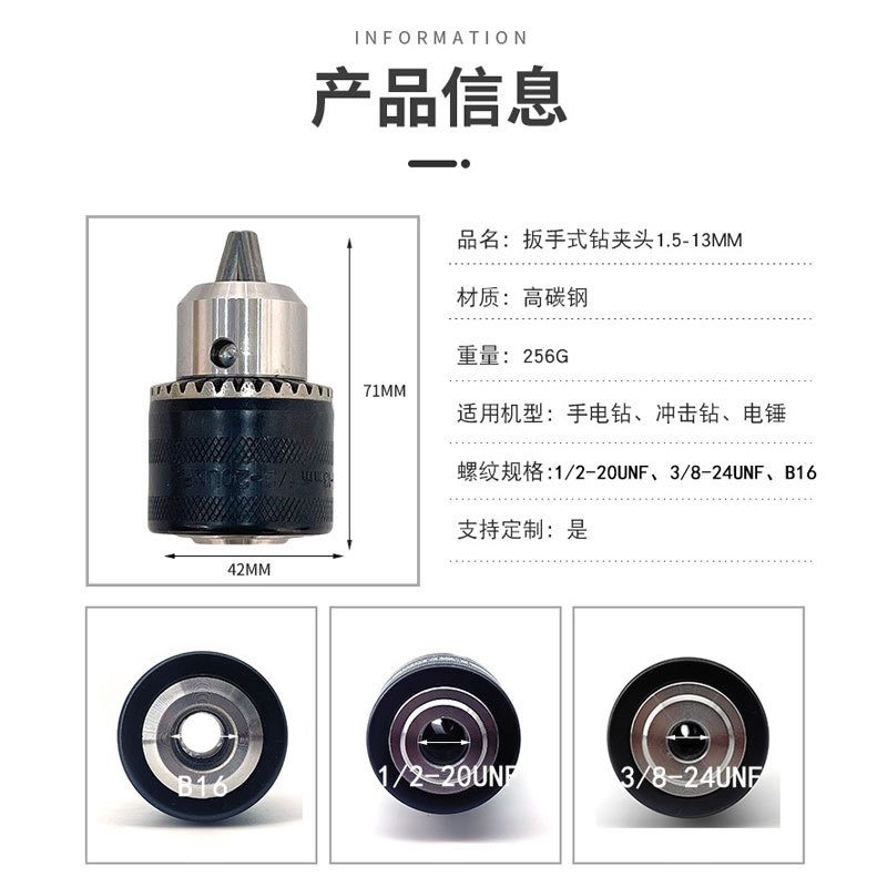 Сверлильный патрон 1/2-20UNF 1,5-13 мм; Сверлильный патрон 3/8-24UNF 1,5-13 мм; Сверлильный патрон B16 1,5-13 мм.; 1,5-13 мм 1/2-20UNF сверлильный патрон цветная коробка; 1,5-13 мм 3/8-24UNF сверлильный патрон цветная коробка; Цветная коробка сверлильного патрона B16 1,5-13 мм; Сверлильный патрон 1,5-13 мм, 2 пузырчатых коробки; Сверлильный патрон 1,5-13 мм, пузырчатая коробка из 3 шт.; Сверлильный патрон 1,5-13 мм, 3 пузырчатая коробка (маленький размер); Сверлильный патрон 1,5–13 мм + цветная коробка с круглой ручкой SDS; Сверлильный патрон 1,5-13 мм + цветная коробка с шестигранными насадками; Сверлильный патрон 1,5-13 мм + цветная коробка с квадратной ручкой; Сверлильный патрон 1,5-13 мм, 6 шт.