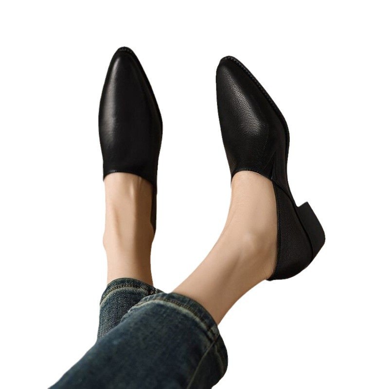 Элегантные женские туфли с неглубоким вырезом, новая модель весна 2025, на массивном каблуке, с острым носком, ретро-стиль, кожаные, без застежек, на среднем каблуке.
