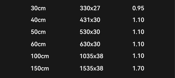 15cm; 20cm; 30cm; 40cm; 50cm; 60cm; 100cm; 150cm