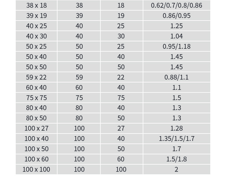 20x10 (толщина 0,6 мм); 4 слота 24x14 (толщина 0,6 мм); 25х16 (толщина 0,95 мм); 30x15 (толщина 0,66 мм); 6-точечная канавка 39x19 (толщина 0,86 мм); 40х25 (толщина 1,25 мм); 50х25 (толщина 0,98 мм); 8-точечная канавка 59x22 (толщина 0,88 мм); 60х40 (толщина 1,1 мм); 80х40 (толщина 1,3 мм); 80х50 (толщина 1,3 мм); 100х27 (толщина 1,28 мм); 100х40 (толщина 1,35 мм); 100х50 (толщина 1,7 мм); 100х60 (толщина 1,5 мм)