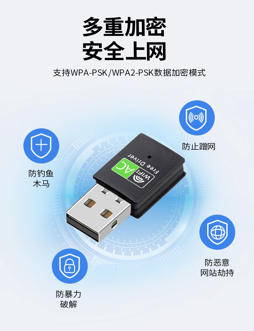 支持 WPA、WPA2 安全机制,支持WPA/WPA2/WEP/802.1X/WMM数据加密,能够为无线网络连接提供安全保障。
