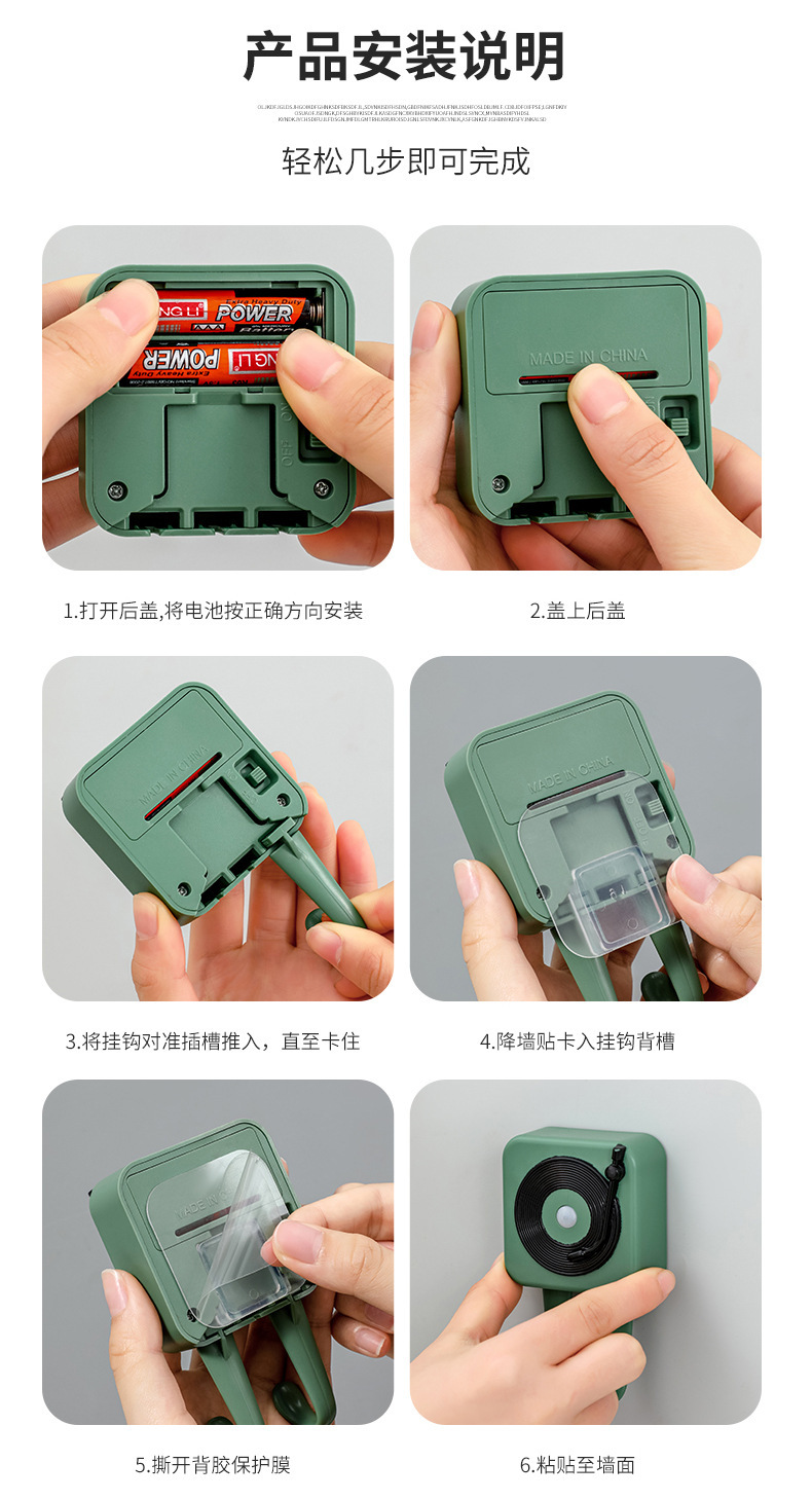 装入2节1.5v“AAA”规格电池,打开开关便可使用。搭配无痕贴。