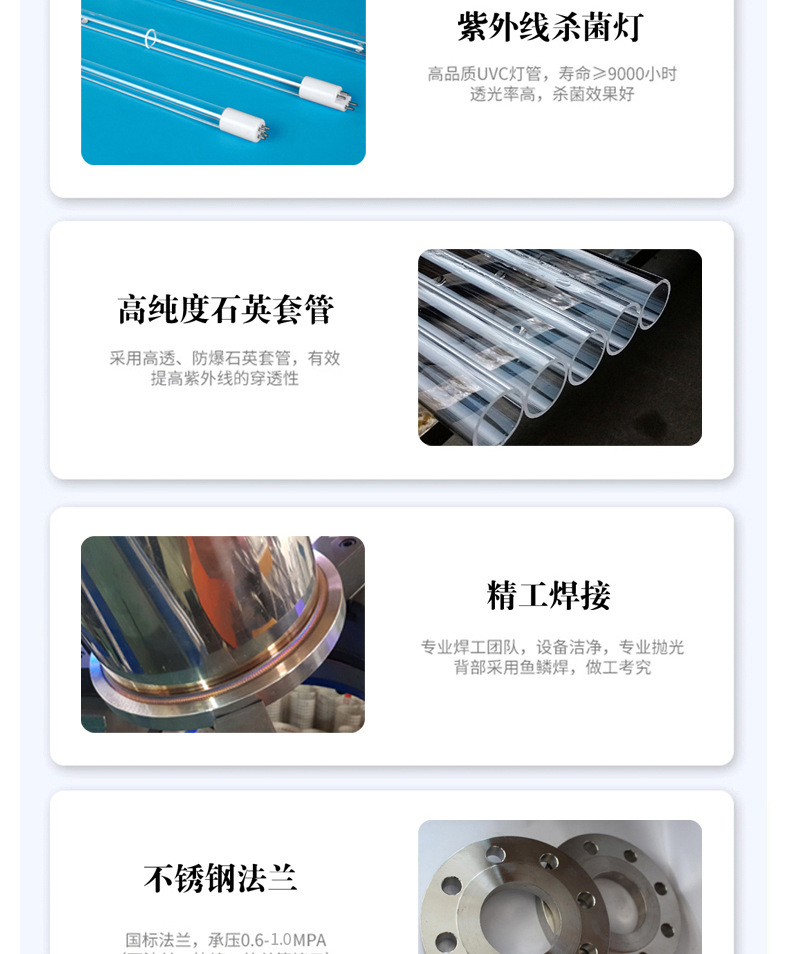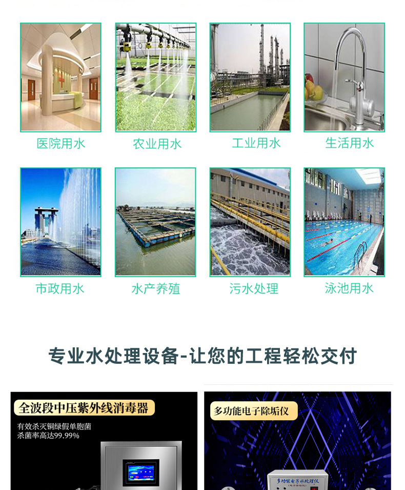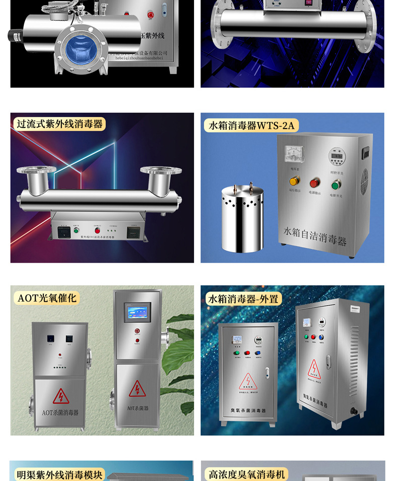 Объем обрабатывающей воды 25 Вт, 1,4 м³; Мощность очистки воды 55 Вт, 2,5 м³.; 85 Вт обрабатывает 3-5 тонн воды в час; 170 Вт обрабатывает 10-15 тонн воды в час.; 255 Вт обрабатывает 20-22 тонны воды в час.; 340 Вт обрабатывает 25-30 тонн воды в час.; 425 Вт обрабатывает 35-40 тонн воды в час.; 510 Вт обрабатывает 40-45 тонн воды в час.; Мощность очистки воды 595 Вт, 45-50 тонн в час.; Объем очистки воды 680 Вт 55-60 тонн в час; 765 Вт обрабатывает 65-67 тонн воды в час.; 850 Вт обрабатывает 70-75 тонн воды в час.; 1500 Вт 140 тонн очистки воды в час; 2170 Вт 200 тонн очистки воды в час; Сплит самоочищающееся оборудование мощностью 1000 Вт.; УФ-стерилизатор среднего давления; Модуль дезинфекции дренажной рамы с открытым каналом